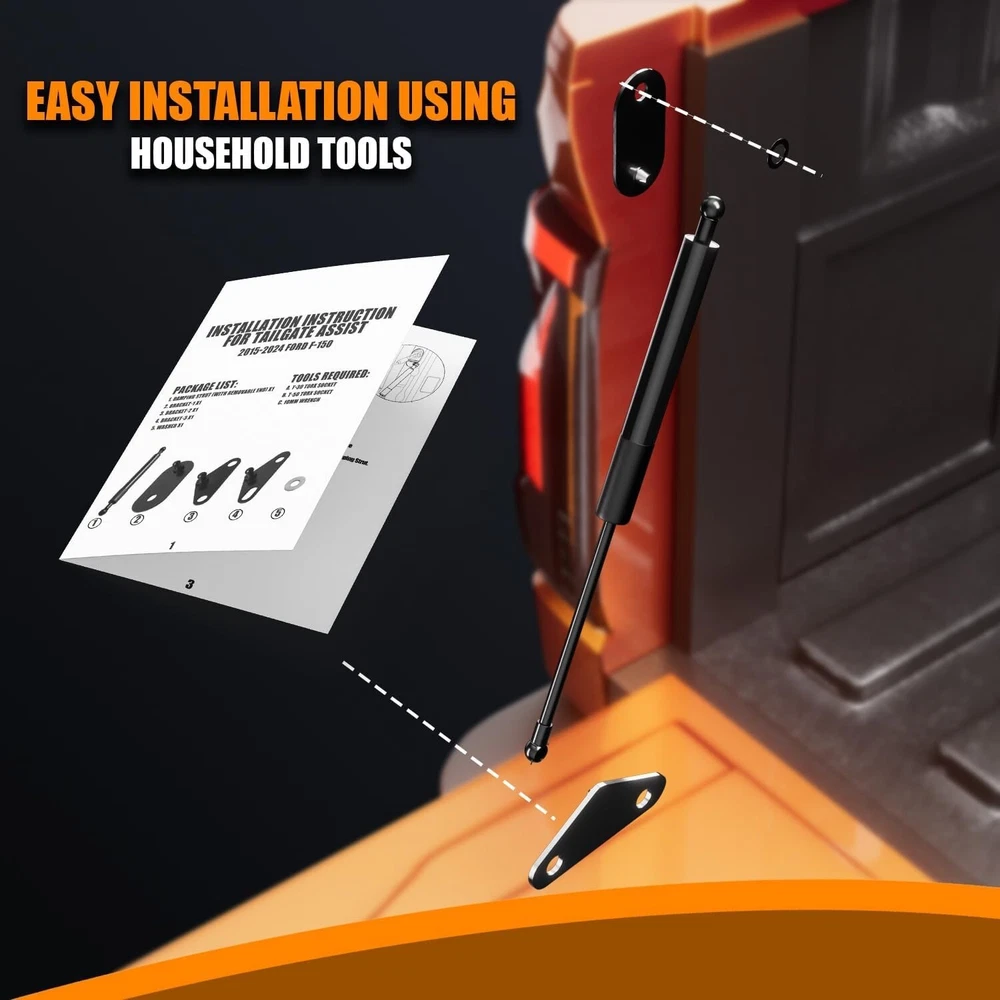 Please check the fit first with the ConfirmedFit tool! These tailgate assist kits fit 2015 2016 2017 2018 2019 2020 2021 2022 2023 2024 Ford F-150, EXCLUDE Raptor and Tremor Trim! Stress-Free Operation: TMS Tailgate Assist Kit can prevent cable damage and wear with the controlled descent provided by this tailgate shock, reducing strain on the tailgate hinge. Long-Lasting Durability: Constructed from premium materials, TMS tailgate assist is built to withstand harsh weather and heavy use in your truck bed. Quick Installation: Install TMS tailgate damper within minutes using basic tools. No need to drill or modify your truck bed accessories. Safe and Reliable: Designed to safely control the drop of your truck tailgate, TMS tailgate lift assist makes opening and closing your truck tailgate smooth and controlled. This assist kit prevents sudden drops that could damage your truck bed.