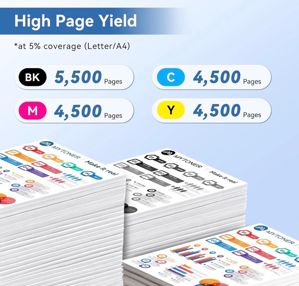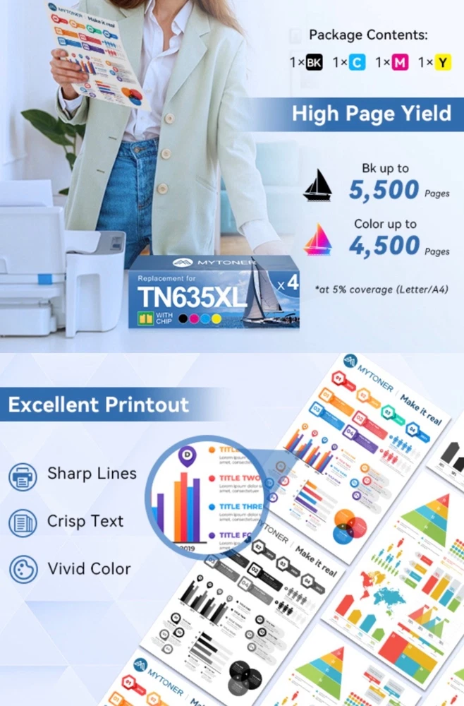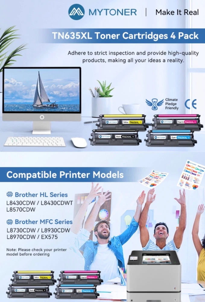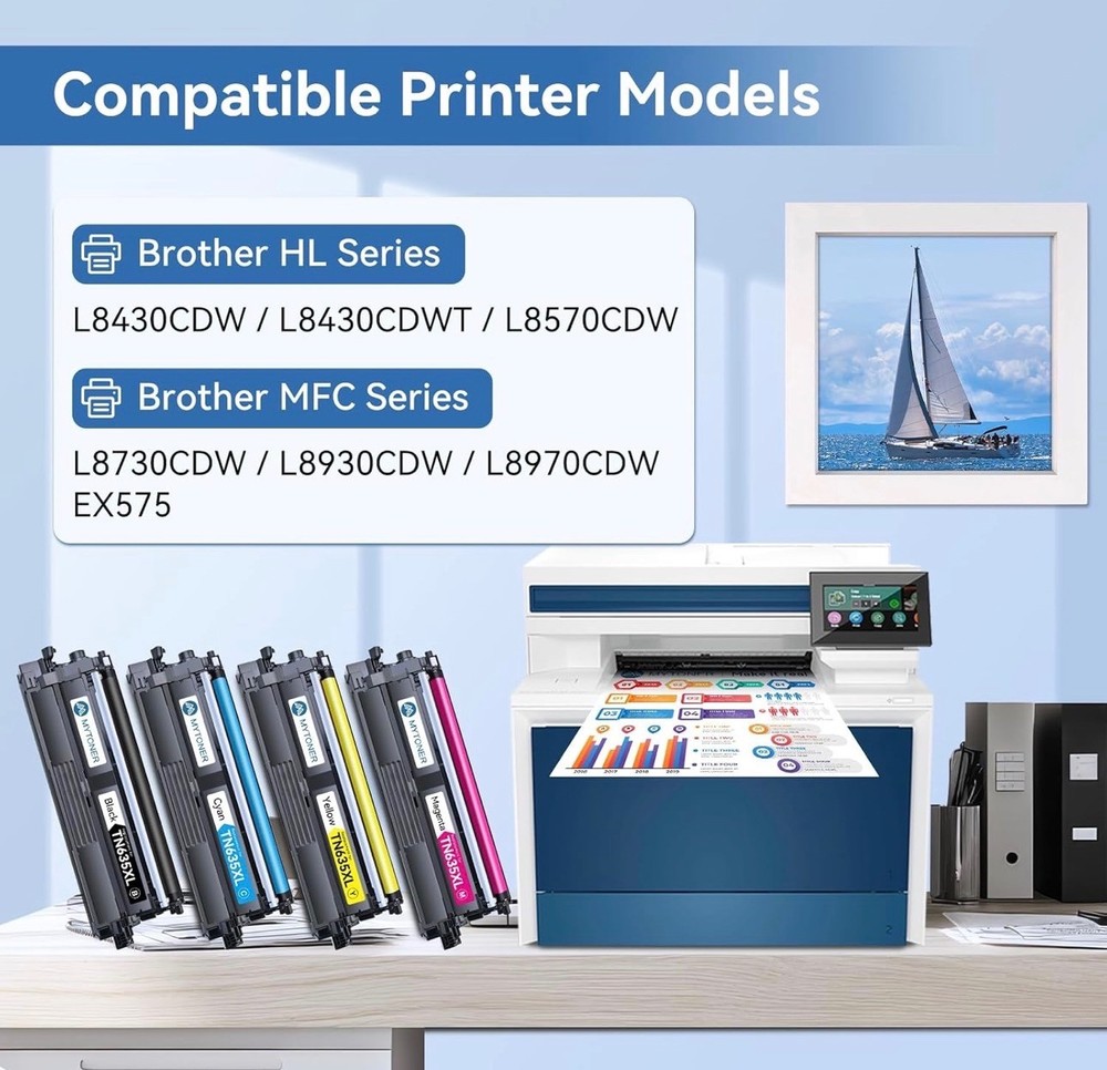 #3561 MYTONER Compatible Toner Cartridge Replacement for Brother TN635XL TN-635XL TN635 for HL-L8430CDW HL-L8430CDWT HL-L8570CDW MFC-L8730CDW MFC-L8930CDW MFC-L8970CDW MFC-EX575 Printer (4 Pack, B/C/M/Y) Brand MYTONER Color TN635XL Toner Cartridge Black Cyan Yellow Magenta Included Components Toner Cartridge Compatible Devices Work for HL-L8430CDW, HL-L8430CDWT, HL-L8570CDW, MFC-L8730CDW, MFC-L8930CDW, MFC-L8970CDW, MFC-EX575 Compatibility Options Compatible with HL-L8430CDW, HL-L8430CDWT, HL-L8570CDW, MFC-L8730CDW, MFC-L8930CDW, MFC-L8970CDW, MFC-EX575 Page Yield 5500 [Compatible Model]: HL-L8430CDW, HL-L8430CDWT, HL-L8570CDW, MFC-L8730CDW, MFC-L8930CDW, MFC-L8970CDW, MFC-EX575 [High Page Yield]: Up to 5,500 pages for TN635XL TN635 black toner cartridge, Up to 4 ,500 pages for TN635XL TN-635XL color toner cartridges (at 5% coverage - letter/A4) [What’s in the box]: 1 x TN635XL TN-635XL black toner; 1 x TN635XL TN-635XL cyan toner; 1 x TN635XL TN-635XL yellow toner; 1 x TN635XL TN-635XL magenta toner [Replacement Model]: MYTONER TN635XL TN-635XL TN635 toner compatible with Brother TN635XL TN-635XL TN635 for printer [Print Quality]: MYTONER TN635XL TN-635XL TN635 toner cartridges produce clear and long-lasting prints with sharp text and vibrant colors, and are engineered to maintain consistent print quality throughout their lifespan, ensuring that your prints look great from the first page to the last What's in the box Toner Cartridge