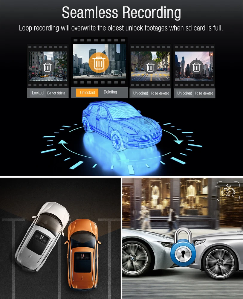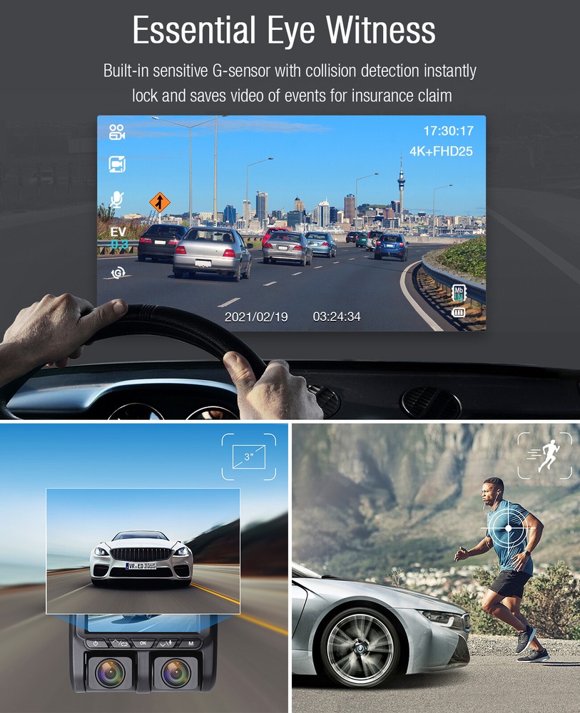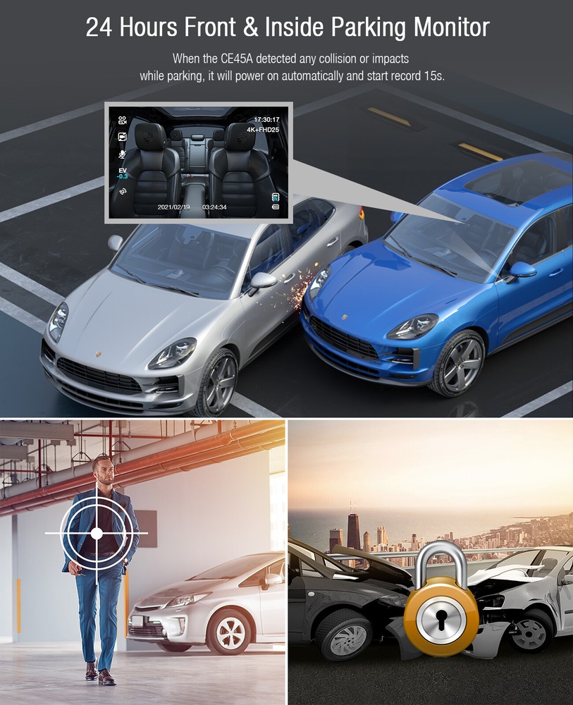 You may also like TOGUARD Dual Dash Cam 1080P+1080P Front and Inside Car Driving Camera 64GB Card 52.69 USD Free shipping TOGUARD 4K Dual Dash Cam UHD 2160P+1080P Front Rear Car DVR Camera night vision 67.59 USD Free shipping TOGUARD 12" Mirror Dash Cam 4K GPS Backup Camera Front and Rearview DVR Recorder 79.29 USD Free shipping TOGUARD 3 Channel 4K GPS Dash Cam Car Recorder Camera Night Vision G-Sensor 69.41 USD Free shipping 9"2.5K Dash Cam Car Stereo Radio Wireless Apple Carplay&Android Auto+Rear Camera 89.21 USD Free shipping TOGUARD Dual Lens 4K Dash Cam Front Rear Car Video Camera Night Vision G-sensor 49.29 USD Free shipping TOGUARD Uber Dual Dash Cam Full HD 4K+1080P Inside and Outside Car Camera Dash Cams 3" LCD 340° Dashboard Camera with G-Sensor, WDR, Parking Monitor, Motion Detection for Truck Car Taxi US STOCK! FAST DELIVERY! FAST RECEIVED!!! Product Description: TOGUARD BRAND - Monitor What You Concern Trusted by over Millions of homes and businesses since our establishment in 2009, TOGUARD is an industry leader in Home and Personal Security Monitoring Technology. Whether you need to guard your safety and car, record moments while driving, or keep an eye on car when you leave car, TOGUARD is here to help. Key words: 【 Dual 4K+ 1080P Dash Camera with Audio for Uber TruckTaxi 】Front Camera Resolution: 4K 3840*2160@25fps and Backup Camera: FHD 1920*1080P@25fps, front and cabin in-car dash cameras with Advanced Sony Exmor IMX323 sensor simultaneously record the road and inside the car, which provide sharp high quality video/picture. Dual lens dash cams provide powerful evidence in case you have an accident and single lens can record 2160P UHD video, capturing license plates clear. 【 340° Wide angle & 360° Rotatable Cameras 】Based on the each 180° rotatable dual dash camera, it is more convenient and user friendly for you to adjust the angel. The two 170° wide angle lens captures the whole road and license plates of other cars in front of you from the edges of your windscreen, and recording what is happening in the cabin simultaneously during the day and night. Perfect dual lens dash cams for car, cab driver, taxis, Uber and so on. 【 24 Hours Parking Monitor & Motion Detection 】Triggered by the parking monitor and motion detection, the dual dash cams will automatically turn itself on and starts recording when it detects motion in front of your car or someone crashes your car while it is parked. Excellent audio recording with built in microphone can provide perfect proof if someone damages your car and gives you peace of mind after you left your car. 【 Continuous Loop Recording & G-Sensor 】Seamless loop recording will automatically overwrites the oldest footage and replacing it with the new videos, so there's no need to worry about your memory card running out of storage space. The G-sensor(smart record emergency lock system) is a great feature that if any sudden braking or bumps caused an accident the footage will get locked and saved. This can be used as evidence and insurance claim during car accidents. 【 Super IR Night Vision & WDR & Reliable Service 】The driving recorder with Sony IMX323 sensor, f/2.0 aperture and WDR (Wide Dynamic Range) funtion ensures the clarity of images or videos. You can easy to obtain sharp images and videos even in low-light environments. Also, we support 30 days money back and 12 months warranty, professional after-sale service, you questions will be replied within 24 hours. Warm tips: 1.The built-in battery is very small for safety reasons, not designed to work alone, so please keep it connected to external power supply. 2.We recommend to buy Class 10 or above high speed Genuine Micro-SD card at Amazon's Own or Branded Stores, capacity 32GB. ( SD card not include in the package .) 3.Please f ormat the micro-SD card before the first time use. Format the SD card regularly to prevent “card error” problem. 4.We recommend to use our brand DC5V/2.1A car charger and please don't use car charger below DC5V/2A. Front 4K 3840*2160@25fps Backup Camera: FHD 1920*1080P@25fps front and cabin in-car dash cameras with Advanced Sony Exmor IMX323 sensor simultaneously record the road and inside the car, which provide sharp high quality video/picture. Seamless Loop Recording Auto power on and record while car engine started. Loop Recording will overwrite the oldest footage with the newest one when the memory card approaches to its maximum capacity to get efficient storage management. Dual 170° Lens The 170°wide angle lens front camera captures the whole road and license plates in front of you from the edges of your windscreen, and the 170°inside camera enhances in car at super low light environment. G-Sensor The sensibility adjustable G-sensor(smart record emergency lock system) is a great feature any sudden braking or bumps which is very useful in the event of an accident the footage will get locked and saved. Lens Exchange Turn on to switch A / B Lens Direction. As default, The A lens is facing backward,used to record inside of the car; The B lens is facing forward,used to record outside of the car, cover the road. If you want to switch the direction, you need to manually switch the lens direction, and then turn on Lens Exchange to correct the image direction. Parking Monitor It is used to protect your car after parking. With this function on, after you stop the car and the camera turns off, it stays in standby, when camera detects significant shock, it will automatically turn on and take a short video, then turn off automatically. Motion Detection Turn it on automatically and record when it detects any motion. Note: Please do not turn on motion detection features while driving, this function may make recording intermittent. WDR Wide Dynamic Range: turn on to optimize video quality with wider light range and image details. Package Included: 1x TOGUARD CE45A Dual Dash Cam 1x 3.5m Car Charger 1x Suction Cup Mount 1x 3M Adhesive Sticke