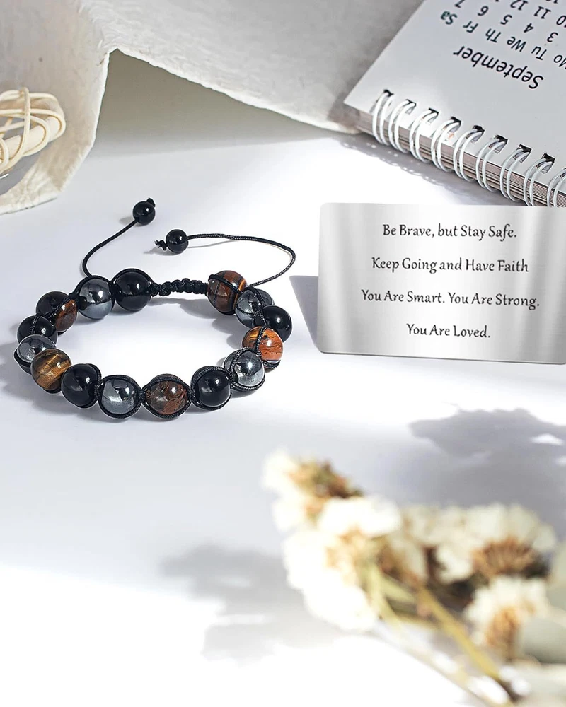 TOLOWOBK Mens Bracelet Gifts Tiger Eye Bracelet Black Obsidian Stone Bead Brand TOLOWOBK Manufacturer TOLOWOBK Features 【After-Sales Care】Your happiness is our happiness! If you have any questions about our products, please feel free to contact us, our service team will answer in 24 hours and offer satisfactory solution 【Perfect Jewellery Gift Box】Triple protection bracelet and wallet card come together in a jewelry box. Every time he takes out his wallet it will remind him of your indelible love for him. Perfect gift for dad, son, grandson, boyfriend, brother and friends on Birthday, Graduation, Anniversary, Back to School, Christmas. The black obsidian bracelet that tenderly and thoughtfully expresses love will surely surprise him and keep him company at all times 【Adjustable Size for Him】The tigers eye bracelet comes with a sliding knot and can be adjusted from 6.5 inches to 11 inches, nice fit for most size wrists of men and boys. Just need to pull the rope at the end for adjusting the length you want, very convenient and elegant, very comfortable to wear 【Premium Protection Stone Material】Made of natural tigers eye stone, black obsidian and hematite, which helps relieve stress, brings you good luck, confidence, happiness. This mens crystal bracelet is carefully hand-polished, not easy to fade. The beads are tightly and securely threaded together, comfortable to wear everyday. Stainless steel engraved wallet card is hypoallergenic, will not easily bend, will not rust, change color or tarnish. So your loved one can cherish it always 【Crystal Bracelet With Engraved Wallet Card】Different from other mens bracelets with paper wish card, our beaded bracelet is included with a stainless steel wallet card engraved "Be Brave, but Stay Safe. Keep Going and Have Faith. You Are Smart. You Are Strong. You Are Loved." A meaningful men gift that expresses your special love and care to the one you loved Our Business 100% Customer Satisfaction We go above and beyond to ensure you receive the best level of service. Returns We want you to be happy with your purchase, however in the rare occasion that you are not, please let us know and we will contact you to arrange either a collection or a refund. Please CONTACT US before leaving any negative feedback and we will promptly sort out any issue with your order. 6124072