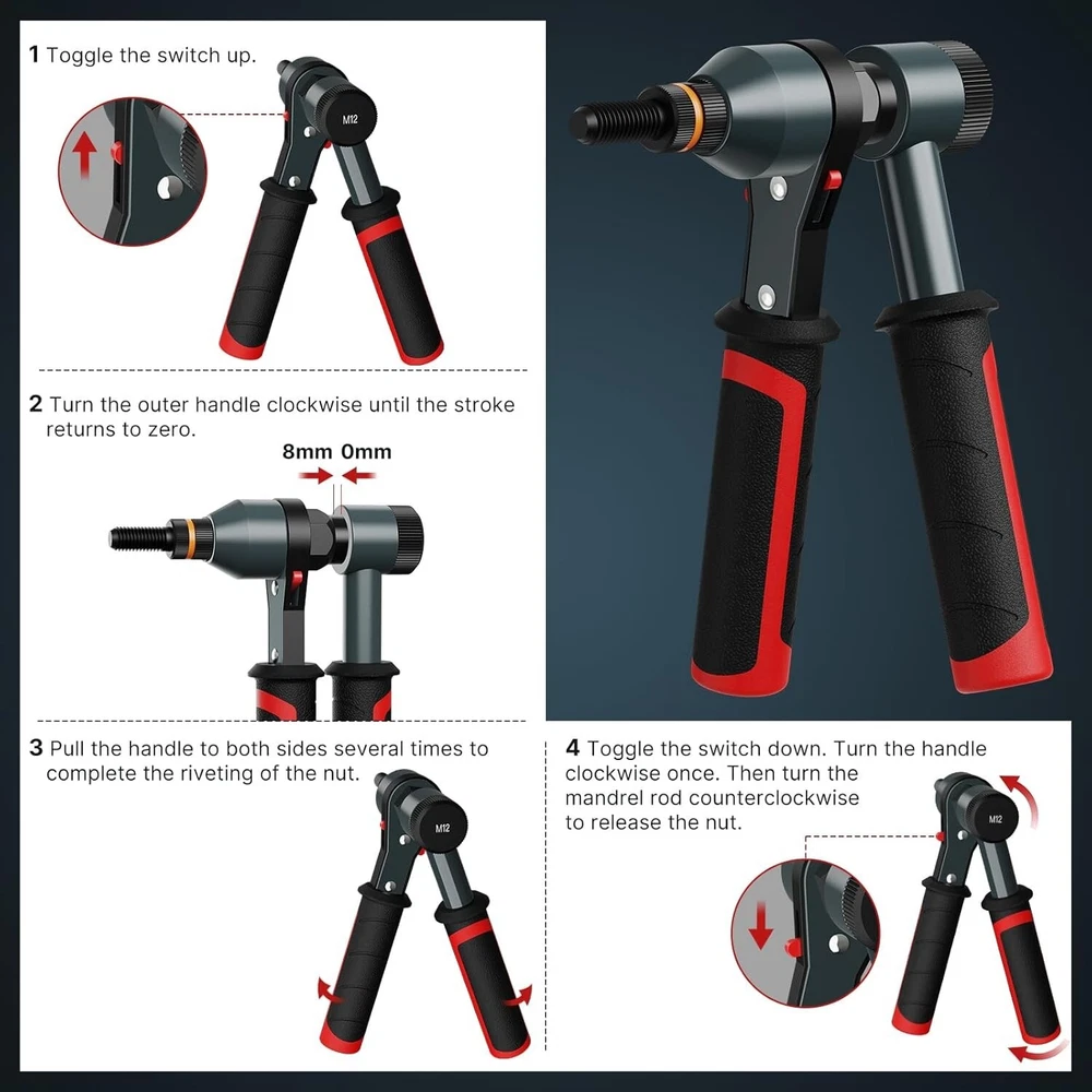 Rivet Nut Tool Rivet Nut Kit, Rivnut Tool Kit with 10 Metric and SAE Mandrels, 100 Pcs Rivet Nuts Assortment Kit, Professional Ratchet Nutsert Tool Kit with Rugged Carrying Case, TR21 Ratcheting Mechanism: The Ratchet Nut Tool features a ratcheting mechanism that allows for easy and efficient installation of rivet nuts. This mechanism ensures that the nut is securely fastened without excessive manual force Quick change mandrels: A convenient feature of the TOLRET Rivet Nut Tool is the quick-change mandrel system. This allows users to easily switch between different mandrel sizes without the need for additional tools, reducing downtime during jobs Ergonomic Design: The ergonomic design of the handle provides a comfortable grip and optimal control during operation. So that users can reduce fatigue and improve work efficiency when using it for long periods of time Durable Construction: Built to withstand the rigors of industrial use, the Ratchet Rivet Nut Gun features a rugged and durable construction. The combination of high quality materials and precision engineering ensures a long service life Consistent results: The ratcheting mechanism ensures that each rivet nut is installed with a consistent level of force, resulting in reliable and consistent results for nut tightness and safety