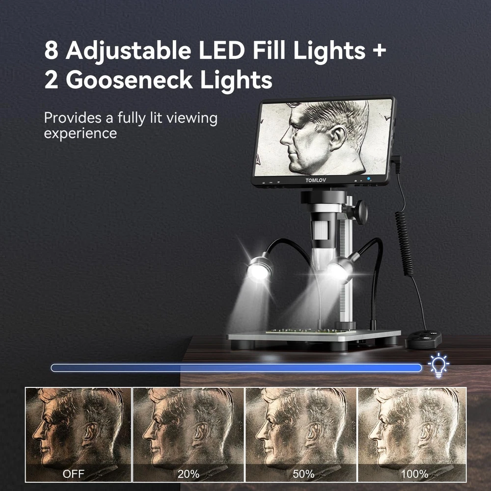 TOMLOV DM9 7" Digital Microscope: 1080P 1200X Coin Microscope Magnifier, 12MP Ultra-Precise Focusing LCD Soldering Microscopes for Adults, PC View, 32GB Product Details Color: Silver Brand: TOMLOV MPN: TM-DM9 UPC: 889251607592 EAN: 0889251607592 Light Source Type: LED Model Name: DM9 Material: Aluminum Alloy Color: Silver Product Dimensions: 8.19"L x 3.23"W x 9.45"H Real Angle of View: 178 Degrees Magnification Maximum: 1200 x Voltage: 5 Volts Brand: TOMLOV Compatible Devices: Laptop, Personal Computer Product Dimensions: 9.53 x 8.03 x 3.54 inches Item Weight: 2.11 pounds Item model number: TM-DM9 Batteries: 1 AAA batteries required. (included) Is Discontinued By Manufacturer: No Date First Available: August 18, 2020 Manufacturer: TOMLOV Tons of Fun and Applications: With easy-to-use operation and a wide range of applications, from micro soldering and rock inspection to coin and stamp observation, this coin microscope with screen is perfect for adults, students, and young learners, enhancing interaction between parents and kids, as well as teachers and students 7-Inch Rotatable FHD Screen: Equipped with a 12MP ultra-precise focusing camera and 1080P high-definition imaging, this LCD digital microscope captures high-quality images and videos, delivering an incredible microscopic viewing experience. The rotatable (90-degree) screen design improves ergonomics and reduces eye and neck strain 5X-1200X Magnification: Allows you to zoom in and observe the tiniest details with a magnification range from 5X to 1200X. The 8 LED fill lights, plus 2 additional gooseneck lights, ensure a well-lit view. The actual magnification varies depending on the screen size and the distance between the camera and objects Hook Up to PC for a Larger View: Compatible with Windows and macOS, the PC view allows you to observe on a larger screen and facilitates data sharing and analysis. No additional software requiredsimply use the default apps: "Windows Camera" for Windows and "Photo Booth" for iMac/MacBook 32GB SD Card Included: This coin magnifier with light includes a 32GB Micro SD card, allowing you to store numerous photos and videos. Press and hold the menu button for 3 seconds to switch between Photographing, Video Recording, and Playback modes (Please note: To prevent the Micro SD card loss, we have pre-installed it into the Micro SD card slot on the microscope) Solid Metal Frame Construction: Constructed with an aluminum alloy base, stand, and holder, this soldering microscope ensures long-term durability, making it ideal for micro soldering and PCB repairs Available Photo & Video Resolutions: Photo Resolution: 12MP (40233024), 10MP (36482736), 8MP (32642448), 5MP (25921944), 3MP (20481536). Video Resolution: 1080FHD (19201080), 1080P (14401080), 720P (1280720). Please note that higher resolutions take up more storage space, and resolution may be limited when viewed on a PC