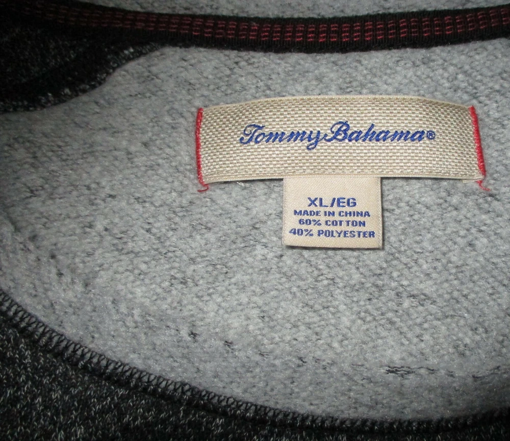 See my EBAY STORE at “SAMTPC53” to view 100’s more of my Men's SWEATSHIRTS!!! Combine Shipping: (on multiple items you pay full price on heaviest item first and then HALF PRICE shipping on ALL other clothes items. Men's Lightweight Fleece Sweatshirt. Brand: TOMMY BAHAMA. Description: men's cotton blend TOMMY BAHAMA long sleeve lightweight fleece lined sweatshirt, see pics. Color: Gray. Size: XL (please see measurements). Measurements: 23" armpit to armpit, 31" shoulder to hem, 22" insleeve. Material: 60% Cotton, 40% Polyester. Condition: Excellent condition, NWOT.