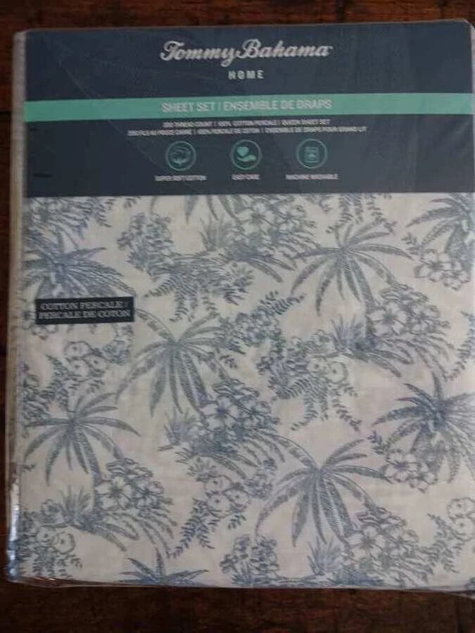 TOMMY BAHAMA PEN AND INK TROPICAL BLUE PALM TREE FLORAL PERCALE QUEEN SHEET SET 4PC From Tommy Bahama Home... soft relaxed stone washed cotton percale sheet set featuring a blue palm tree and tropical floral print done as if sketched with ink pen on a white background. QUEEN set includes: 1 QUEEN flat sheet (94x102") 1 QUEEN fitted sheet (60x80") 2 STANDARD Pillowcases (21x32") BRAND NEW 100% COTTON MACHINE WASHABLE Smoke and pet free Customer satisfaction is a top priority. Please contact me within 3 days of receiving your item if there is a problem. If for any reason you decide to return your purchase, please read the following details of my return policy. Item must be returned within 30 days of receiving the item. Items must be returned in unopened packages as received. Linens can pick up lint, odors, hairs, pet hairs, stains, etc. so I do not accept the return of any items that have been removed from packaging and then refolded back in. Also, color variations can occur from one monitor to another and cannot be used to say that an item is not as described. If you are returning because the color is not as you thought, the reason will be considered as buyer's remorse. For items returned due to buyer's remorse, buyer pays for return shipping. Feedback will be given following your receipt of item(s) and your posting of a positive transaction experience. I am not an authorized distributor nor a representative for any of the designers or labels I offer. However, I can guarantee 100% authenticity as I buy from major department stores and retail outlets. All items are brand new and first quality, unless otherwise noted. Thank you for your consideration! See my other listings for more great items! Immediate payment required. Shipping method will be the most economical based on the zip code of buyer. Order will ship within 24 hrs of purchase. Tracking will be uploaded to buyer's transaction page. There will be a shipping surcharge if you are shipping to Alaska, Hawaii, Puerto Rico or any US territory outside the continental USA. txzj pxzj3177 txzj-11 txzj42 txzj115
