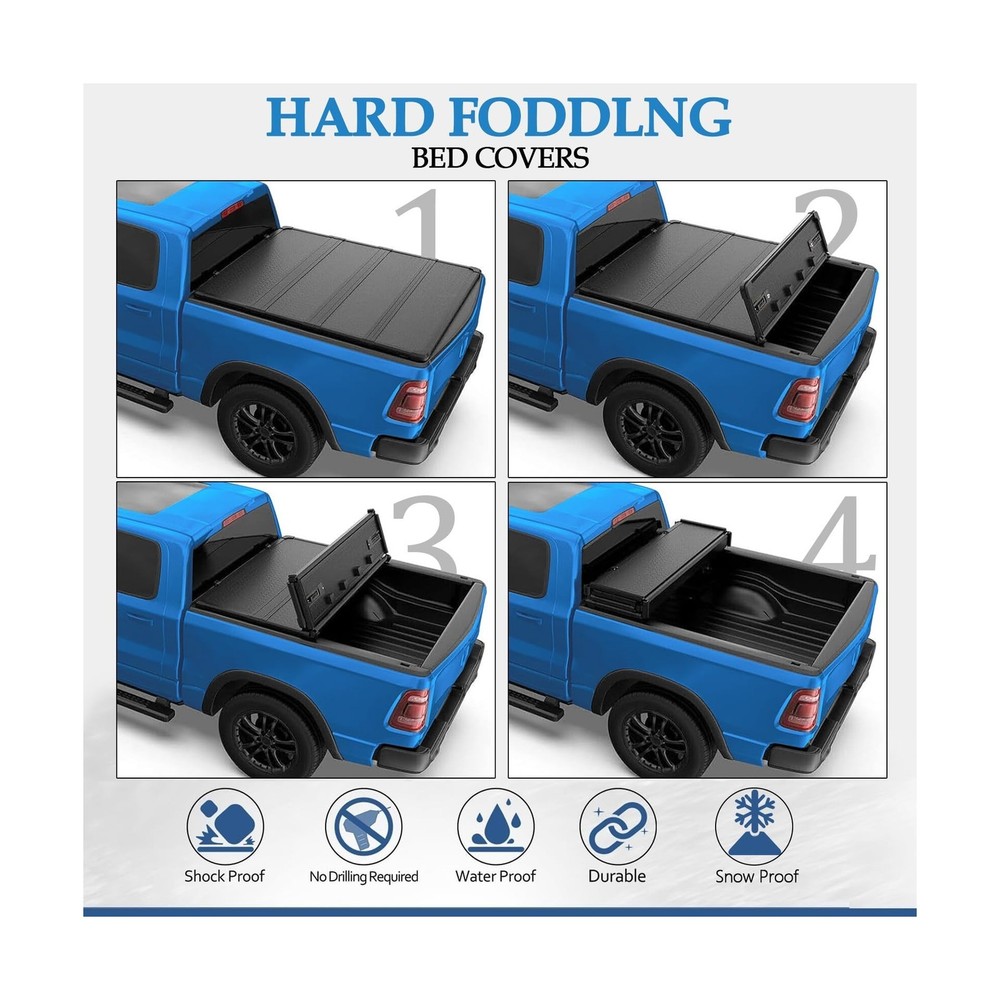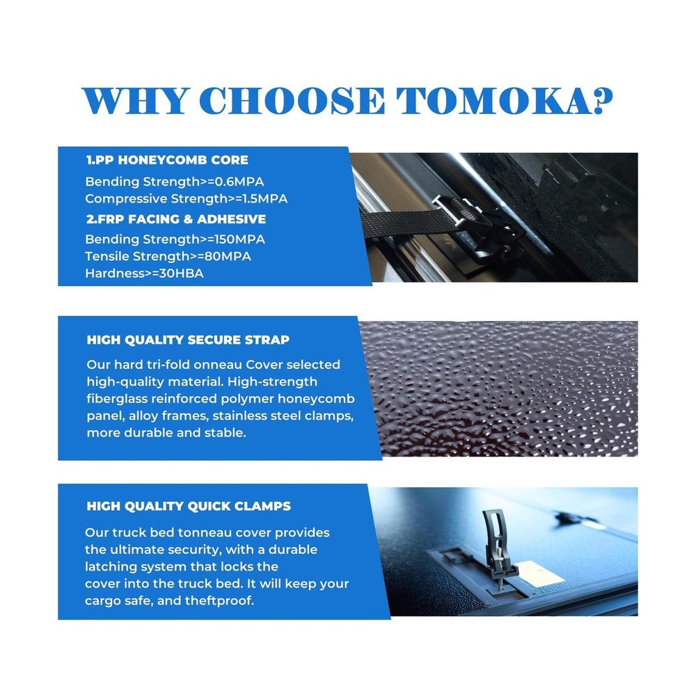 TOMOKA Hard Quad-fold Truck Bed Tonneau Cover Compatible for 2004-2007 Chevy Silverado/GMC Sierra 1500, 2007 Classic Body (Not for New Body) Crew Cab 5.8 FT (68.4") Bed Fleetside (Not for Stepside) Description Features: FITMENT Hard Quad Fold Truck Bed Cover is compatible with 2004-2007 Chevy Silverado / GMC Sierra 1500, 2007 Classic Body (Not for New Body) Crew Cab 5.8FT (68.4") Bed Fleetside (Not for Stepside) MATERIAL High-quality FRP material - FRP material has high strength and strong impact resistance, which can resist external risks well and protect the goods in your truck from damage. Hard Quad Fold Bed Cover is not only lighter in weight, but also more scratch resistant than aluminum alloy and has higher compressive strength. MULTI-FUNCTION Waterproofing, snow, dust, and UV Preventing, Anti-fall off. Impact resistance, scratch resistance, vibration resistance, and matte black reduced light pollution at night. To prevent the cover slide from the bed while driving on the road, we use a latching system to keep the tailgate well sealed. NO DRILLING INSTALLATION Easy to install without drilling. Providing instructions for your reference. Simple operation with good use. Product Details: Brand: TOMOKA Style: Hard Quad-fold Exterior Finish: Aluminum Material: Fiberglass Reinforced Polymer, Polypropylene, Stainless Steel Lock Type: Tailgate Brand: TOMOKA Style: Hard Quad-fold Exterior Finish: Aluminum Material: Fiberglass Reinforced Polymer, Polypropylene, Stainless Steel Lock Type: Tailgate Manufacturer: Tomoka Model: TMK-NHQ031 Item Weight: 66.6 pounds Package Dimensions: 70.08 x 27.17 x 5.71 inches Item model number: NHQ031 Manufacturer Part Number: TMK-214H-2088 Special Features: Matte black, Mounting Hardware Included, US Local Shipping, Water proof and Anti-moisture Lift Type: manual Date First Available: March 6, 2024 Delivery We Do Not Ship Outside of the Continental US. Return Policy All items qualify for returns within 30 days of receipt. Buyer is responsible for return shipping on any item that is not damaged. Feedback We take our reputation seriously, we buy and sell online, so we understand the value of trust. If you are unsatisfied with your order, please contact us and we will work with you to resolve it to your satisfaction.