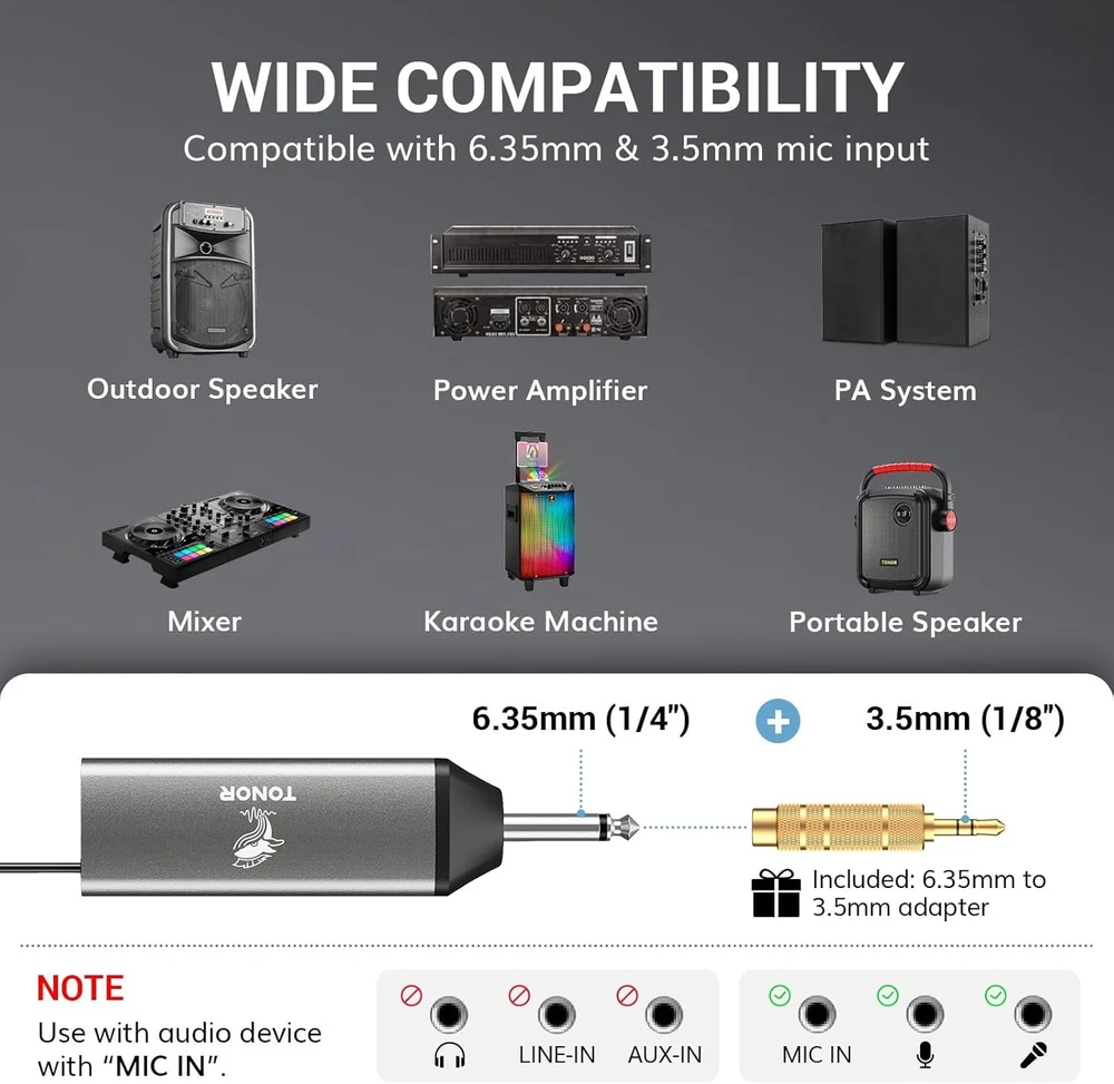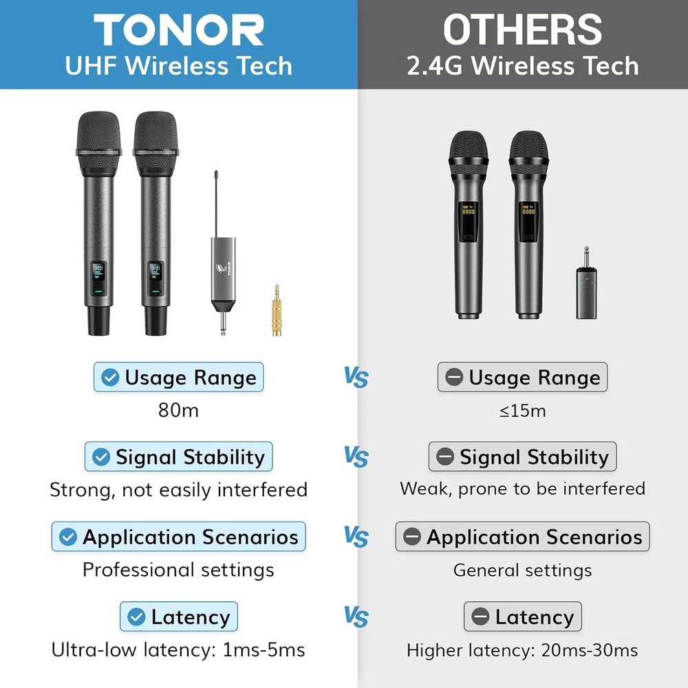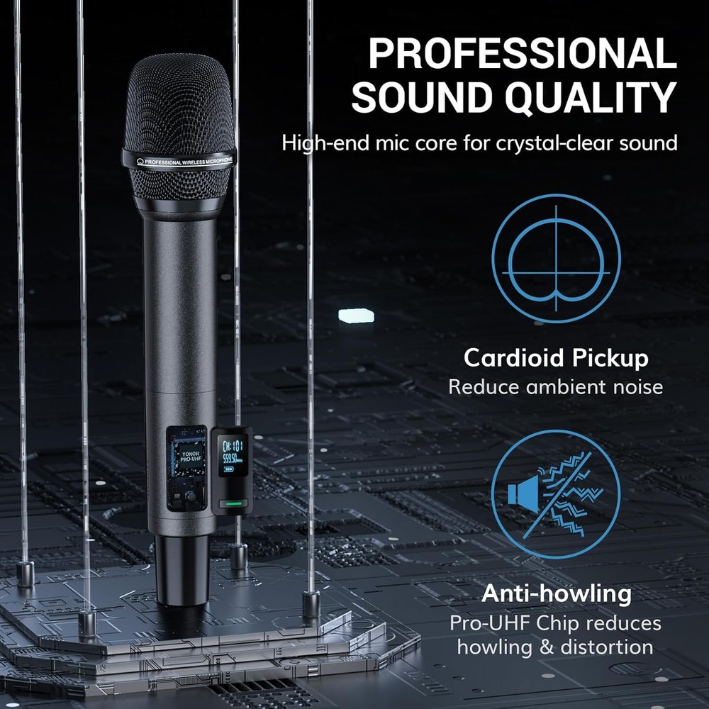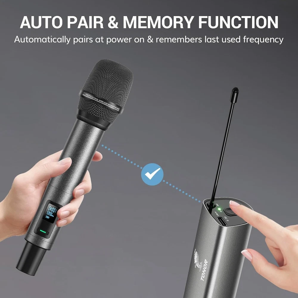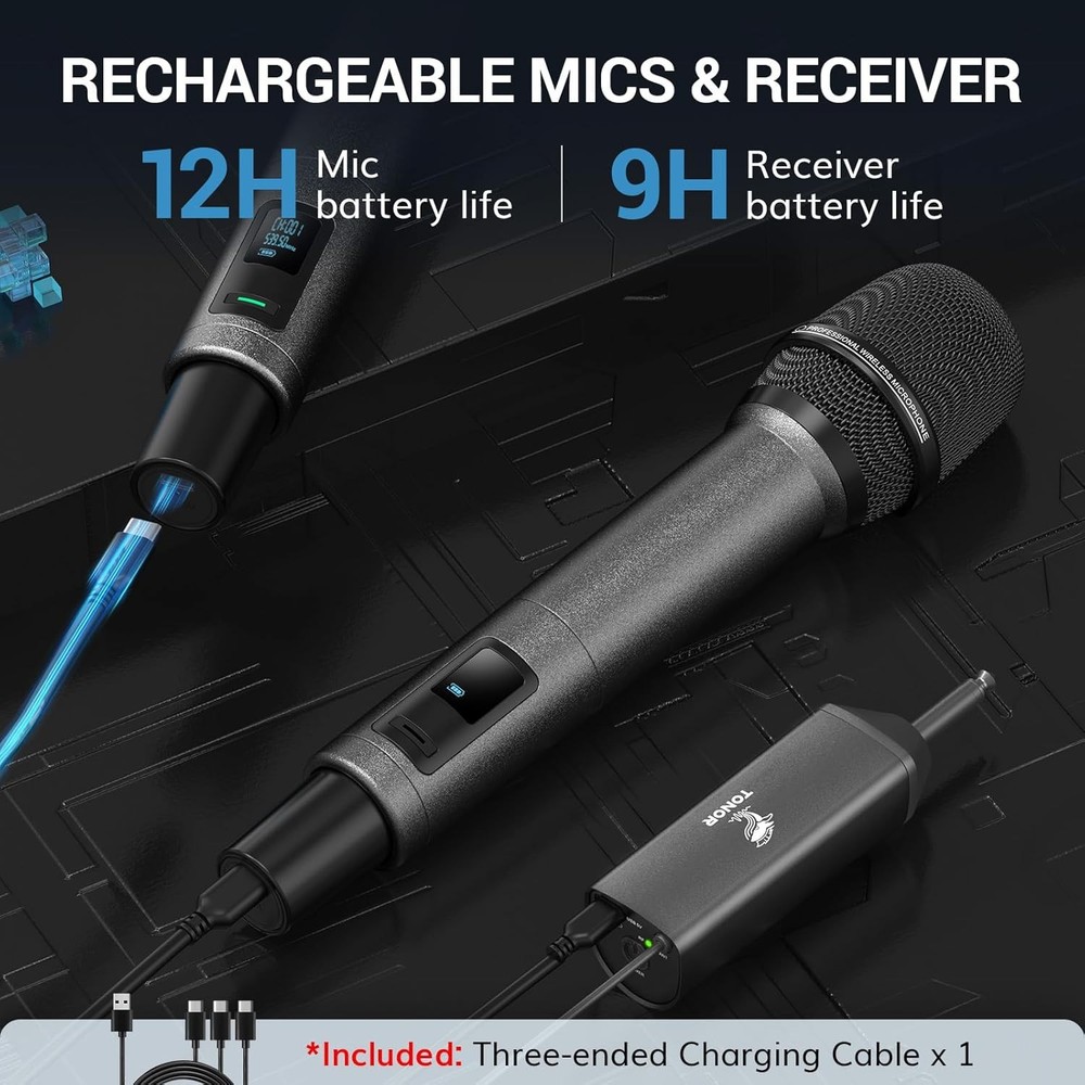 TONOR Wireless Microphones, UHF Rechargeable Cordless Karaoke Mics, 2x20 Gray Product Details Microphone Form Factor: Handheld Item dimensions L x W x H: 11.81 x 7.09 x 2.52 inches Power Source: Battery Powered Number of Batteries: 1 AA batteries required. (included) Material: Metal Number of Channels: 200 Manufacturer: TONOR Item Weight: 2.12 pounds Product Dimensions: 11.81 x 7.09 x 2.52 inches Item model number: 24158 Batteries: 1 AA batteries required. (included) Color Name: Gray Material Type: Metal Battery type: Lithium Ion Brand: TONOR Model Name: TW520 Connectivity Technology: UHF Connector Type: 6.35 mm, 3.5mm Jack Special Feature: One-Click Mute, Auto-Pair, Rechargeable, Memory Function, LED Indicator Compatible Devices: Mixers, Karaoke Machines, Amplifiers, Speakers Color: Gray Included Components: 2 x Wireless microphones, 1 x receiver, 1 x Three-ended charging cable, 1 x 6.35mm to 3.5mm adapter, 2 x foam covers, 2 x anti-slip rings, 1 x manual 2 x Wireless microphones, 1 x receiver, 1 x Three-ended charging cable, 1 x 6.35mm to 3.5mm adapter, 2 x foam covers, 2 x anti-slip rings, 1 x manual2 x Wireless microphones, 1 x receiver, 1 x Three-ended charging cable, 1 x 6.35mm to 3.5mm adapter, 2 x foam covers, 2 x anti-slip rings, 1 x manual See more Polar Pattern: Unidirectional Item Weight: 960 Grams Excellent Signal Stability: The latest PRO-UHF connection chip and anti-interference antennas offer an ultra-long and ultra-stable transmission distance of 262 ft. (80 m) Superior Sound Quality: Features a high-end cardioid dynamic mic core, ensuring clear and authentic sound quality; supports audio devices with 6.35 mm/3.5 mm ports; ideal for karaoke, church, weddings, performances, speeches, etc. Please note that this product does not include an amplifier and is not compatible with Bluetooth speakers uto-Pair and Memory Function: This wireless microphone system automatically pairs and remembers the last used frequency for easy set up; each wireless mic includes 20 UHF frequencies (539.5 to 578.5MHz) Rechargeable Batteries: Mics and receiver feature built-in rechargeable batteries and Type-C ports (Only supports USB-A to Type-C cable charging), no need for AA batteries; fully charged in 3 h, mics last 11-12 h, receiver lasts 7-9 h; includes a three-ended Type-C cable for simultaneous charging One-Click Mute and LED Indicator: Press the microphone button to mute instantly; the indicator on the button is green when working and red when muted.Battery Level Display: The microphone screens show real-time battery levels, allowing you to recharge promptly and avoid sudden power loss during use