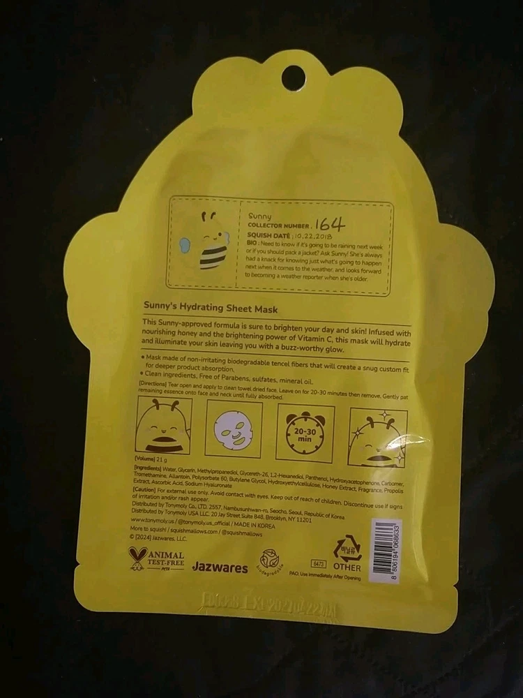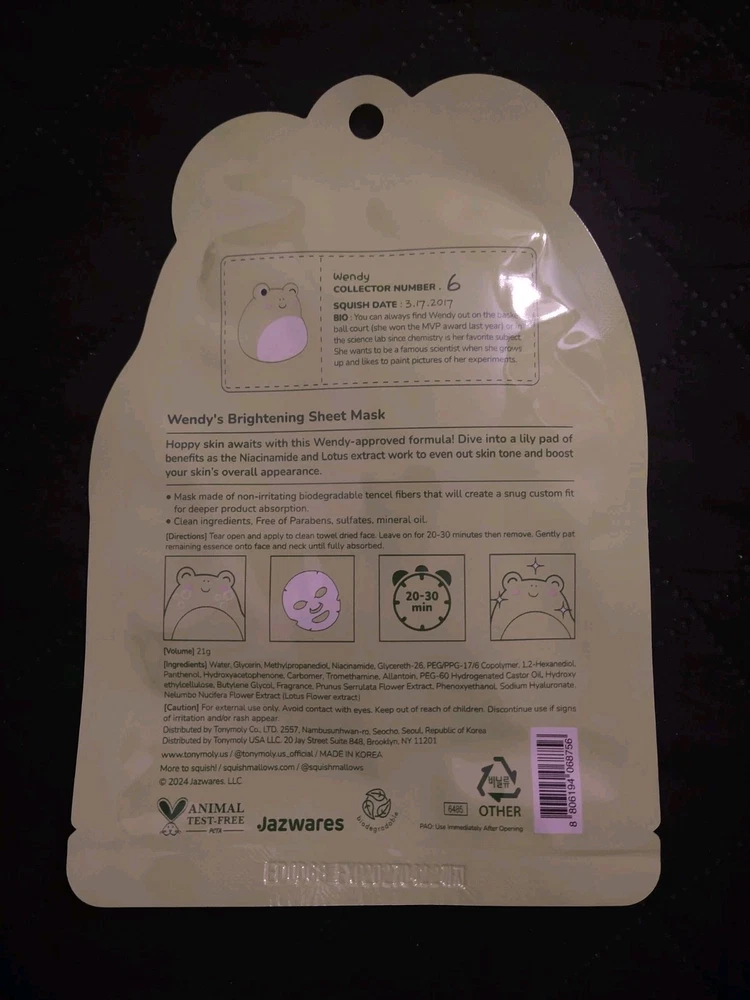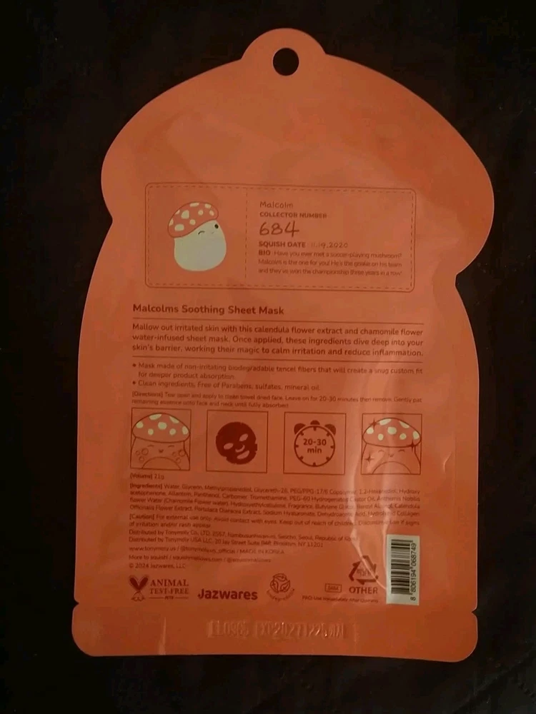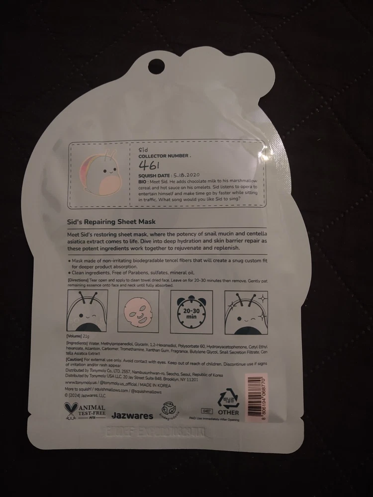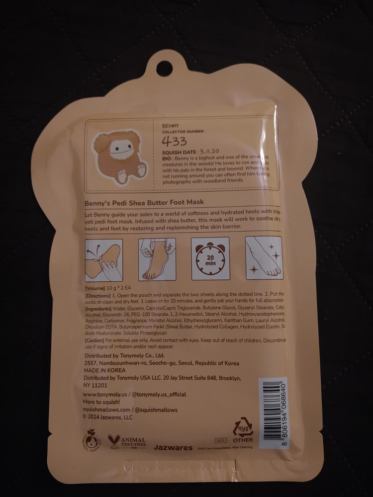 For face 4 units: One of each character in photos. Mallow out irritated, dry and dull skin with one of our Squishmallows sheet masks. These gentle formulas suitable for all ages and packed with an array of ingredients to help soothe, repair, or hydrate your skin. Size: 21ml For feet: 1 pair ( 1 mask for each foot). Let Benny guide your soles to a world of softness and hydrated heels with this yeti pedi foot mask. Infused with Shea Butter, this mask will work to soothe dry heels and feet by restoring and replenishing the skin barrier. Size: 16g x2 Message us if you want to mix and match the face masks with other Tony Moly sheet masks we have available or to bundle with other products we offer to take advantage of free shipping. (Foot mask can only be picked once with this bundle offer).