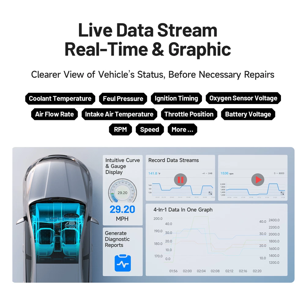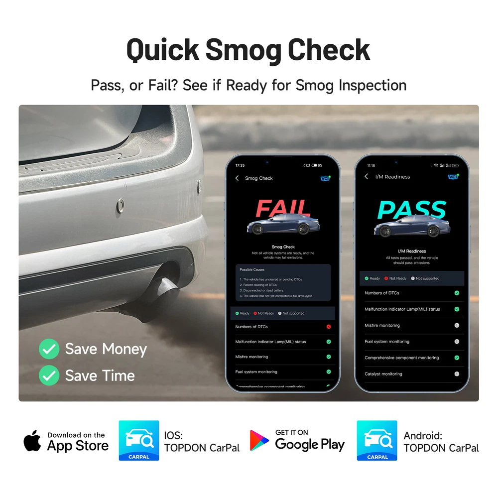 TOPDON CarPal-E Car Vehicle Health Check All System OBD2 Scanner iOS & Android TOPDO N Carpal-E, Your Smart Car Partner On the Go TOPDON has spent extensive development to come up with the TOP-of-the-line Carpal-E , an "adapter + app" OBD-II scanner. Simply plug the Carpal-E adapter into the OBD-II port in your vehicle and install the Carpal-E app (iOS & Android) , Carpal-E will turn your smart device into a real-time full OBD-II remote Bluetooth scan tool; easy, fast and accurate, taking the diagnostic power and convenience to the next level. It is capable of a range of functionalities from pulling trouble codes, diagnosing issues across multiple systems, to 6 reset services and more, operated via a menu-driven user interface. All car owners can easily pick up TOPDON Carpal-E and get the job done quickly. According to the widespread sources that we have received statements from, the feedback turns out to be highly positive and satisfactory: [All System Scan] Read DTCs and data streams for all systems to offer a comprehensive dive into the car's health. You don’t need any specialized diagnostic tools that can only perform scans on limited systems. [Easy User Interface] The intuitive navigation system ensures you find any information you need with utmost speed. However other diagnostic tools may be complex and require specialized training. [iOS & Android Compatible] TOPDON Carpal-E app works perfectly on both iOS and Android, so no matter what smart device you’ve got, it has got you covered. [Thumbs Up from Experts] Highly recommend for anyone who wants to save time, money, and stress. TOP Reasons to Choose TOPDON Carpal-E [All System Scan] All systems present in the car can be quickly diagnosed: (Engine, Transmission, ABS, SRSs, IMMO, Instrument Panel, Air Conditioning, Power Steering, Body, Chassis, etc.) [6 Common Special Functions] Oil Reset, Throttle Adaptation, E-P-B Reset, BMS Reset, TPMS Reset, D-P-F Regeneration: available for a wide range of car brands; help you complete general repairs and maintenance effectively. [Check Engine & Tips] No worries about finding solutions after your engine’s OBD2 check! TOPDON Carpal-E will directly show you the fault codes and give you easy-to-follow repair tips. [Smart AutoVIN] Can automatically read and save your vehicle’s VIN number. This saves you a lot of time and effort as you won’t have to do much research on your vehicle. [One-Touch I/M Readiness] Quickly read I/M readiness status: “PASS” or “FAIL” at a glance, making sure the monitor was set before taking your car to an annual smog test; save time and money. [Battery Test] Keep an eye on your battery’s voltage in real-time; track how the voltage changes over time; plus log all your battery startup info. [0~100km/h Acceleration Test] Can measure the time it takes for your car to accelerate from a standstill to 100 km/h. This is great for checking how your car performs. [Massive Repair Materials] Offer all the diagnostic & repair tips that you’d need: DTC Repair Guidance, Tech Services Bulletins, DLC Location Query, and Fault Light Database. [Multiple PIDs Live Data] Display Multi-PID live data stream in text, waveform, or gauge mode, allowing record and playback. [Wireless Blu.tooth Connection] The maximum 33ft/10m wireless connectivity makes it convenient as you can diagnose from a distance, instead of using a short cable. [Pair with Smart Devices] Convert your Android 7.0 (~above), or iOS 10.0 (~above) smart device into a scan tool to service your car, making maintenance easy and stress-free on the go. Diagnostics of All Available Systems With TOPDON Carpal-E, you no longer have to wonder what the glowing error light on the dashboard means. It is like a personal doctor for your car! It will give your car a full check-up. You can use the diagnostic information to identify the specific problem areas and make necessary repairs. [System Coverage] Engine, Transmission, SRS, ABS, ESP,TPMS, IMMO, Gateway, Steering, Radio, Air Conditioning ... depending on the vehicle’s make/model/year. [For Maintenance ] Read Diagnostic Trouble Codes (DTCs) in target systems to locate the trouble area precisely; and support clearing all DTCs with a single touch. [For Analysis ] Monitor the real-time Live Data Stream displayed in diverse modes (text / waveform graph / analog gauge). PIDs are such as Vehicle Speed (km/h), Engine RPM (rpm), Mass Air Flow Rate (g/s), etc. [Vehicle Health Score] After every system scanning, Carpal-E will evaluate how healthy your car’s systems are and give it a score. You can turn this scanning result into a diagnostic report and keep it as vehicle health logs for future analysis. 6 Most-Common Maintenance Services Oil Reset, the #1 Service Car Drivers Need in U.S. Oil reset (oil change reset, or oil life reset) is crucial for car drivers because regular oil changes are essential to maintain a vehicle’s performance and prolong the engine life. With TOPDON Carpal-E, you can easily reset the oil change indicator after an oil change or maintenance service; turn off the “check engine” light and the reminder that appears on the dashboard. By doing this common service on your own, you can only pay for the materials used for the oil change, saving 10~30 bucks around. Throttle Adaptation, Calibrate Throttle Control System Throttle adaptation can relearn the throttle’s operating parameters and restore optimal performance, because over time the throttle system can develop issues like throttle lag, poor acceleration response, or rough idling. By doing this reset service independently, you may save from 50 to 200 bucks instead of asking for a mechanic’s help. E-P-B Reset ( Save 50~150 Bucks) Struggled to service cars with electronic parking brakes? It can be quite a hassle without a scan tool that helps you retract electric parking brake calipers. With this feature, you can easily reset the brake pad position after replacement. BMS Reset (Save 45~250 Bucks)