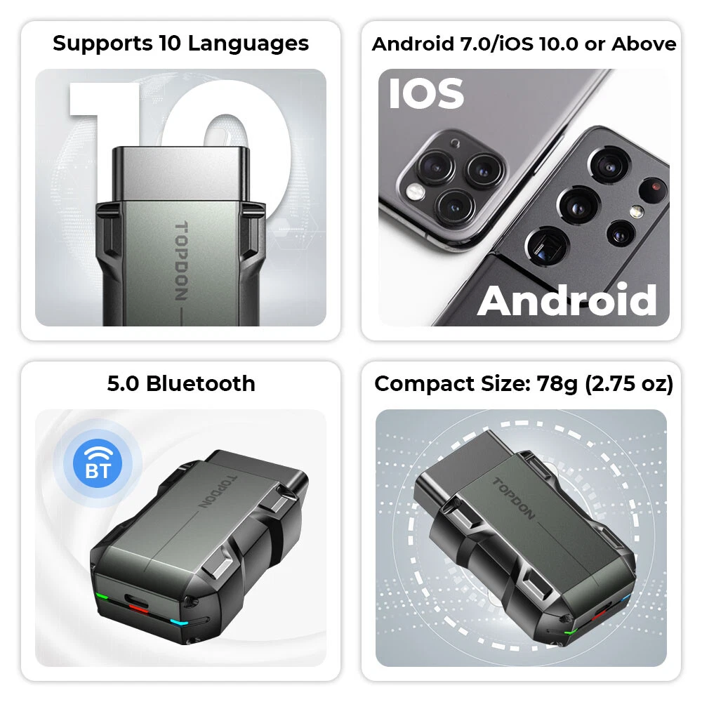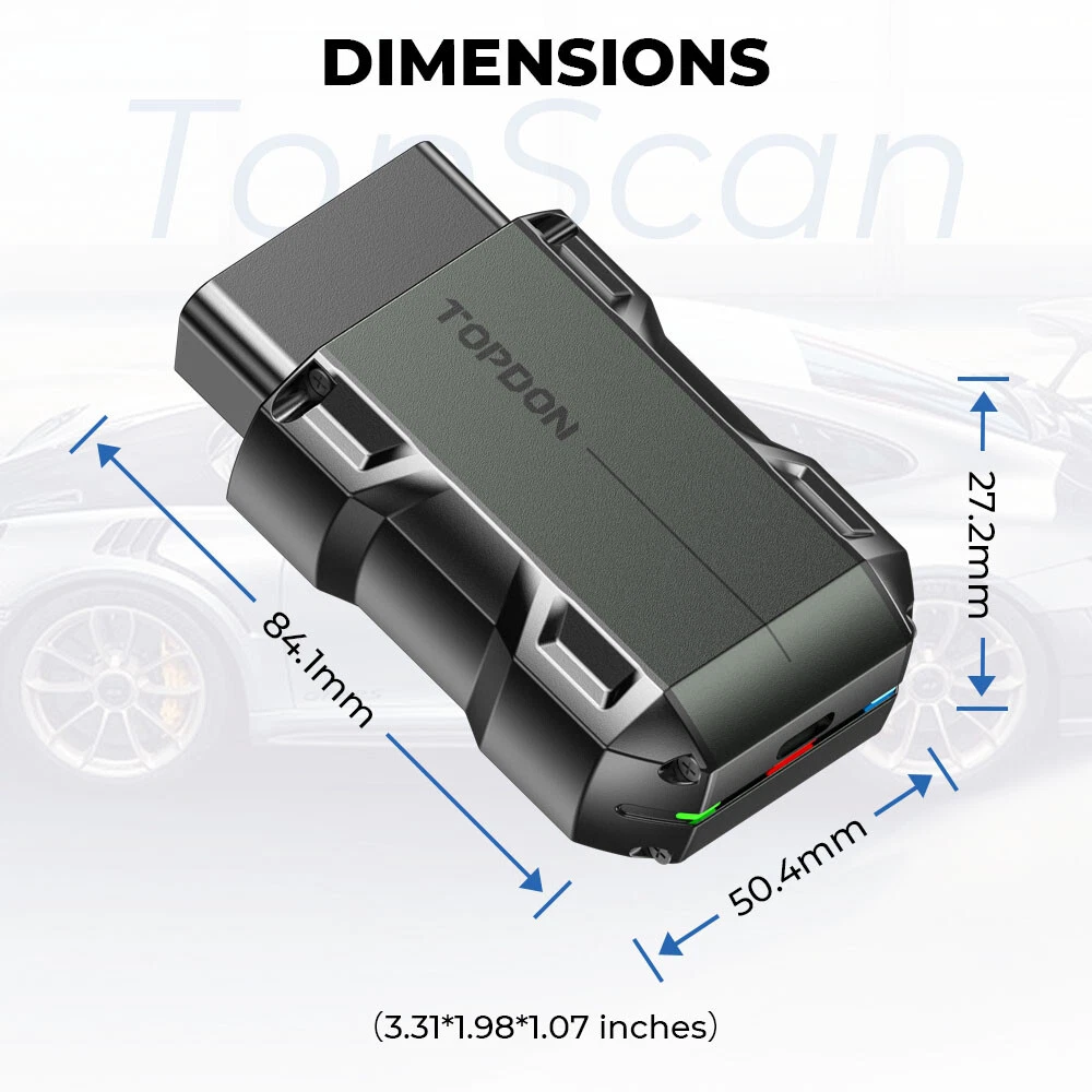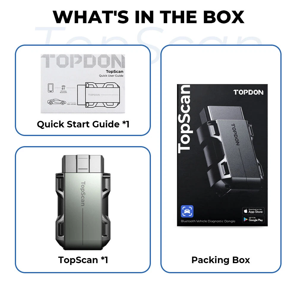 TOPDON Topscan OBD2 Scanner Bluetooth, Wireless OBDII All System Diagnostic Tool #1 TOPDON TopScan Lite OBD2 Scanner Bluetooth, Wireless OBDII All System Diagnostic Tool for iOS & Android, Bidirectional Scan, Check Engine Car Code Reader, Vehicle Performance Test, Repair Guides, AutoVin Brand TOPDON Power Source Vehicle Operating System iOS and Android Item Weight 4.2 ounces Product Dimensions 3.31 x 1.98 x 1.07 inches Item model number TOPSCAN LITE Manufacturer Part Number TOPSCAN LITE About this item 8+ Popular Functions, Full System Diagnosis: TopScan Lite supports OBD2 full system diagnosis functions, including read/clear codes, E-CU information,AUTO VIN, viewing real-time data, and active tests. It offers 8+ reset functions: Oil Reset, Throttle Adaptation, EPB Reset, Steering Angle Reset, DPF Regeneration, ABS Bleeding, BMS Reset, and SRS Reset. By these functions, you can save on unnecessary repair costs and reduce repair times significantly. Bi-directional Control, Quickly Locate Problems: The bi-directional scan tool enables you to send commands from your smartphone directly to the vehicle's E-CU for active testing. This feature helps to quickly narrow down problem areas, such as A/C clutch, windows, doors, sunroof, etc., reducing the mechanic's diagnostic time and can help DIY users locate faults more easily. Additionally, TopScan Lite provides fault analysis and repair guidance, helping you solve problems efficiently. Bluetooth Quick Pairing in Seconds: With the upgraded 5.0 Bluetooth system, TopScan Lite ensures a faster connection, eliminating the hassle of wires.The bluetooth pairing process needs to be completed in the application (IOS: TOPGURU&Android: TopScan). you can download our app from APP Store and Google play. TopScan Lite provides one year of free software updates. Performance Testing: Always Know Your Vehicle's Condition, TopScan Lite supports speed performance testing, allowing you to analyze speed changes and calculate engine displacement efficiency,the higher the VE volumetric efficiency, the better the power output performance of the engine. 4- Repair Guides, Your Online Assistant: TopScan Lite has launched 4 functions that are most touching for all car owners, DIY enthusiasts, and mechanics: TSB factory technical bulletins, easier and more convenient search. The OBD common fault code repair guidance, leading you to solve problems quickly. DLC diagnostic seat location, quickly positioning. Fault code database, telling you the reasons and solutions for all fault lights, saying goodbye to complicated methods. Vehicle Coverage Lookup: Are you unsure whether the TopScan Lite scanner tool is compatible with your family's or friends' car models? We've got you covered! With the convenient TopScan Lite scanner compatible vehicle model table query function, you can easily verify compatibility with a single click. No more guesswork or uncertainty, get the answer Immediately. Diagnostic Tool Subscription Fee: After the first year of free updates, the subscription fee for the second year is $49.99/year for all applicable vehicle models and all features, such as system diagnostics, reset services, action tests, performance tests, repair guides, and more. You can purchase the 'Diag Bundle' to gain access for the second year, which can be done through the app. Note: You do not need to purchase the Diag Bundle in the first year, the first year is free of charge. Product Description TopScan Lite Expands More New Features, Turn A Smartphone Into A Smart Diagnostic Tool. 2024 New Version OBD2 Scanner All System Diagnosis-Small But Mighty Enabling you to better understand and maintain your beloved vehicle, while acquiring detailed information to avoid automotive repair scams! AutoVin & AutoScan No need for manual input of vehicle brand, model, and year data. With just a simple press, you can quickly identify the car and access diagnostic. One Click to Update All updates are just a click away, and we also offer one year of free updates, and the second year subscribe fee $49 with full software(Diag Bundle) Share and Print Report This automotive scanner can save and playback diagnostic data so you can share report with friends or mechanics, or print it! Feedback Function This scan tool gives you access to the “Feedback” function which provides customized repair suggestions from our certified professionals. Payment Delivery details Terms of sales About us Contact us Payment We accept all common forms of payment such as Credit cards、Debit card、Google Pay ect. Please contact us if you need to use another method to pay. Payment should be made within 7 days after bidding ends. Otherwise a Unpaid Item case will be opened to you. We are not responsible for buyers’ local taxes. Please include your special requests in eBay note if there is any. Delivery details Shipping: Most orders placed by 1PM eastern time, Monday thru Friday will be shipped within 1 business day after payment confirmed. All orders placed over the weekend will be shipped on Monday. We have warehouse in USA, UK, HongKong, Australia, Russian, Germany and China warehouse. Notice: For USA Buyer , we have warehouse located in Kentucky, Los Angeles & New Jersey etc. (East Side & West Side of USA) , parcel will be shipped from the nearest warehouse according to buyers' eBay address in the paid ORDER . 1. From our US/DE/UK/AU warehouse via UPS / DHL or other eCommerce shipping. Delivery time varies from 2 to 6 business days. 2. From our Hong Kong warehouse via UPS / DHL / FedEx Ground etc. Delivery time varies from 3 to 7 business days. 3. From our China warehouse For US buyers, we use e-Packet (Delivery time is 5-12 business days) or express delivery(Delivery time is 3-7 business days) . For other countries' buyers, we use China Post or Hong Kong Post (Delivery time varies from 10 to 25 business days) or Express delivery (Delivery time is 3-7 business days). We will ship according to buyers' eBay address in the paid O