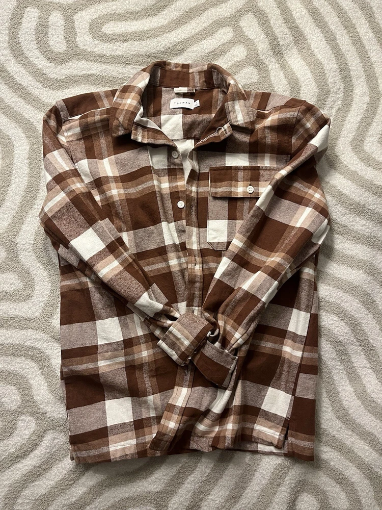 Elevate your wardrobe with this stylish TOPMAN flannel shirt in a rich brown plaid pattern. The heavy overshirt features a button-up closure with a spread collar and long sleeves, making it perfect for travel, casual outings, or workwear. The shirt is made of comfortable cotton fabric and has a regular fit, ensuring a classic and timeless look. This button-up shirt has various features, including easy care, thermal, and breathable, making it an ideal choice for the winter, fall, and spring seasons. It also has pockets for convenience and is machine washable. The shirt is designed for men, with a chest size of 46 inches and size type of regular. The shirt is perfect for outdoor and classic themes and is made in India.