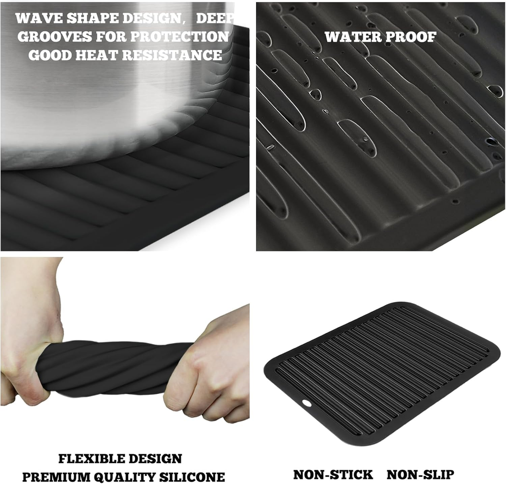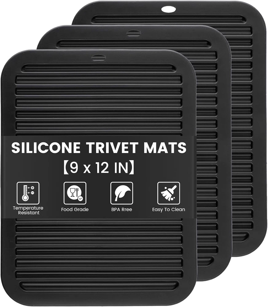 Store New Arrivals Add to Favorite View Feedback Contact TOPULORS 3 PCS Silicone Trivets for Hot Pots and Pans 9"X12" Heat Resistant Mat Hot Pads for Kitchen Quartz Countertops - Dish Drying Mat Non-Slip Potholders Pot Holders Trivets for Hot Dishes - Black Description Item model number Silicone Trivets-3 Color Black - 3 Pcs Brand TOPULORS Material Silicone Country of Origin China Item Weight 14.9 ounces Batteries required No Shape Rectangular Product Dimensions 12"L x 9"W x 0.2"Th Product Care Instructions Hand Wash Only Manufacturer TOPULORS HIGH-QUALITY SILICONE TRIVET MATS: The Trivets are made of food grade, BPA-Free, and heat-resistant silicone material that is absolutely safe for your health. The flexible & durable hot pad won't rust, crack or chip. MULTI-FUNCTIONAL SILICONE POT HOLDER MATS: The trivet is Widely used in kitchens. Silicone trivet extreme temperatures range from -40°F to 446°F. Such as used for kitchen counter spoon rest, potholders, jar openers, pot mats, drying mats, hot dishes, tables, bowl mats, coasters, etc. It's a very useful kitchen helper tool. Trivets for hot pots and pans can be used to protect your dining table and kitchen counter, and your hands to avoid burns. SILICONE HOT PADS WITH ANTI-SLIP DESIGN: Silicone material and wavy design -These two advantages make the pot on the hot pad not slide easily and easy to grab a hot dish. The concave and convex wavy edge can prevent the overflow of water or soup and keep the kitchen countertop or table surfaces clean, thereby reducing the mess. EASY TO STORE AND CLEAN: The silicone trivet mat with hanging hole design that is convenient to hang on a hook and also roll it up or put flat in your drawer when not in use. To clean them, just throw them into the dishwasher or rinse them with water. It's all very simple and easy. PERFECT GIFT KITCHEN TRIVET PADS: A great idea gift for your family, friends, colleagues, etc. You can get 3 PCS mats ( Single size: 11.8* 9 inches ). You'll find they're incredibly convenient to handle. As one of the American most trusted household brands, TOPULORS offers a full unconditional money-back if you're not satisfied with these Silicone Trivet mats! So, add it to your cart! Product Description Durable & Flexible Silicone Hot Pad SILICONE TRIVETS FOR HOT POTS AND PANS - HEAT RESISTANT HOT PADS FOR KITCHEN COUNTERTOPS- 3 PCS MULTI-PURPOSE & VERSATILE TRIVET MATS MULTI-FUNCTIONAL SILICONE POT HOLDER HOT PADS FOR KITCHEN Used for kitchen counter spoon rest, potholders, jar openers, pot mats, drying mats, hot dishes, tables, bowl mats, coasters, etc. Trivets for hot pots and pans can be used to protect your dining table and kitchen counter, and your hands to avoid burns. SILICONE TRIVETS FOR HOT DISHES HEAT RESISTANT HEAT RESISTANT MAT Silicone trivet extreme temperatures range from -40°F to 446°F. Raised wide ridges will separate the hot pot from the table, and protect your kitchen surfaces from scalding. ANTI-SLIP DESIGN Silicone material and wavy design. Very non-slip. Comfortable to grab a hot dish or pan. Single Size: 11.8 X 9 inches. MULTIPURPOSE KITCHEN HOT MATS WATER PROOF Prevent the overflow of water or soup and keep the kitchen countertop or table surfaces clean, thereby reducing the mess. Stain and odor resistant. WIDELY USED Food grade silicone, non-stick. Used as kitchen utensil & spoon rest. EASY STORAGE EASY TO STORE Convenient to hang on a hook. Roll it up or put flat in your drawer EASY TO ClEAN Dishwasher safe. Rinse silicone trivets with water. OTHER KITCHEN SILICONE PRODUCTS MATERIAL Food-Grade Silicone MATERIAL Food-Grade Silicone MATERIAL Food-Grade Silicone and cotton layer HEAT RESISTANT Yes HEAT RESISTANT Yes HEAT RESISTANT Yes KITCHEN PRODUCT Yes KITCHEN PRODUCT Yes KITCHEN PRODUCT Yes MULTIPURPOSE Yes MULTIPURPOSE Yes MULTIPURPOSE Yes MULTIPURPOSE SILICONE HEAT-RESISTANT MAT ABOUT US We offer the best prices around on high quality products. Our E-store includes media such as books, movies, music and games while offering electronics, toys, sporting apparel, clothing, tools, general home, garden items and more. SHIPPING We are always working hard to ensure your package arrives as soon as possible. Please understand that some factors like weather, high postal traffic, and the performance of shipping companies are outside of our control. We offer free shipping to the lower 48 states and ship within 2 business days of payment, usually sooner. We do not accept P.O. Boxes. Please provide a physical address. RETURNS We offer a 30-Day Return Policy on items which you are not completely satisfied with. You have the option for a full-refund or an exchange of the item. No returns are available on items shipped outside of the USA. PAYMENT We accept PayPal. CONTACT US This page content is yet to come Please ad us to your favorite seller and visit again later Thank You CUSTOMER SATISFACTION We try our very best to make sure every customer is completely satisfied. If there's a problem, message us! We're happy to help.