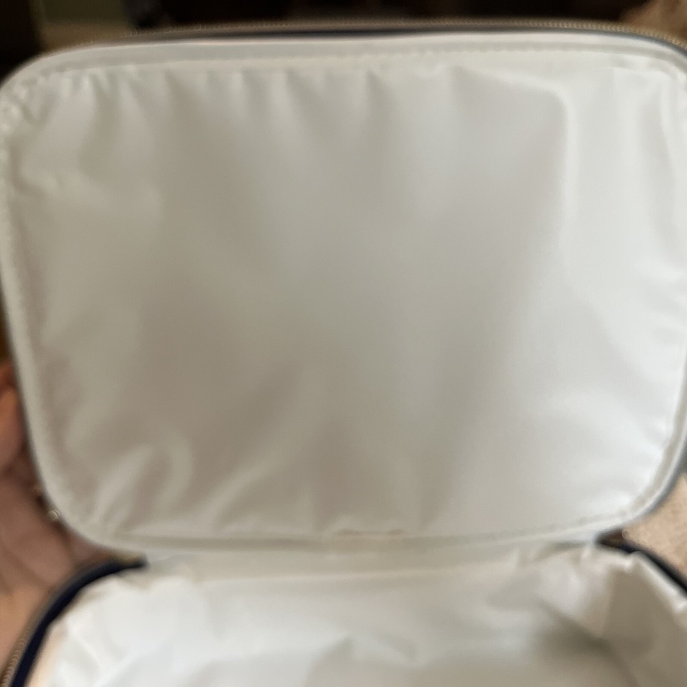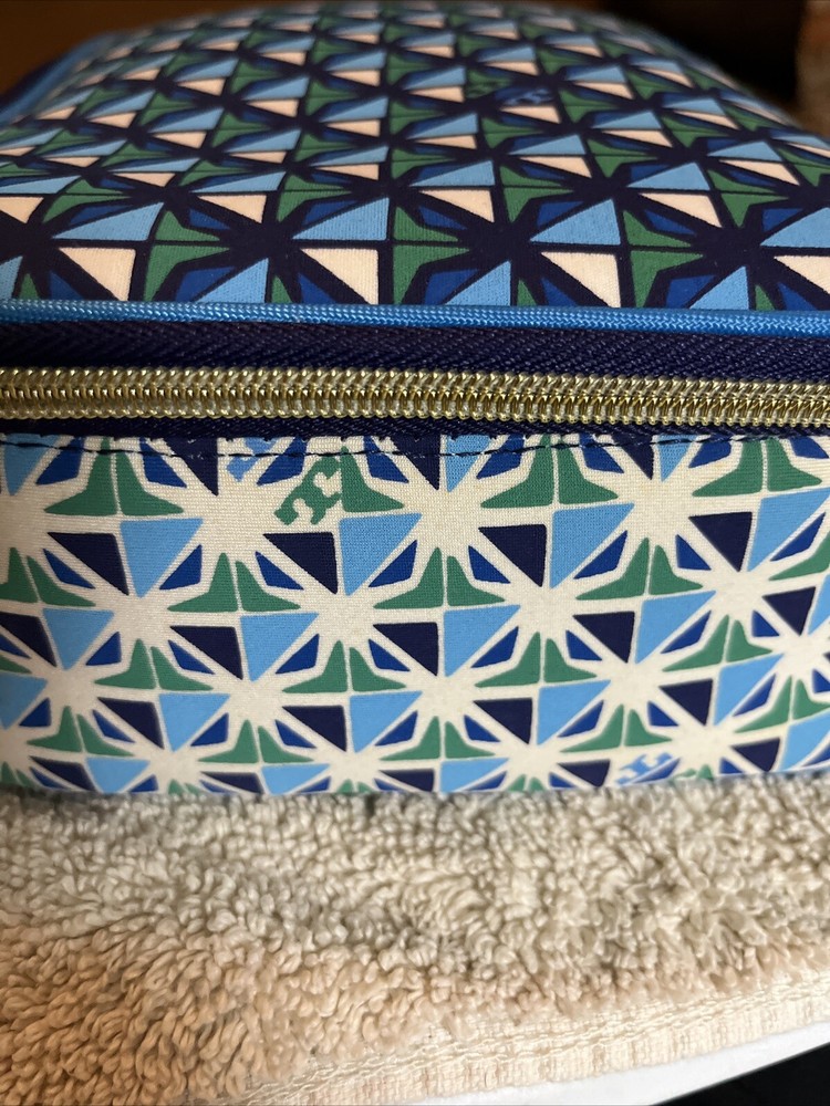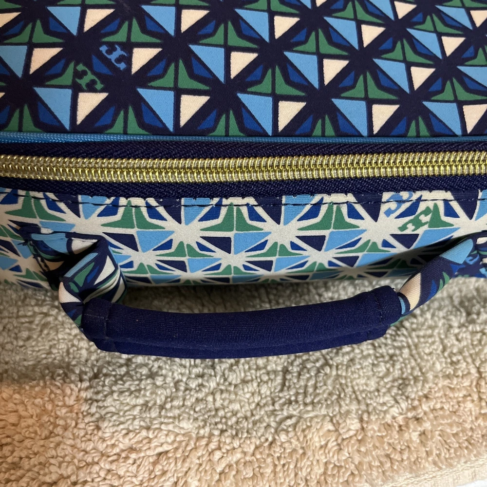 This Tory Burch lunch box tote is a stylish and practical addition to your lunch. With a geometric pattern in multicolor blue, it features a zip lid, neoprene material, and a rectangular shape. The lunch box has one compartment and comes with a handle for easy carrying. Measuring 11 inches in length , 3 inches in height, and 8.5 inches in width , it is perfect for storing and keeping your lunch fresh. The reusable lunch box is a modern style statement and is great for any occasion. Excellent used condition.