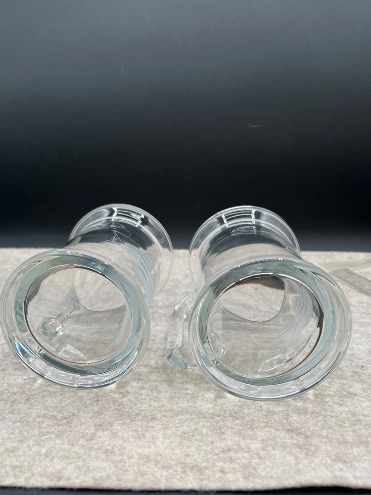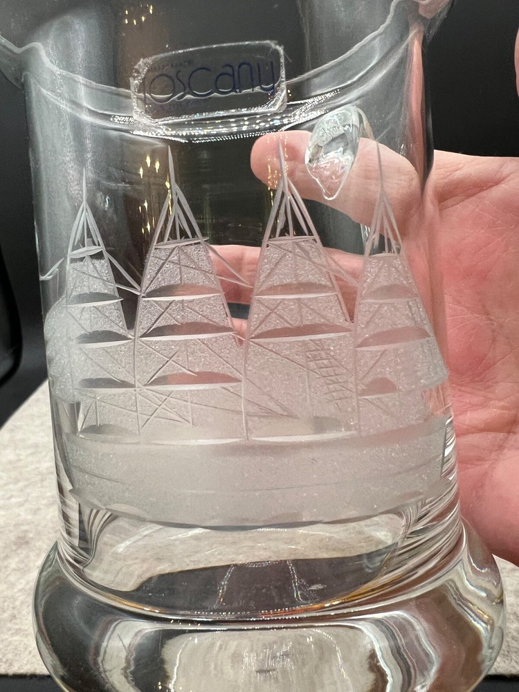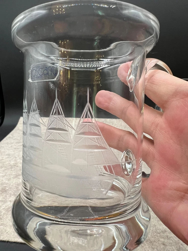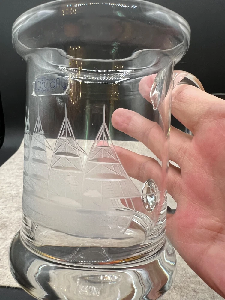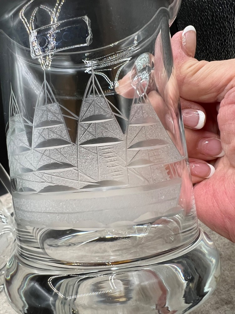 Elevate your barware collection with the TOSCANY Crystal Clipper Mugs, a luxurious addition that blends functionality with a nautical aesthetic. Each 4 1/2" stein is meticulously handcrafted from premium crystal glass, featuring an etched ship design that adds a touch of sophistication to your drinks experience. The round mugs have a 3 1/2" diameter and hold up to 16 ozs, ideal for enjoying your favorite spirits. Crafted with precision, these mugs are a testament to the artistry of hand-blown glass. The clear crystal, combined with the intricate etching, makes each piece a unique work of art. Designed in Romania, the mugs are not just glasses but treasured keepsakes. To maintain their elegance, hand washing is recommended. Add these contemporary originals to your collection and indulge in the luxury of Toscany craftsmanship. set of 2