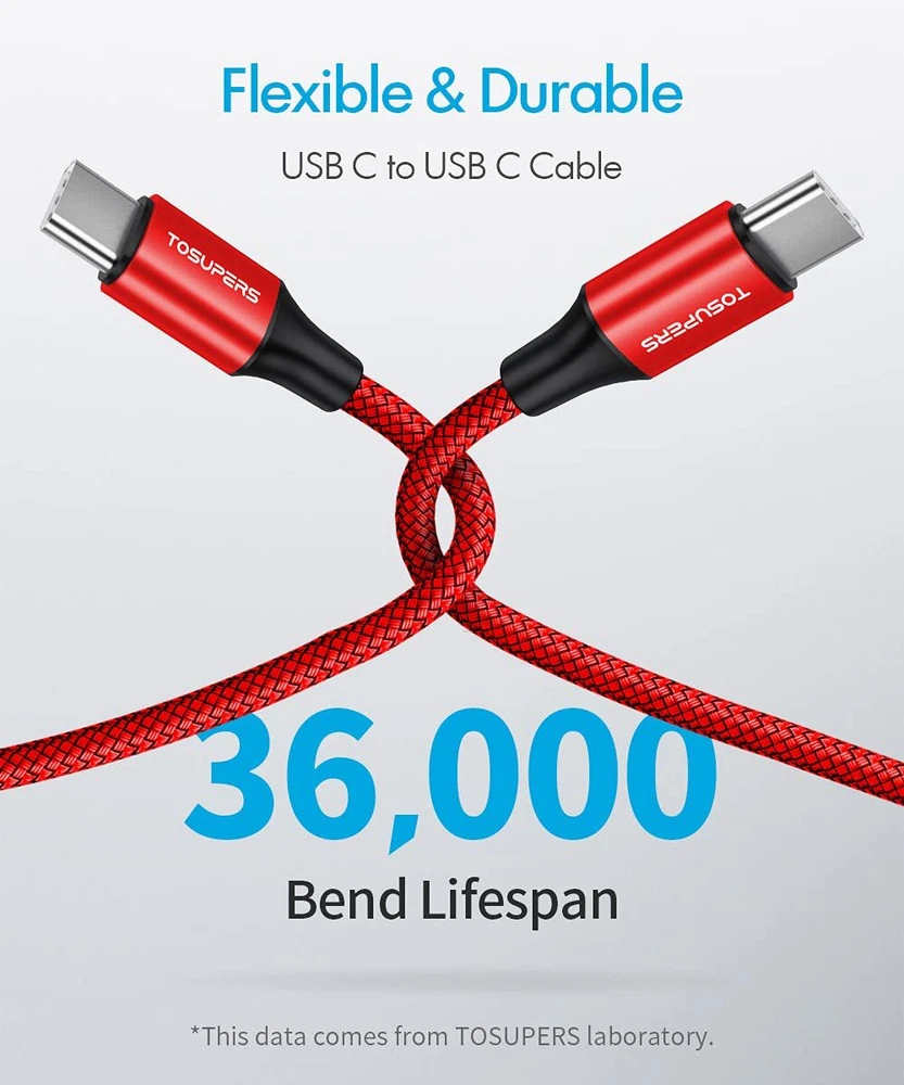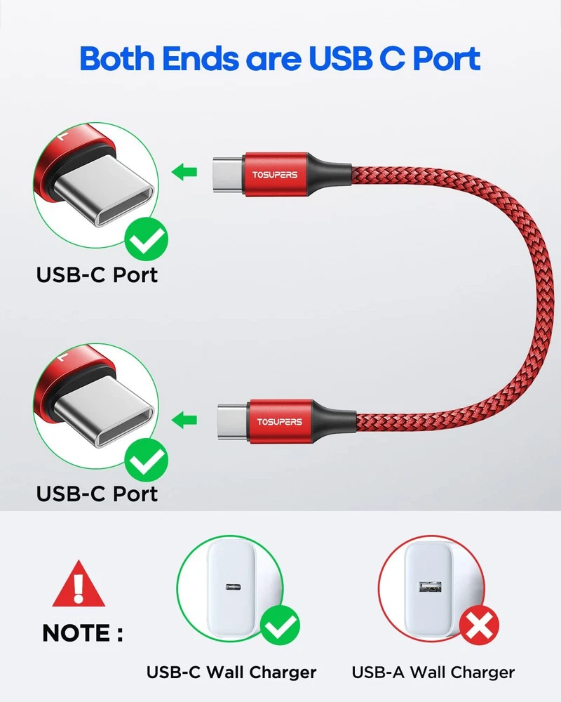 TOSUPERS [1ft, 2-Pack Short USB C to USB C Cable Fast Charging 60W, PD Type C Charger Cord for Samsung Galaxy S24 S23 S22 Ultra Flip, for iPhone 15 Pro Max/Plus, for Macbook/iPad, Pixel 【2PACK 1FT USB C TO C CORD for PORTABLE】: ( * This is a USB C to USB C Cable with the same USB C plug on the both ends. So you need a USB C wall charger to charge your device.) 2 Pack 1ft USB C to C Cable are perfect for charging in most occasions - home, outdoor, office, handy to carry in your pocket. 【60W PD SUPER FAST CHARGING】: High quality smart charging chip for super fast charging, output power up to 60W (20V/3A), fast charging your USB C laptop, tablet and smartphone by using 60W 45W 30W 25W 18W 15W USB C Power Adapters, suports PD and QC 2.0/3.0 fast charging. Data transfer speed is up to 480Mbps (USB 2.0). 【Note: Not support video output.】 【COMPATIBILITY LIST】: TOSUPERS Type C to Type C cable compatible with Galaxy S24 S23 S22 S21 S20, Note 20 10, Z Flip/Fold 5 4 3, Pixel 8 7 6 6a 6 Pro 5 5a 4 4a 4XL 3 3a 3aXL 3XL 2 2XL and other USB-C devices. 【STURDY & SUITABLE DESIGN】: Upgraded 3D aluminum connector & Improved connector tip, can bear 35000+ plug test. Ultra Premium nylon braided cable adds additional durability and tangle free. Special Strain Relief design, can bear 36000 bending test. 【BUY WITH CONFIDENCE】: You will get 2 pack 1 foot Red USB C to USB C Cable. If you have any questions, we will resolve your issue within 24 hours. 【2PACK 1FT USB C TO C CORD for PORTABLE】: ( * This is a USB C to USB C Cable with the same USB C plug on the both ends. So you need a USB C wall charger to charge your device.) 2 Pack 1ft USB C to C Cable are perfect for charging in most occasions - home, outdoor, office, handy to carry in your pocket. 【60W PD SUPER FAST CHARGING】: High quality smart charging chip for super fast charging, output power up to 60W (20V/3A), fast charging your USB C laptop, tablet and smartphone by using 60W 45W 30W 25W 18W 15W USB C Power Adapters, suports PD and QC 2.0/3.0 fast charging. Data transfer speed is up to 480Mbps (USB 2.0). 【Note: Not support video output.】 【COMPATIBILITY LIST】: TOSUPERS Type C to Type C cable compatible with Galaxy S24 S23 S22 S21 S20, Note 20 10, Z Flip/Fold 5 4 3, Pixel 8 7 6 6a 6 Pro 5 5a 4 4a 4XL 3 3a 3aXL 3XL 2 2XL and other USB-C devices. 【STURDY & SUITABLE DESIGN】: Upgraded 3D aluminum connector & Improved connector tip, can bear 35000+ plug test. Ultra Premium nylon braided cable adds additional durability and tangle free. Special Strain Relief design, can bear 36000 bending test. 【BUY WITH CONFIDENCE】: You will get 2 pack 1 foot Red USB C to USB C Cable. If you have any questions, we will resolve your issue within 24 hours. Shipping from the USA All of our products are shipped from the USA, ensuring quick delivery to your destination. Payment We offer the following payment methods: PayPal, credit card, bank transfer, and eBay's secure payment system. Free Shipping & Free Returns Shipping within the USA is FREE. Additionally, any return is absolutely free for you. Risk-Free Purchase You have the option to return an item within 30 days without any justification. We cover the return shipping costs! Fast Shipping We ship immediately upon receipt of payment. Generally, the package is delivered within 2-3 days in the USA. If it takes longer, we will contact you. Quality and Costs Made in Europe, USA, China No customs fees or additional charges Total satisfaction guarantee Invoice with declared VAT available upon request in .pdf format Feedback Your feedback is very important to us. After you pay for your purchase, you will automatically receive positive feedback from us.