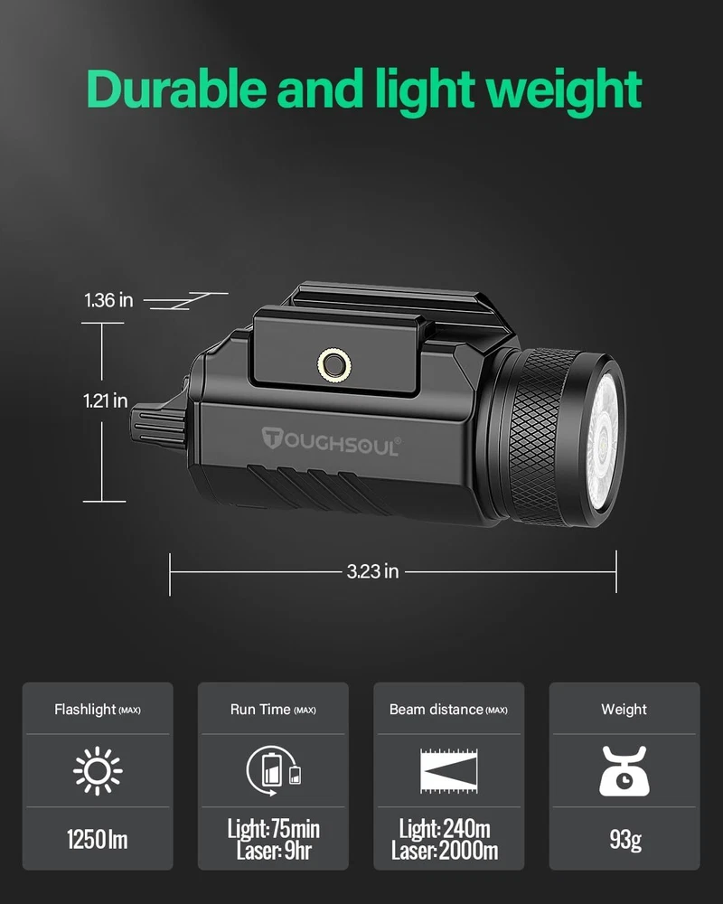 Sport/Activity: Hunting Material: Polymer Type: Flashlight & Laser Combo Color: Black Features: LED, Shock Proof, White Light Power Source: Battery Brand: TOUGHSOUL For Gun Type: Handgun, Rifle, Shotgun Model: TF5020 Mounting: Picatinny Mounting Location: Rail Lumens: 1200