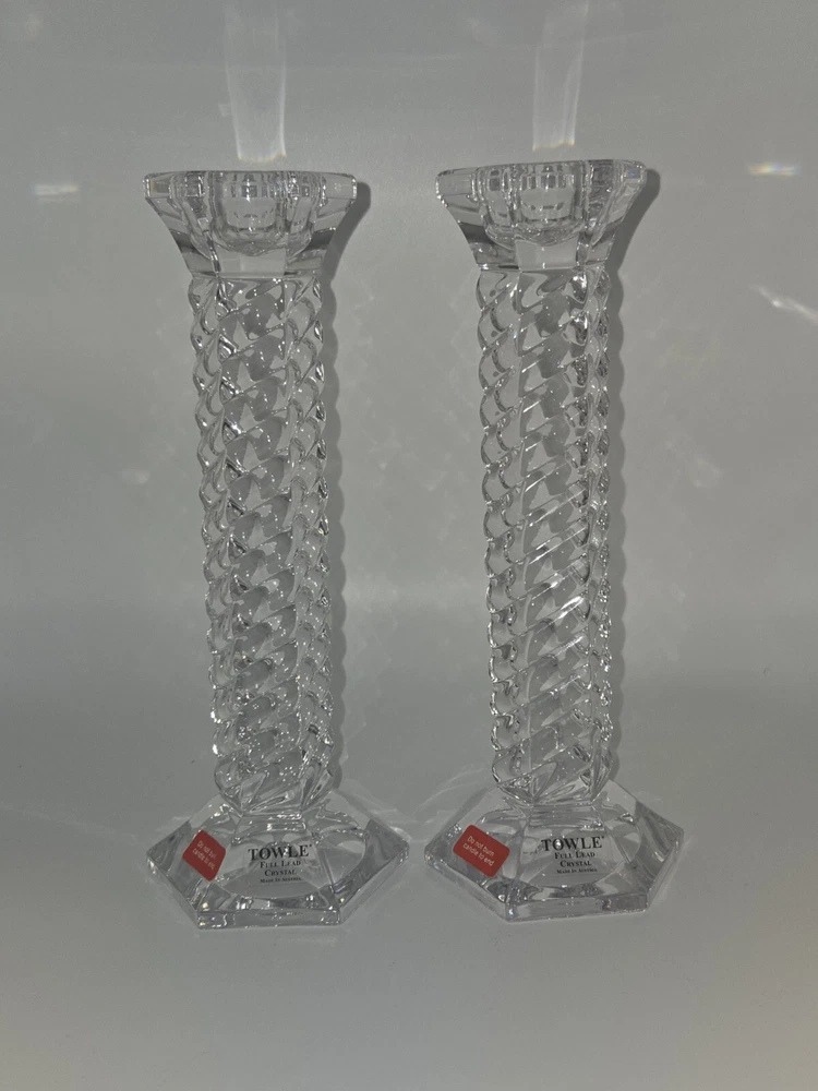 The TOWLE Leaded Crystal Candlesticks Holder Set features a pair of medium-sized candle holders, each measuring 8 inches in length. Made of clear crystal with intricate crystal detailing, these candlesticks are original pieces from Austria. They are suitable for all occasions and come in a set of two. The candle holders do not appear to be engraved and would make a beautiful addition to any decor with their elegant design and craftsmanship.