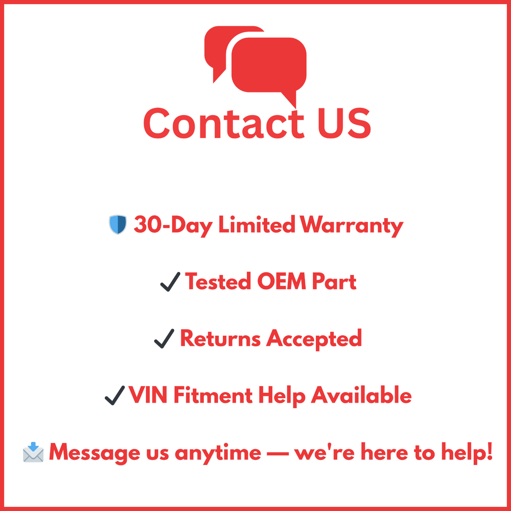 eBay Store Listing Welcome to PARTZFORLESS Genuine OEM Parts | Fast Delivery | Hassle-free Returns Your trusted partner for Genuine OEM Parts We pride ourselves on offering top-quality products with fast shipping and customer support you can rely on. Shop with confidence! Shipping Returns Fitment Warranty Payment Tax Info Remote Area Shipping Contact Shipping Information We ship worldwide, and tracking information is provided as soon as the item ships. Shipping within 3 business days Worldwide shipping available Delivery timeframe: 3-5 days (US), contact us for other countries Return Policy If you encounter any issues with your order, please contact us before opening a return request. We will resolve it promptly. Returns accepted within 30 days Item must be returned in original condition for a full refund Contact us before starting a return Fitment Please verify part number compatibility with your vehicle. If you're unsure, provide your VIN number, and we?ll help you confirm fitment. Warranty Our parts come with a limited warranty for 30 days. Ensure proper installation for warranty coverage. Payment We accept PayPal. Please contact us if you wish to use another payment method. Tax Information We are not responsible for any duties, taxes, or fees that may be imposed by the destination country. Remote Area Shipping For remote areas, shipping rates may vary. Please contact us before confirming your order. Contact If you need assistance, feel free to reach out to us through eBay Messages. We respond within 24 hours! Your satisfaction is important to us. Please contact us if you have any questions