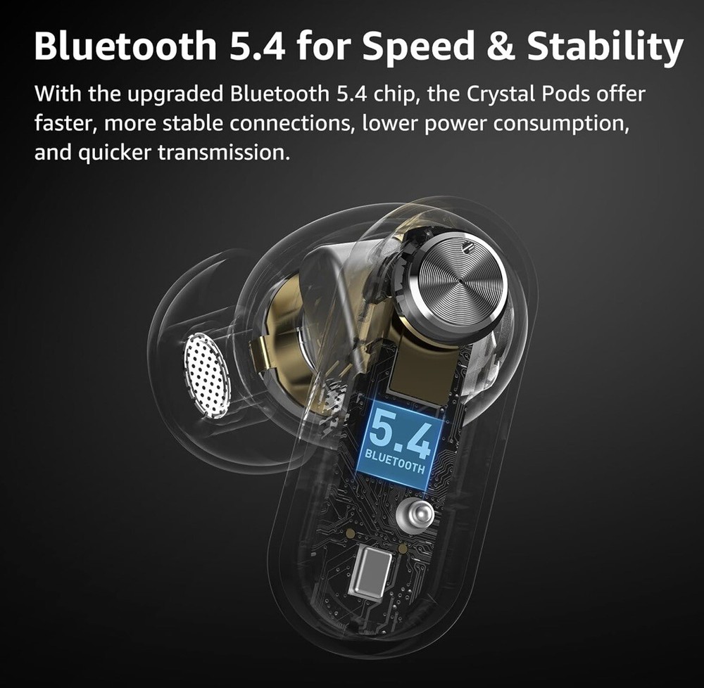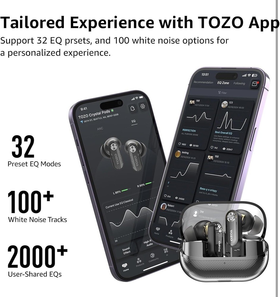 [Sleek Transparent Design] TOZO Crystal Pods features a stylish transparent charging case and earbuds design, combining modern aesthetics with advanced technology, making this bluetooth earbuds a perfect accessory for on-the-go use. [Hybrid Active Noise Cancelling] With a maximum noise reduction depth of 38dB, you can lose yourself in your favorite songs without any distractions from the outside world. [Dual Mics AI Call Noise Cancellation] 2 built-in mics and an AI algorithm work together to pick up your voice and eliminate ambient noise so that you can enjoy clear call wherever you go. [Immersive Stereo Sound] TOZO Crystal Pods have oversized 10mm drivers and an exclusive OrigX Acoustic 2.0 sound technology that deliver powerful bass and delicate treble, bringing you into an immersive musical feast. [35 Hours Long Playtime & Fast Charging] With ANC off, TOZO Crystal Pods offers 7 hours of listening time on a single charge, which can be extended to 35 hours with the charging case. With ANC on, TOZO Crystal Pods offers 6 hours of playtime, and 30 hours with the charging case. That's enough playtime to enjoy up to 500+ songs or attend 35 meetings. If TOZO Crystal Pods wireless earbuds are low on power, a quick 10-minute charge will give you more than 2 hours of playtime. [Personalized Listening Experience] Use the TOZO app to customize the controls and choose from 32 EQ presets. You can also share the joy of custom equalizers with over 2,000 audiophiles from around the world in the ‘EQ Zone’. [IPX5 Waterproof] TOZO Crystal Pods earbuds are feature an IPX5 waterproof rating, making them resistant to water and sweat, making them perfect for workouts, outdoor activities, and daily use. [Bluetooth 5.4 Technology] Equipped with an advanced Bluetooth 5.4 chip which offers an impeccable connection speed and stability. It also supports low latency, so whether you're watching a film or playing a game, the sound and picture are in sync.