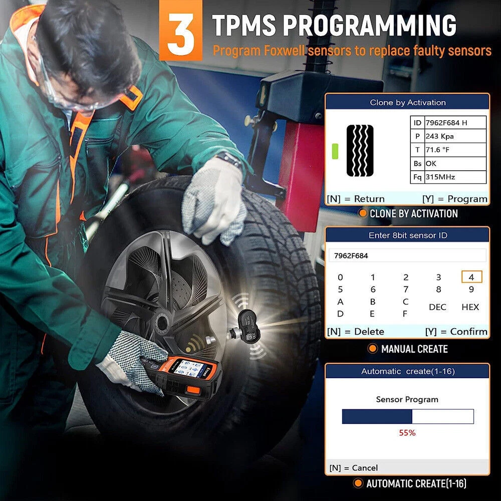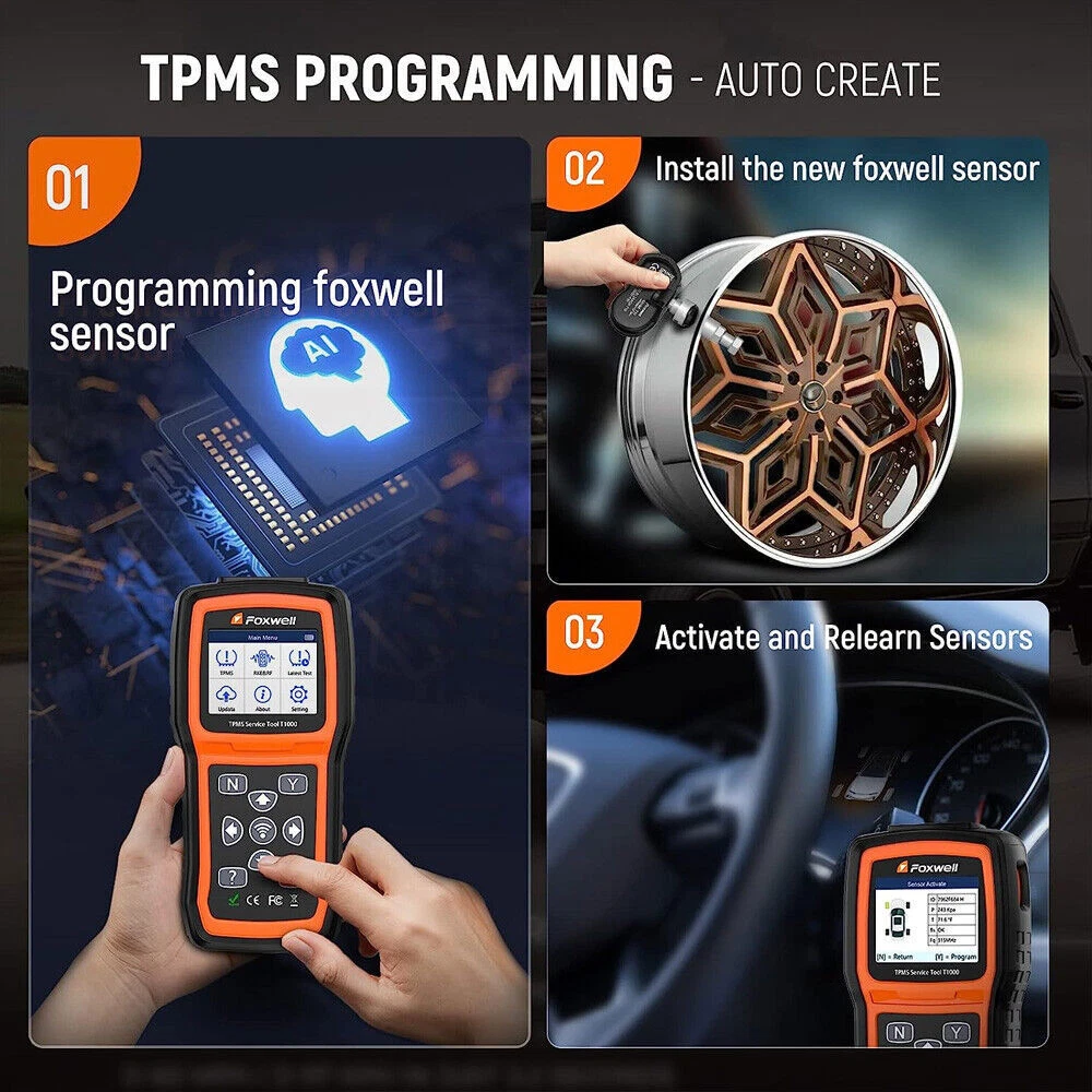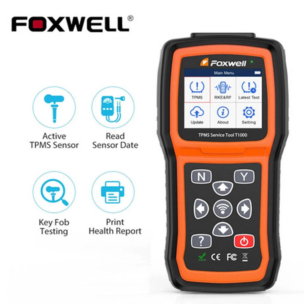 FOXWELL T1000-Professional TPMS Relearn Tool with sensor activation and programming Why Monitor Tire Pressure? Tire Pressure Monitoring helps drivers to properly maintain their vehicle tires, improves vehicle safety and fuel efficiency. 33,000 crashes are a result of under-inflated tires. 75% of roadside flats are caused by a slow leak or under inflation. 35% of drivers admit to never checking tire pressure. NHTSA estimates TPMS could save as many as 660 lives annually. What will you do when you notice the illuminated TPMS warning light? ✘ - Ignoring the warning light will cause you are risking tire failure or even serious injury. ✘ - Going to the workshops for a comprehensive check is effective, but it will cost more than your budget. ✔ - A FOXWELL T1000 costs little of the money to check TPMS in a workshop and it can perform the same professional functions as well. FOXWELL T1000- Professional TPMS Relearn Tool with sensor activation and programming- It's 2021 new generation FOXWELL TPMS service tool to activate OEM/Universal TPMS sensors, retrieve TPMS sensor data (sensor ID,tire pressure, temperature, battery condition and OE part number), relearn 98% sensor IDs, program FOXWELL T10-sensor to replace bad sensors and testing RF Remote Keyless Entry Key Fob. Activate 98% OEM/Universal TPMS sensors: in All wheel mode and in Single wheel mode. Programming FOXWELL T10 Sensors: Copy by Activation; Manual Create; Auto Create. 3 TPMS Relearning Methods: self learning; indirect learning; static learning. Fast Reading Sensor Data: Include sensor ID, tire pressure, temperature, battery, frequency and etc Key Fob Testing Tool: precisely test 315MHz and 433MHz key fobs to ensure whether it is perfectly running Solid and Rugged Construction: it's well-constructed with materials designed to handle harsh work environment Intuitive and Easy Instructions: easy to navigate and operate with clear instructions and detailed user manual Protective Blow Molding Box: will be top gift idea with original carrying case and prevent your scanner from damage Save your Time and Money: solve the TPMS issues easily with this TPMS tool without going to dealership Programming FOXWELL TPMS Sensors Note: This TPMS programming function can only work with FOXWELL T10 sensor. With this TPMS programming tool, you can program FOXWELL exclusive T10-sensor to meet the specifications of a particular vehicle before new sensor installation and relearn. Therefore, the healthy T10 Sensors can measure tire pressure and temperature accurately, allowing you to know tire health conditions, which can replace more than 95% of the original or OEM sensors. 3 different sensor programming methods are supported by This FOXWELL TPMS programming tool T1000: Copy by Activation; Manual Create; Automatic Create. ( Note: T1000 only program a replacement sensor only if it is the FOXWELLT10 sensor. ) Copy by Activation If your original sensor works and can be activated. You could use this method to program a new sensor. It will clone the original ID to the new FOXWELL T10 sensor. The Clone By Activation function lets users automatically write in the retrieved original sensor data to the FOXWELL Sensor which is used after the original sensor is triggered. 1)Highlight TPMS from the Main Menu and select the vehicle model as need. 2) Select Programming--Clone by Activation from the available menu. 3)Place the t1000 tool near the original sensor to be copied and press Activate to continue. 4)After trigger successfully, press Y to continue. 5)Place a new FOXWELL sensor near the TPMS tool (around 0-20 cm).6)Press Y to start the programming when the tool detect the sensor.7) Press N to exit after the programming successfully. Copy by Manual Input: If you know the original sensor ID, you could input the ID to program new sensor. The Manual Create function lets users to input the sensor ID manually. Input sensor ID. 1)Highlight TPMS from the Main Menu and select the vehicle model as need. 2)Select Programming--Manual Create from the available menu.3)Input the sensor ID in the dialog box and press Y to continue.4)Place a new FOXWELL sensor near the TPMS tool (around 0-20 cm).5)Press Y to start the programming when the tool detect the sensor.6)Press N to exit after the programming successfully. Auto Create 1-16 Sensors If you don't know the original sensor ID or your original sensor was bad, you could choose this method. Intall new sensor ID--program new sensor-->perform tpms learning and let the car recognize new sensor After programming the new sensor, you need to perform tpms learning function to learn the new sensor ID to your car. The tpms learning method will vary on specific car models.(the car shown in our video is cadillac XT5, and it's using static learning method.) The tpms tool will show you what kind of learning method you car will apply. The Automatic Create function is to program FOXWELL sensors by applying random IDs created according to the test vehicle when it is unable to obtain the original sensor ID.1) Highlight TPMS from the Main Menu and select the vehicle model as need.2) Select Programming--Automatic Create from the available menu.3) Place new FOXWELL sensors(1-16) near the TPMS tool (around 0-20 cm).4) Press Y to start the programming when the tool detect the sensor. 5) Press N to exit after the programming successfully. Note: T1000 only program a replacement sensor only if it is the FOXWELL brand. Almost all tpms programming tool in thie field have the same limitation. For example, if you purchase tpms programming tool from B brand, you should also purchase B brand sensor to peform this TPMS programming function Activate Almost All TPMS Sensors This FOXWELL TPMS scan tool T1000 enables you to activate 98% known OEM/Universal TPMS sensors in the market. You can rapidly and accurately trigger and decode sensors to read their ID, pressure, temperature, battery, frequency and OE Part number before servicing the tires/wheels or when you