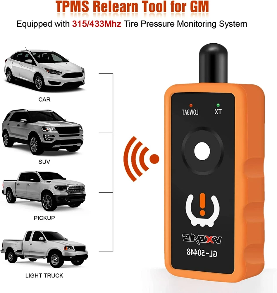 【FOR GM TIRE PRESSURE RELEARN TOOL】: GL50448 is an essential tool as tire pressure sensor replacement, tire pressure alarm remover tires.Works for GM 2006-2024(Chevy/Buick/GMC/Opel) 【EASY TO USE】2024 Updated Version GL50448 is simple, fast and easy to use, can help you reprogram all tire pressure easily within only 3 steps. Activates the individual TPMS sensors within 1-2 Mins by pressing one button 【SAVE TIME AND MONEY】Save your almost 20-80$,Activate Easily within 1-2 Mins.Much better than going to the dealer or a tire store just to get your pressure sensors reset 【UPGRADED VERSION】Sensitive sensor, Circuit Optimal Design, Easy to use, Activates the individual TPMS sensor with the press of one button.Ensure that the vehicle is in the relearn mode, and following the service procedure. Hold tool against the sidewall of the tire, near the valve stem. Depress press button while holding the tool against the tire sidewall 【FRIENDLY TIPS】1.Make sure to hold the battery in place ,or it will not work 【if you have a Excessive Installation problem about the battery,please Press down on the battery contact 2.When using tpms relearn tool , please make sure antenna in correct position 3. 9V battery should be in good condition,4.When activation of a tire is finished,sometimes the horn or flashing will feedback Product Description The video showcases the product in use. The video guides you through product setup. The video compares multiple products. The video shows the product being unpacked. Say goodbye to costly professional assistance and unnecessary trips to the auto shop! The VXDAS TPMS Relearn Reset Activation Tool is specifically designed for GM series vehicles (Chevy, Buick, GMC, Opel, Cadillac, etc.) from 2006-2023 equipped with a Tire Pressure Monitor System (TPMS) sensor. Exceptional build quality and durability for long-lasting use Friendly, recyclable materials for a sustainable choice Vibrant orange color For easy visibility in the garage, ensuring it's instantly recognizable and dirt-resistant 1 Factory Tested Models 2 Customers Tested Models 3 Quality 4 Materials 5 Bright Why You Need VXDAS TPMS Do tire rotation, didn’t have a quick and easy way to let ECU relearn new tire information New TPMS sensors installed, letting air out or adding air in to the tire couldn’t make the system recognize new sensors Low tire pressure or leakage / replacement or installation of tire pressure monitoring equipment / tire replacement, sensor damage, etc. After those problems are solved, TPMS needs to be reset When the tire pressure indicator light is ON, after the maintenance is performed, the tire pressure needs to be reset to turn off the TPMS light Exchanging the winter tires or Summer tires Follow the Instructions to Relearn Your TPMS Sensors: Placing a new 9V battery The battery is not included in the package The magnitude of the battery voltage affects the signal strength of the product TPMS learning mode Please reset the TPMS in the correct mode. CORRECT Position Point antenna on correct position The position of the tires is also important, Front tires have to be straight. Right Order Front left, front right, rear right, rear left Please make sure the antenna fits in the CORRECT position. 1 Step1 2 Step2 3 Step3 4 Step4 Quality Carefully Tips before Using: Equipped with 315/433MHz tire sensor. And A 9V Battery is needed, but is not provided. Please reset the tire pressure monitoring system in the correct mode Please make sure to use a Brand NEW 9V battery, the battery is not included in the package, and the magnitude of the battery voltage affects the signal strength of the product. Please make sure the antenna fits in the CORRECT position. The position of the tires is also important, Front tires have to be straight. Not for heavy trucks with more than 4 tires. The TPMS tool is unable to reprogram sensors, it's a tpms reset tool. Do the tire reset outside instead of in the garage. For different vehicles Super GL50448 may need different times to reset all of your tire sensors after rotation. Sensors should be original OEM sensors which well programmed. Choose Your Right Car Tool Add to Cart Add to Cart Add to Cart Add to Cart Add to Cart Add to Cart Customer Reviews 4.4 out of 5 stars 7 4.0 out of 5 stars 398 3.9 out of 5 stars 49 4.1 out of 5 stars 983 4.1 out of 5 stars 983 4.1 out of 5 stars 2,052 4.4 out of 5 stars 1,514 Price $42.99 $ 42 . 99 $24.99 $ 24 . 99 $28.90 $ 28 . 90 — $15.99 $ 15 . 99 $12.91 $ 12 . 91 $19.99 $ 19 . 99 For GM &F0RD ✔ ✘ ✘ ✔ ✔ ✘ ✔ For GM ✔ ✔ ✔ ✔ ✔ ✘ ✔ For F0RD ✔ ✘ ✘ ✔ ✔ ✔ ✔ Digital Tire Pressure Gauge ✔ ✔ ✘ ✘ ✘ ✘ ✘ fOR motorcycles, and bicycles. ✔ ✔ ✘ ✘ ✘ ✘ ✘