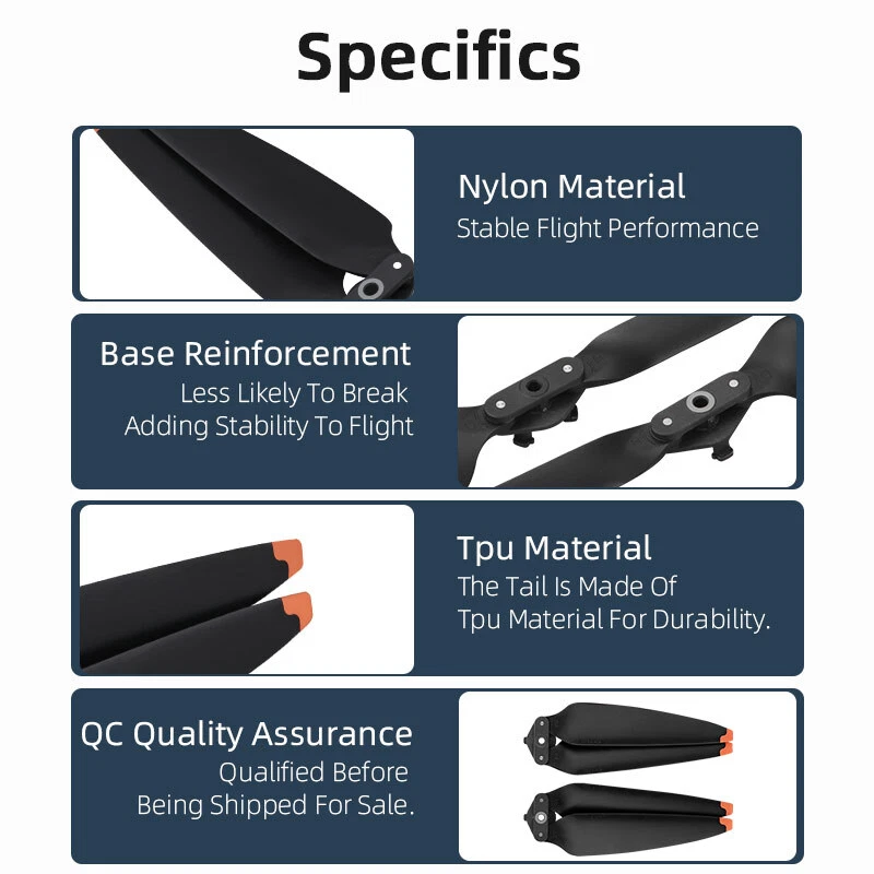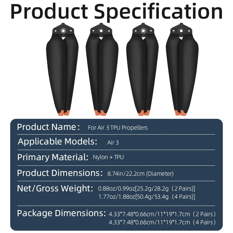 Product Description If you have any questions, please contact customer service first, do not open disputes easily, thank you! Feature: 1. High toughness material, high aerodynamic efficiency; 2. low power consumption, high endurance; 3. Classic quick release design, press and rotate, one second quick installation; 4. Precise measurement of open mould to build. Specification: Material: Nylon+TPU Applicable models:For DJI Air 3 Color: Orange Net weight: 0.88oz(25.2g)(2 Pairs) Package weight: 0.99oz(28.2g)(2 Pairs Product size: 8.74in(22.2cm)(diameter) Package size: 4.33*7.48*0.66cm(11*19*1.7cm)(2 Pairs) Packaging includes: 2 pair*Propeller Note: 1.Does not include Air 3, 2.Transition: 1cm=10mm=0.39inch, 3.Please allow 1-3mm error due to manual measurement. please make sure you do not mind before ordering, 4.Due to the difference between different monitors, the picture may not reflect the actual color of the item,please make sure you do not mind before ordering, Thank you! About Us We accept all payments authorized by eBay. powered by