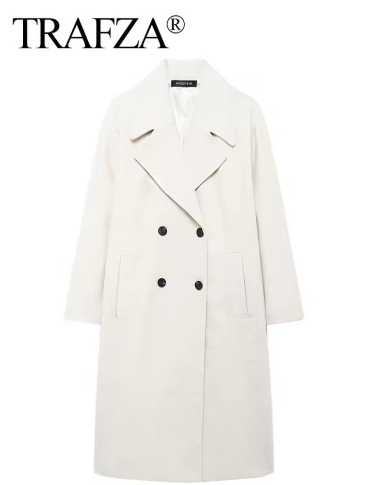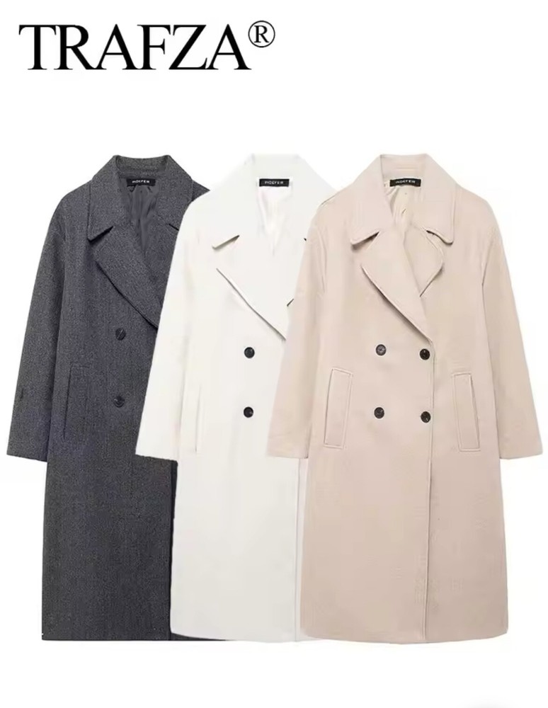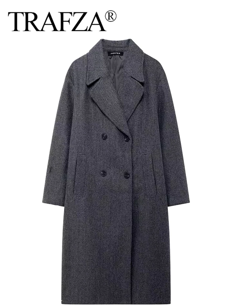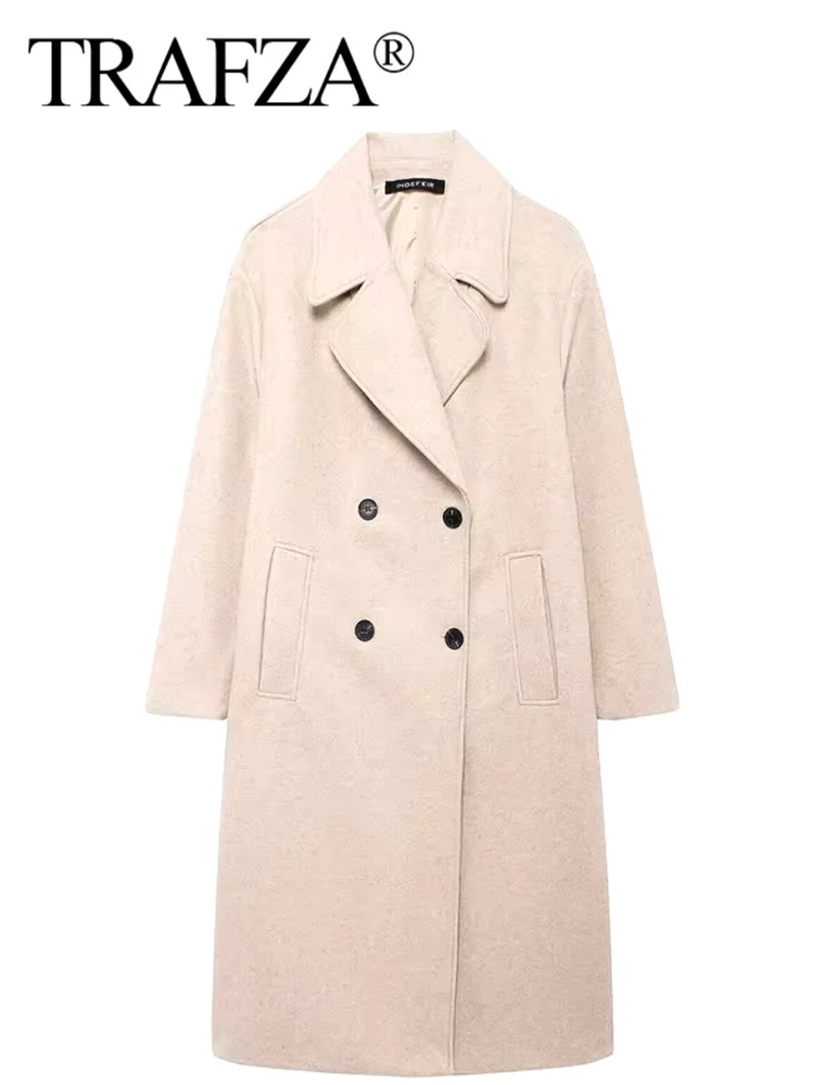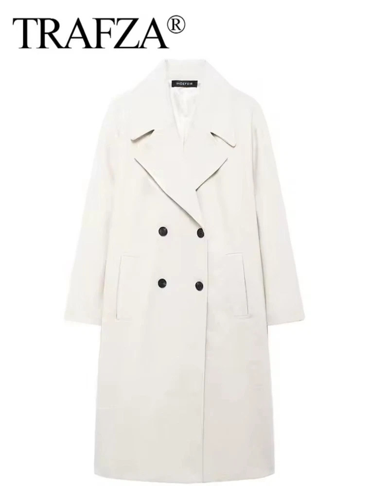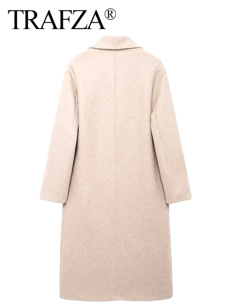 This TRAFZA women's winter coat is a stylish and warm choice for the season. Made of polyester, it features a double-breasted design with long sleeves and a lapel. The long length and formal style make it suitable for various occasions, from workwear to parties. Designed perfectly for staying comfortable and chic during the winter months.