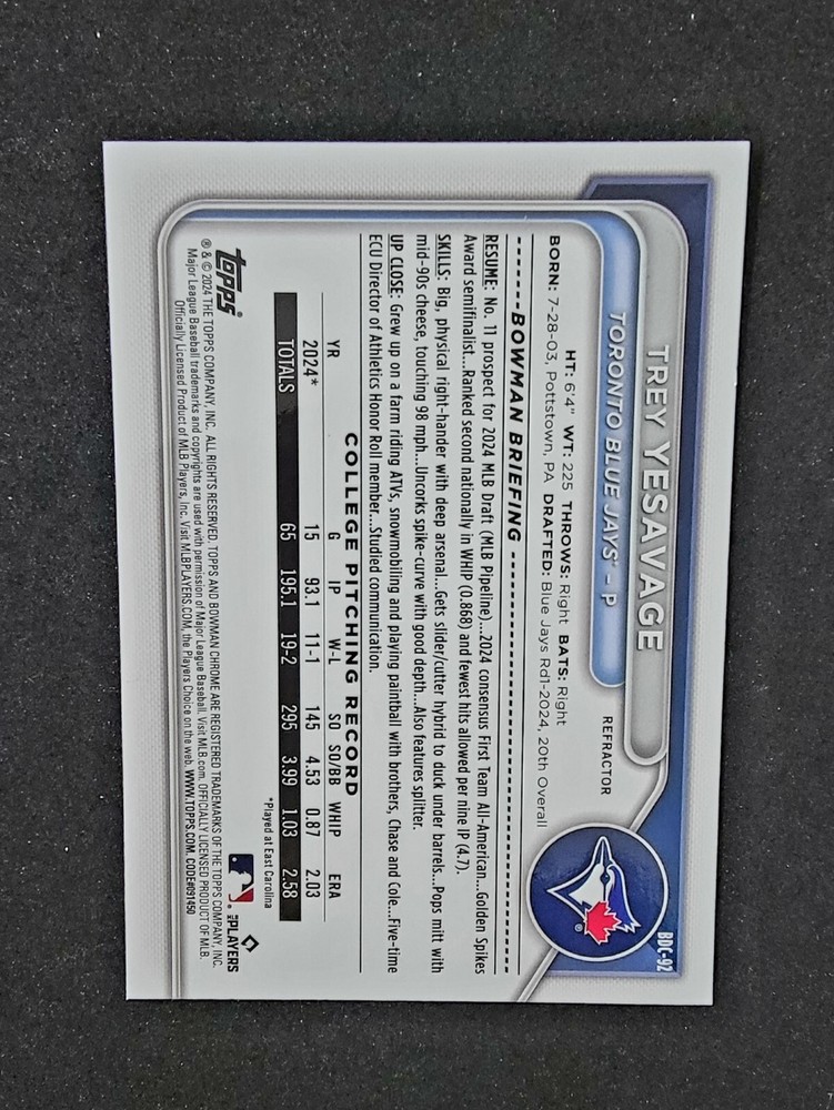 TREY YESAVAGE 2024 Bowman Chrome Draft BDC-92 1st Bowman Refractor Card