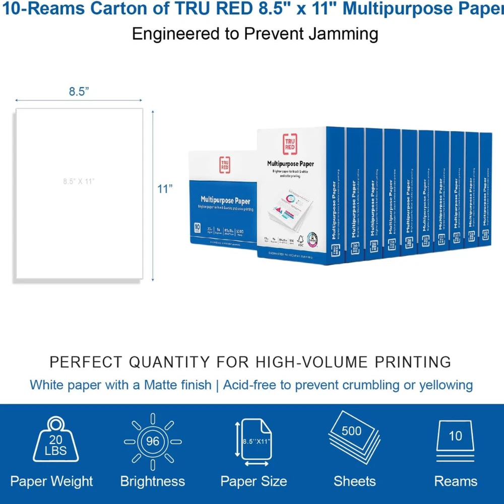 SHIPPING & CUSTOMER SERVICE INFORMATION ๐ฆ โ We ship from the USA within 3โ10 business days. โ Free Shipping โ Free Returns โ Money Back Guarantee โ No extra fees, no import tax โ the price you see is the final price! If you see any message asking you to pay import taxes, please ignore it . Rest assured that all costs are already included in the listed price. ๐ซ We do not ship to warehouse addresses or PO boxes , as this may result in lost packages. Please provide a valid residential or business address. ๐ If you experience any issues with your order, please contact us directly via eBay message. โ ๏ธ Do not open a dispute โ once a case is opened, we are unable to assist. Direct communication allows us to resolve your issue faster and more effectively. Thank you for shopping with us! Feel free to reach out anytime if you have questions. Staples TRU RED Printer Paper, 8.5" x 11" -inch, 20 lbs., 96 Brightness Rating. Matte White Paper Finish (500 Sheets/Ream, 10 Reams/Carton) Brand STAPLES Color White Item Weight 50 Pounds Paper Finish Matte Sheet Size 8.5-x-11-inch About this item Experience stunning color prints with TRU RED's multi-purpose printing paper. Designed specifically for color printing, this paper delivers exceptional results for your diverse printing needs. Available in 8.5" x 11" (US Letter) sheet size, it's a multiuse paper for black and white as well as colored prints. Also, it's a perfect companion for laser and inkjet printers. 8.5" x 11" Multipurpose Paper, 20 lbs., 96 Brightness, 500 Sheets/Ream, 10 Reams/Carton (TR56962). About this product Get a reliable solution for vivid color printing with this Tru Red 8.5" x 11" white, multipurpose paper. Stock up on this white printer paper that is specifically made for color printing. The 96 brightness rating delivers crisp color images and text, while the 20 lbs. paper weight is engineered to prevent jamming in your copiers and printers. Use this letter-size paper for everything from internal correspondence to presentations. Including 5000 sheets in the package, this Tru Red 8.5" x 11" white, multipurpose paper is ideal for printing both black and white and color. Multipurpose printer paper, brighter for black & white and color printing Paper weight: 20 lbs. Sheet dimension: 8.5" W x 11"L (US Letter) Brightness rating of 96 for sharp, clear print results White paper with a matte finish 500 sheets per ream, 10 reams per carton, 5000 sheets total Paper is acid-free to prevent crumbling or yellowing Meets or exceeds FSC standard Engineered to prevent jamming Designed for laser and inkjet printers Packaging may vary Features ColorLokยฎ Technology Specifications table Attribute name Attribute value environmental EcoID Yes, product meets Staples criteria for environmental features to earn the Eco-ID mark. Learn more at EcoIDProgram.com Forest Stewardship Council certified Yes features Brightness 96 Hole Punched No Copy & Printer Paper Finish Matte quantity Selling Quantity 1 Total Number of Sheets 5000 Sheet Quantity 5000 and Above Selling Quantity (UOM) Carton Sheets Per Ream or Pack 5000 Number of Reams 10-Ream size & weight Paper Weight (lbs.) 20 Paper GSM 75 Width in Inches 8.5 Bond Paper Weight (lbs.) 20 Length in Inches 11 Sheet Dimension 8.5" x 11" (US letter) type Paper Type Multipurpose Color Family White Acid Free Acid Free True Color White