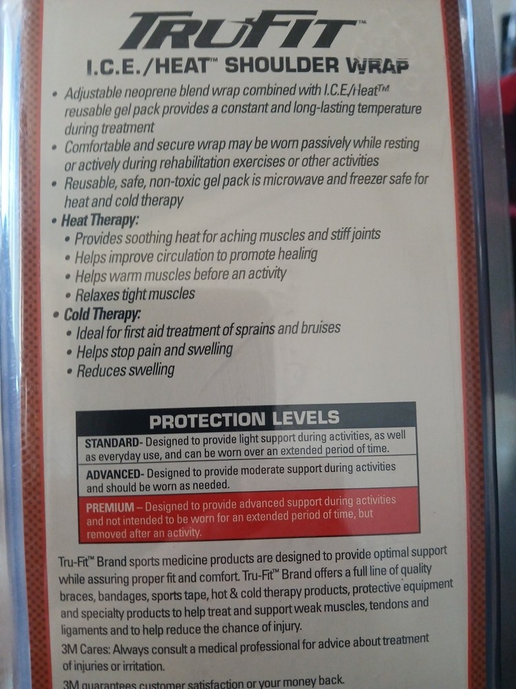 Adjustable neoprene blend wrap combined with reusable gel pack for ice or heat. Comfortable and secure wrap may be worn passively while resting or actively during Rehabilitation exercises or other activities, reusable safe non-toxic chill pack is microwavable and freezer safe for heat and cold therapy