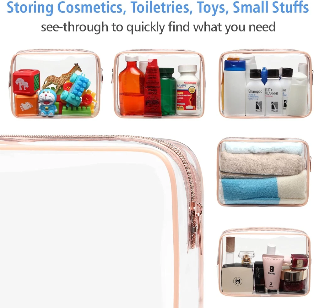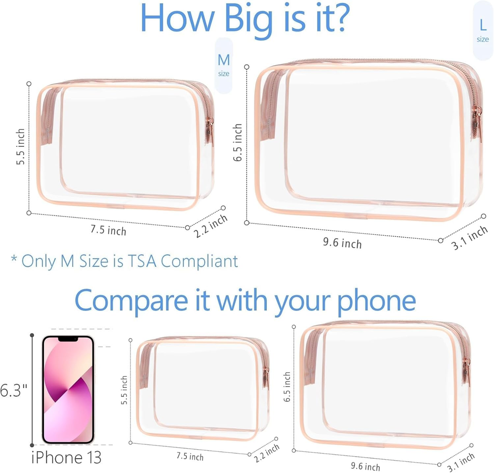 Description: π TSA Approved Travel Toiletry Bag β Your Go-To Travel Companion This TSA Approved Travel Toiletry Bag is designed to simplify your travel experience, allowing you to quickly and easily pass through security screenings at the airport. Perfect for both domestic and international flights, this bag complies with the TSA's 3-1-1 liquid rule , making it an essential addition to your travel essentials. π Specifications: Size: 7.5 x 5.9 x 2.2 inches Material: Thick Transparent PVC Plastic π‘οΈ TSA 3-1-1 Compliant β Hassle-Free Security Screening β Fully compliant with TSA 3-1-1 liquids rule , making it the perfect bag for carry-on items during travel. β The transparent PVC material allows security staff to quickly see the contents and helps you pass through security with minimal delay . β Convenient for both domestic and international travel . π Durable Zipper & Sealed Seams Smooth Zipper: The high-quality zipper glides easily without getting jammed, and the large zipper opening ensures easy access to your toiletries and cosmetics. Reinforced Seams: The seams around the zipper are sealed and reinforced , preventing the bag from splitting and reducing the chances of liquids leaking out. (Please note: the zipper itself is not waterproof.) πΏ Reusable & Eco-friendly Easy to Clean: Simply wipe down with a wet cloth, and your bag will be good as new, ready for your next trip. Eco-conscious design makes this bag a sustainable choice for travelers who want to minimize waste. Travel Light, Travel Smart! This TSA-approved travel toiletry bag is your trusted companion for smooth security checks and a clutter-free travel experience . Keep your toiletries organized, stay eco-friendly, and enjoy a hassle-free journey! βοΈ