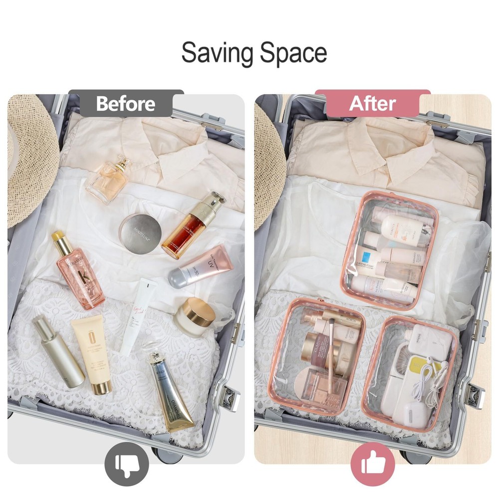 PACKISM TSA Approved Toiletry Bag - Clear Makeup Bags in 2 Size, Durable with Supporting Frame, Perfect for Travel Essentials, Carry-on Airport Airline Compliant Bag, Rose Pink TSA Approved, Meet Liquids Rule: The medium size clear makeup bag is 7.5 x 2.2 x 5.5 inch, it follows the TSA's 3-1-1 Liquid Rule published by TSA. You can quickly pass the airport security screening. Note: the large size clear bag is 9.6 x 3.1 x 6.5 inch, it is larger than one quart and is not TSA approved High-Quality, Durable: The clear makeup bags keep the shape with reinforced boning. Smooth metal zipper for longevity, ensuring a secure seal that complies with TSA regulations for sealed bags. Wide opening for easy access. A net weight of only 0.7 lbs per bag, light and feelless Robust and Long-Lasting: Our clear toiletry bags outlast the average flimsy plastic bag on the market, for it is made from 0.3 mm thick PVC. Its reinforced design features heat-sealed and metal closures, ensuring it withstands even the tumultuous travel for sustainable reuse Perfect for Travel: This clear travel bag neatly stores all travel essentials without taking up extra space in your suitcase, tote bag or backpack. Ideal for organizing travel-sized bottles, travel pouches, makeup, toiletries, and more for travel, camping, or gym use Multi-Purpose: 2 size neatly sorts various items, offering triple the tidiness. This clear cosmetic bag is up to the task as medicine organizer, tool pouches, or toy storage bags. Tip to remove the smell: After getting the bag, wipe down both the interior and exterior with a damp cloth, and then air-dry (for age 12 or above) Description TSA Approved Travel Toiletry BagStrictly follows TSA 3-1-1 liquids rule for carry-on bag of all airlines, so you can easily and quickly pass through security screening with it in the airportSpecification:Size: 7.5 x 5.9 x 2.2 inch Material: Thick Transparent PVC PlasticFollow TSA 3-1-1 Rulethe toiletry bag multifunction is fully compliant with TSA 3-1-1 liquids rule for carry-on bag, fit all airports of domestic and international travelEasy and quick to pass through the security checkTransparent material of this clear toiletry bag ensure the security staffs at the airport quickly glance at the item inside the bag, help you speed through the security screeningDurable Zipper and Sealed SeamsThe zipper is glided smoothly, not easy to be jammed, and the large zipper opening is convenient to open and pack the items.Sealed SeamsThe seams around the zipper is reinforced to seal, prevent the bag splitting easily, to effectively reduce the liquids leak out the bag (the zipper is not waterproof)Reusable and Eco-friendlyThe travel makeup bag is easy to clean. After clean it with a wet cloth, the bag will be good as new and can be used again in the next trips SHIPPING Domestic Buyers - We have confidence in our products, but if you are not fully satisfied please contact us within 30 days of purchase and you will get full refund. - We ship within 3 business days of payment, usually sooner - We offer FREE shipping on all orders! - We only ship to the lower 48 states, no APO/FPO addresses or PO Boxes allowed International buyers – please note: Import duties, taxes, and charges aren't included in the item price or postage cost. These charges are the buyer's responsibility. - Please check with your country's customs office to determine what these additional costs will be prior to bidding or buying. * Order Cancellation Policy ** You can return a product for up to 30 days from the date you purchased it. 1. The seller reserves the right to cancel the special case only due to eBay cancellation fee. 2. The decision of seller is the final. 3. The seller will respond to the cancellation request within 2 business days. Please wait for the result of cancellation. 4. In case the cancellation is not completed by some reasons, the buyer can follow the options below to get the refund. 4.1 The buyer can reject the item when it arrives. 4.2 The buyer can send the item back to the seller within 30 days If the buyer receives item (USA Shipment ONLY). The seller will provide the FREE return label to the buyer when the buyer opens " Return Item" case on eBay by using the reason as "Change my mind" ONLY. 5. When buyer has placed the order. The order will be processed and completed by automatic warehouse system within 5 minutes. In case that buyer sends the cancellation request after 5 minutes of placing the order, the request will be rejected. **Sending direct message to cancel the order is not allowed for every case.* Return Policy For the return case - If buyer would like to return the items for refund or replacement, please CONTACT SELLER to receive the free return label from seller. The refund or replacement will be processed with the tracking number of return label which is provided by seller only. The other ways of return which are not approved by seller will not be processed for the refund or replacement.