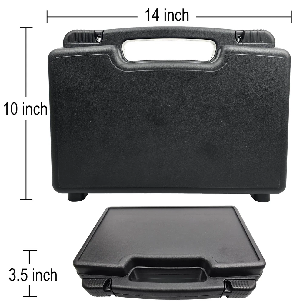 Lockable pistol case with foam liner. The egg carton upper and lower foam provide interior cushioning. The replaceable foam can be customized according to your storage needs. Double slide latches and double locking points for padlocks, TSA compliant lockable hard case. (Locks not included.) Easily holds pistols and extra magazines. Water-resistant and splash-proof plastic polymer hard shell that protects your firearm from spills. Dust proof when closed to keep your pistol clean. Case is lightweight, durable, compact and easy to transport. Compatible with most subcompact firearms such as a 1911, 9mm, or .45 caliber. Will fit paintball pistols such as the Tippmann TiPX, First Strike FSC, Byrna SD & LE, Tippmann Menace, and more! Case has an integrated carry handle. Room for magazines and other accessories. Great for transport and also for everyday storage. Outer dimensions: 14" x 10 1/8" x 3.5" Inner dimensions: 13 & 1/2" x 7.5" Weight: 1.5lbs