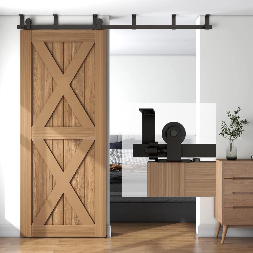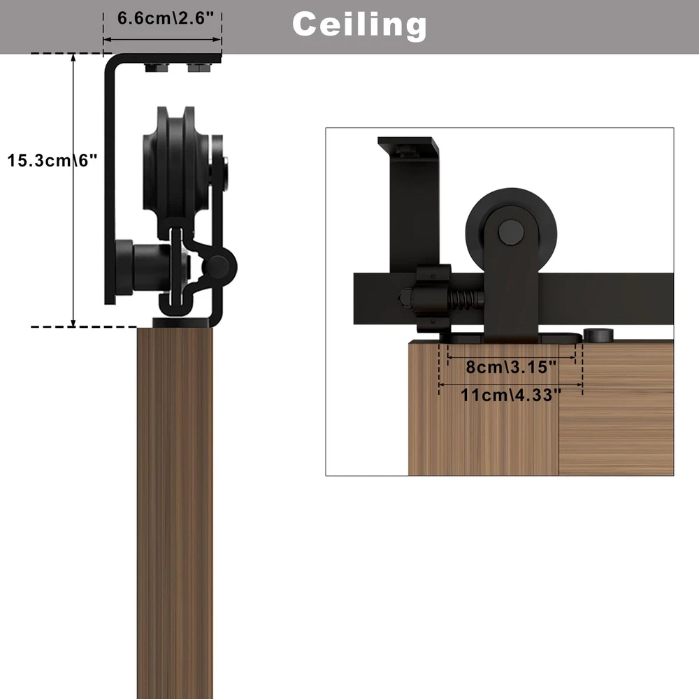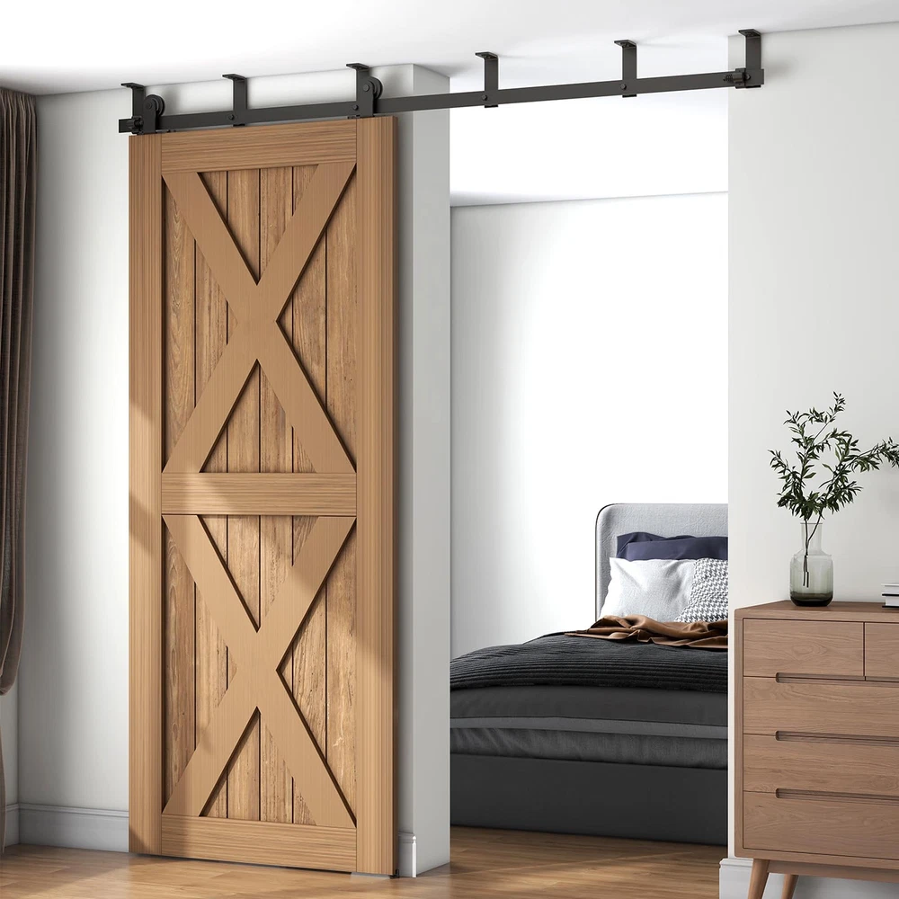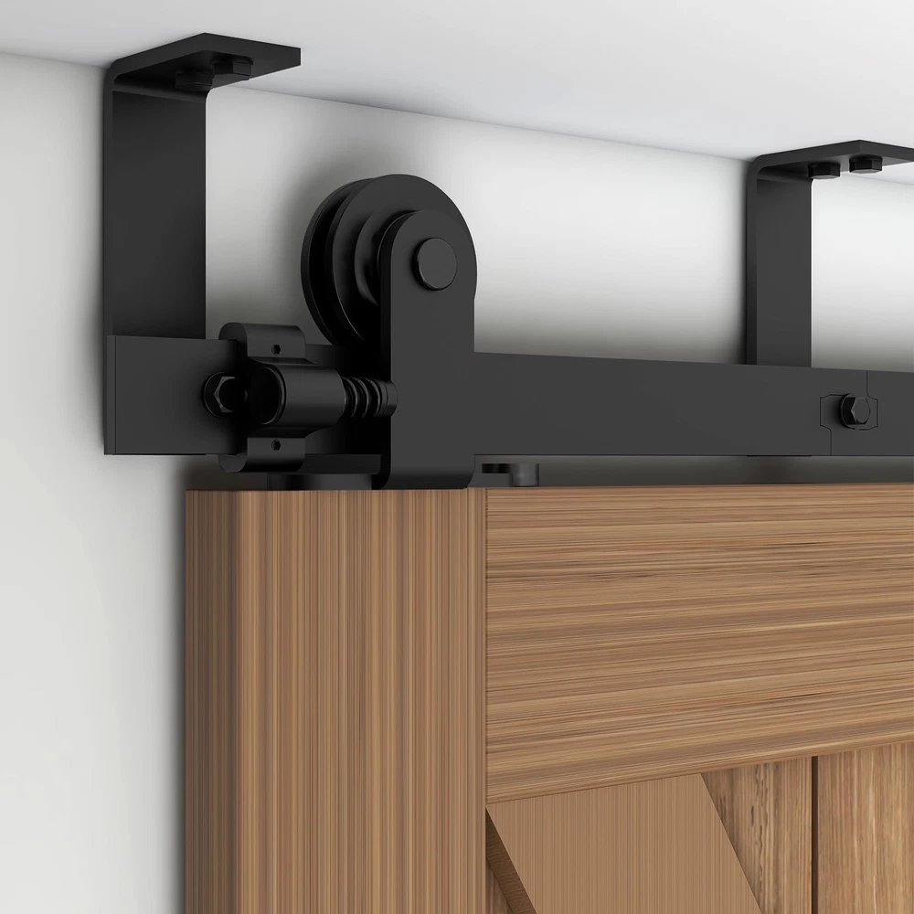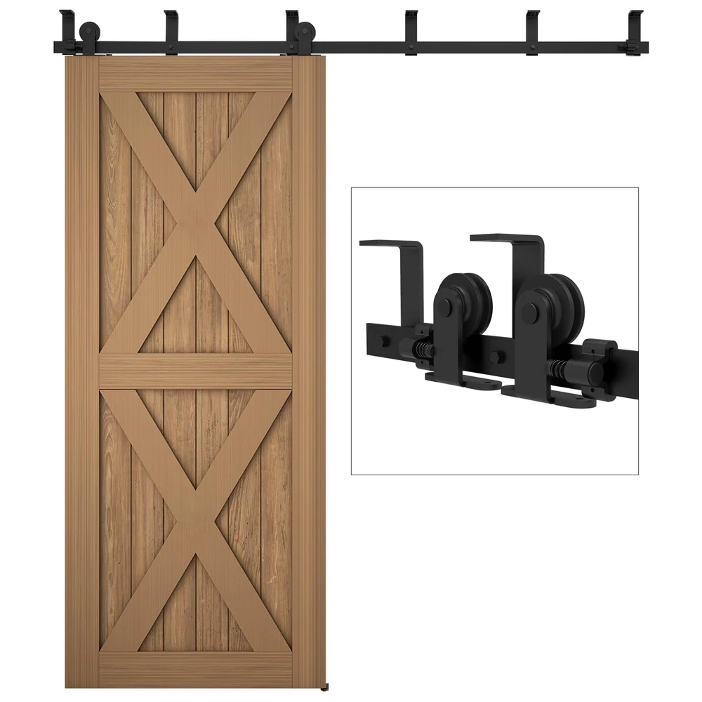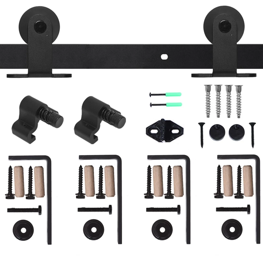 Sliding Barn Door Hardware This sliding wood door hardware kit set is a great design for home,which is a popular new way to bring innovation into the home and close off bedroom and side room in a stunningly unique way. The door is hung on a piece of hardware with a wheel. That rolls along a track mounted to the wall. Suitable for indoor decoration in barns, garages, stables, kitchen, bedroom, dressing room, laundry room, Utility room, Entertainment console, club, pub and so on. Heavy Duty Sturdy: Made of premium steel, anti-corrosion and years of beauty and longevity. Door Weight Capacity - 220lb; Fit door panel width 40"; Fit door panel thickness: 1 3/16"- 1 5/8". Package Include:Seamless Spliced pre-drilled holes rails with L-Shaped Bracket; Barn door rollers*2,door stoppers*2, floor guide*1, Anti-Jump blocks*2, door panel is NOT INCLUDED; Please reserve 6.7" space from the top of the door to the ceiling Easy to Install: Professional instruction and customer service team help you solve all installation problems in time. Save the cost of finding a carpenter or decoration team. If there is any part missed or defectived during shipping, please let us know, We will solve the problem for you as soon as possible.
