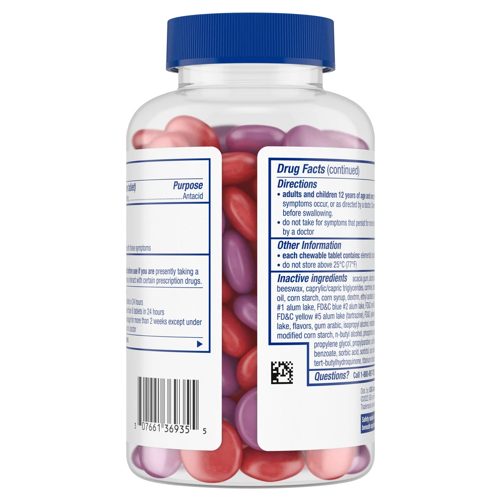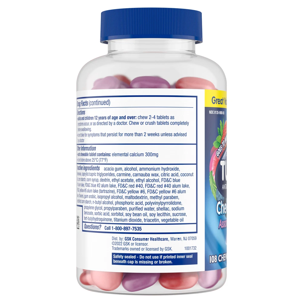 Store New Arrivals Add to Favorite View Feedback Contact TUMS Antacid Chewy Bites Assorted Berries, 108 Chewable Tablets Description Container Size 0.3 oz. Dietary Features Gluten Free Features FSA Eligible Flavor Berry Form Chewable Quantity 1 Bottle(s) Features: One bottle containing 108 TUMS Chewy Bites Chewable Antacid Tablets for Heartburn Relief in delicious assorted berry flavors (strawberry, mixed berry, raspberry) that have a tasty outer shell and soft center. This heartburn medicine treats the four signs of heartburn: burning in the chest, acid indigestion, sour stomach and upset stomach associated with these symptoms. Nothing works faster! This heartburn and acid indigestion remedy goes to work instantly by starting to neutralize acid on contact, with 50% more acid fighting power per tablet as regular TUMS antacids. These chewy antacid tablets have the active ingredient 750 mg calcium carbonate. TUMS is the #1 recommended adult antacid brand by doctors, pharmacists and OBGYNs. TUMS Chewy Bites Chewable Antacid Tablets go to work in seconds to make heartburn relief simple and delicious. Featuring the active ingredient calcium carbonate, these antacid chewable tablets relieve heartburn, sour stomach, acid indigestion and upset stomach associated with these symptoms. With a delicious outer shell and soft center, these TUMS Chewy Bites come in three assorted berry flavors. TUMS antacid tablets are the #1 recommended adult antacid brand by doctors, pharmacists and OBGYNs. These calcium carbonate tablets are gluten free. Works To Relieve Heartburn, Sour Stomach, and Acid Indigestion Gluten Free Goes Directly To The Source Of Your Heartburn Take 2-4 Chews Per Day ABOUT US We offer the best prices around on high quality products. Our E-store includes media such as books, movies, music and games while offering electronics, toys, sporting apparel, clothing, tools, general home, garden items and more. SHIPPING We are always working hard to ensure your package arrives as soon as possible. Please understand that some factors like weather, high postal traffic, and the performance of shipping companies are outside of our control. We offer free shipping to the lower 48 states and ship within 2 business days of payment, usually sooner. We do not accept P.O. Boxes. Please provide a physical address. RETURNS We offer a 30-Day Return Policy on items which you are not completely satisfied with. You have the option for a full-refund or an exchange of the item. No returns are available on items shipped outside of the USA. PAYMENT We accept PayPal. CONTACT US This page content is yet to come Please ad us to your favorite seller and visit again later Thank You CUSTOMER SATISFACTION We try our very best to make sure every customer is completely satisfied. If there's a problem, message us! We're happy to help.