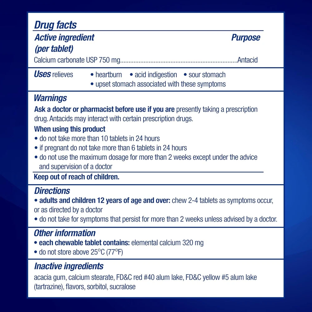Product Description TUMS Chewable Sugar Free Antacid Tablets offer all the extra strength power of TUMS, without any sugar. These sugar free antacid chewable tablets contain 33 percent more acid fighting power per tablet as TUMS Extra Strength, so you can forget your heartburn and get back to the moments that matter. Each TUMS chewable antacid contains 750 mg calcium carbonate to quickly and effectively provide heartburn relief, sour stomach relief, acid indigestion relief and relief of upset stomach associated with these symptoms. TUMS heartburn medicine neutralizes acid on contact, giving you fast relief. With pleasant melon berry flavors, these sugar free heartburn tablets are also refreshing. Adults and children 12 years and older may chew two to four calcium carbonate tablets as symptoms occur or as directed by a doctor. Known as a trusted brand to fight heartburn fast for 90 years, TUMS is America’s number 1 antacid and the number 1 physician, pharmacist and OBGYN-recommended adult antacid brand. TUMS antacid tablets help you love food back.