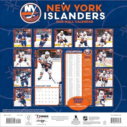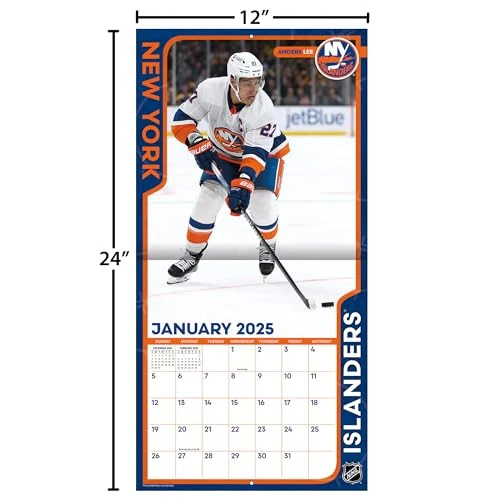 This wall calendar is a must-have for any die-hard New York Islanders fan! Made for passionate hockey fans, the New York Islanders Wall Calendar includes poster-sized action shots of your favorite players from the team in stunning, full-color photos! Each month also includes professional athlete bios and visually appealing graphics featuring team colors and logos. Made with exceptional quality, the 12x12 calendar also includes bonus pages that feature Sept. - Dec. 2024 and the past Stanley Cup Final results! 12-month format (January - December 2025). Dimensions: 12"w x 24"h (opened). 12-month format ( January - December 2025) Full-color, superstar action photos Includes interesting team and player facts Bonus page featuring September - December 2024 Size: 12"w x 24"h (opened)