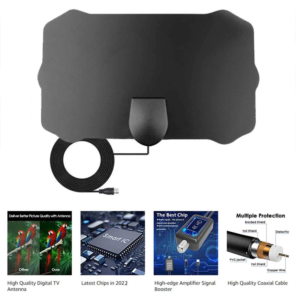 Hello! Welcome to nyplatform ! Fashion design,100% Brand New,high quality! Quality is the first with best service. customers all are our friends. Great HDTV indoor antenna! You will be amazed at the performance! This antenna gives you crispy clear HDTV 1080p 4K picture and a lot more channels. It takes only few minutes to start watching HD channels! This antenna works up to 5600 miles away from the station!!! It is flat, comes with stickers to hang it and doesn't take up a lot of room and does not falling down. It pulls in a lot of channels with great reception.?For example, the HD channels are usually better than the Sky HD. Extremely easy to use: just hit the set up / search channels on your TV and that's it. (1)Support 1080p HD 4K !!! (2)5600miles range !!! (3)Coaxial Cable: 4M length (4)Connector Type:F - head with TV adapter (5)V.S.W.R.:<=1.5,Max:1 (6)Impedance:75Ohm (7) Multi-directional capability (8)call out all "Free" channels (9)Gain:25 dBi(with amplifier) (10) Conventional antenna panels are divided into white, black, transparent, support for samples and drawings to order (11)Working Frequency: 174~240MHz,470~862MHz (12)Product size(MM):220*130*0.65 (13)Mounting Paste (14)Radome Color Black (15). Operation Temperature : -45 ~ 85℃ (16). Storage Temperature : -45 ~ 85℃ Package_Contents Antenna with 9.8FT coaxial cable x1 Signal amplifier +3.3FT cable x1 On Jun 1, 2025 at 02:56:13 PDT, seller added the following information: