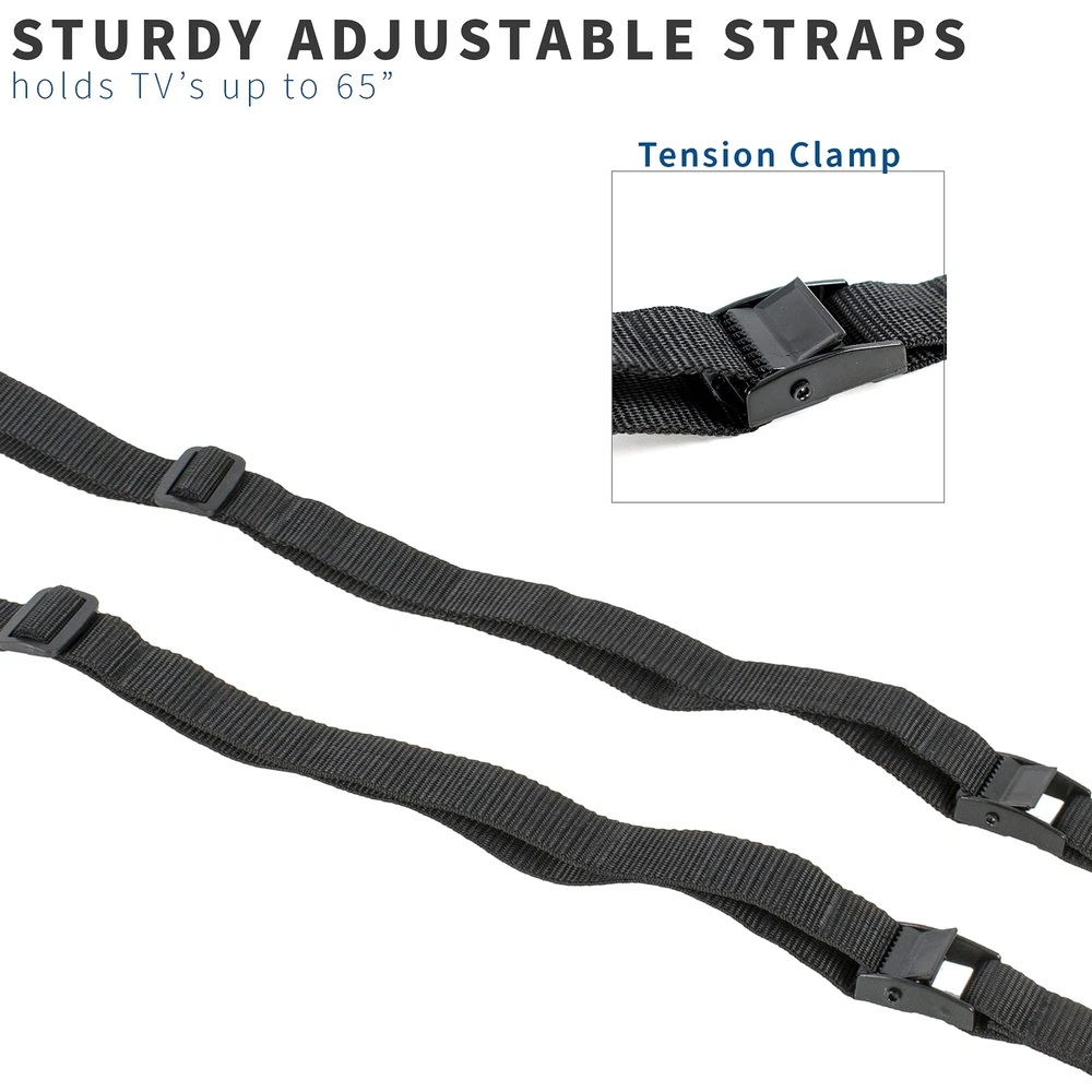 Heavy duty anti-tip cable straps from . STAND-SK02 is especially useful for flat screens within arm’s reach or in areas of high traffic and is an essential tool in preventing tip-overs causing accidents and injuries. The dual cables work with any flat panel TV up to 65”. The kit attaches your TV directly to wood stud walls, concrete walls, brick walls, or the entertainment centers underneath the TV, and the cables are adjustable using the tensioning clamp. All of this is done with the provided mounting kit which includes all necessary hardware and screws required for assembly. Compatibility Works with any flat screen TV up to 65" in size Attaches to wood stud walls, solid concrete walls, and brick walls Can also be attached directly to table or entertainment center supporting TV Features Heavy duty twin straps that protect TV from tip-over accidents Optimal for TV's within arm's reach or areas of high traffic Straps are simple to adjust with tensioning clamp Two adjustable cables and a complete hardware kit are provided Heavy Duty - Twin cable straps with steel mounting components that prevent TV tip-over accidents. Works with any flat panel TV up to 65", and the straps attach to the VESA on the TV Setup Options - Attaches to wood stud walls, solid concrete walls, and brick walls. Also can be attached directly to table or entertainment center holding TV Busy Environments - This solution is ideal for TV's within arm's reach or in areas of high traffic Adjustability - Durable cable straps are easily adjustable using tensioning clamp Assembly - Includes two adjustable cables and a kit complete with all necessary hardware. TV mounting screws include sizes M8x20, M8x14, M6x12, M5x12, and M4x12. Easy to install