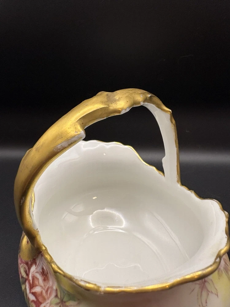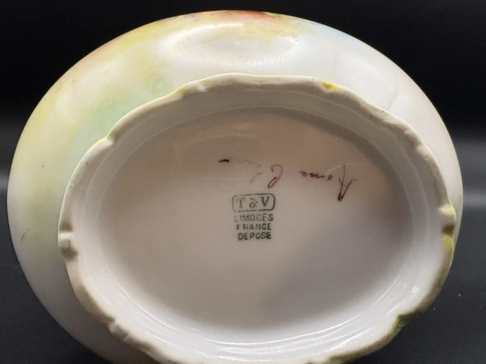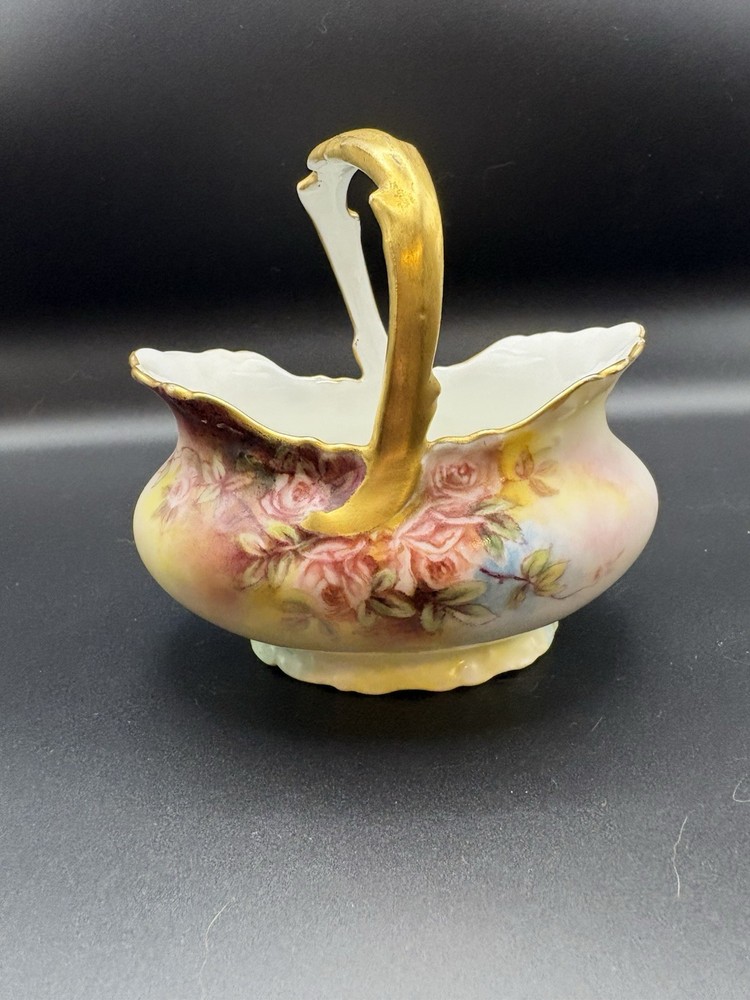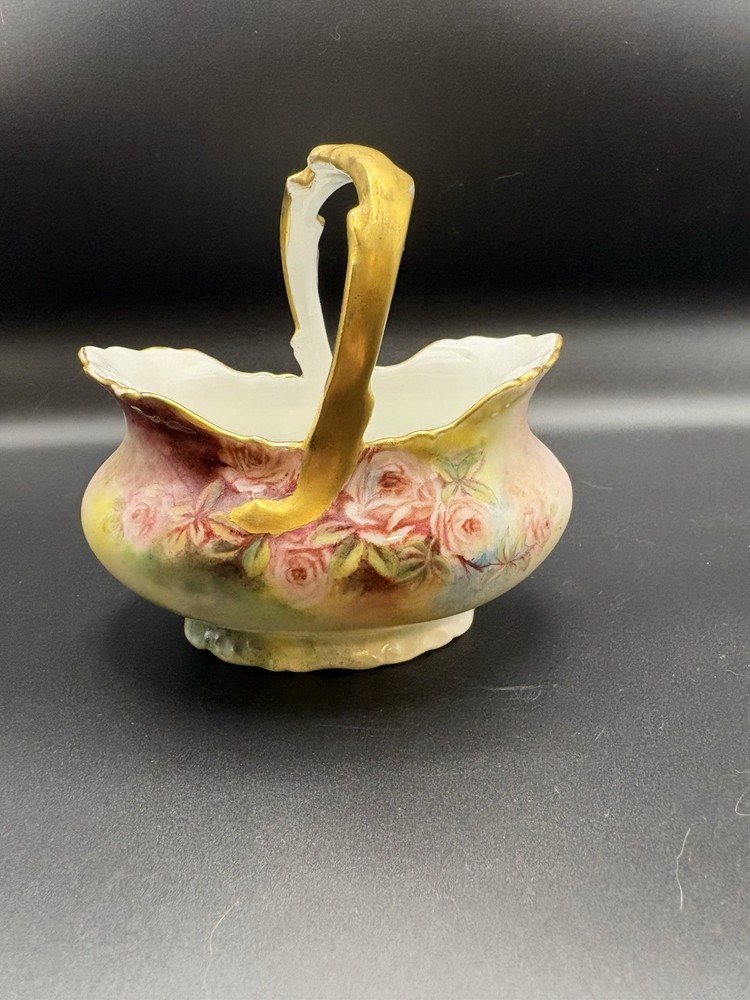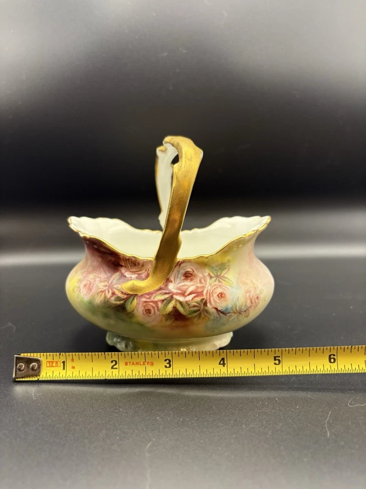 This product is a T&V Limoges Porcelain Hand Painted Basket, originating from France. The basket features intricate hand-painted details, with a gold accent and a beautiful rose flower design. Made from high-quality porcelain, this original piece showcases the craftsmanship and elegance of Limoges, making it a unique and exquisite addition to any collection or decorative display. There is some slight fading on the gold of the handle. The item is signed on the bottom by All items are sold as is. We do our best to photograph any imperfections and list marks, scratches, or any other damage in the description. If you have any questions regarding an items condition please feel free to send us a message.