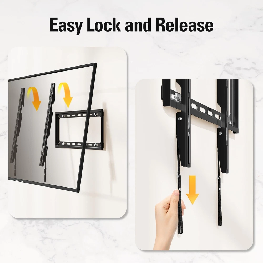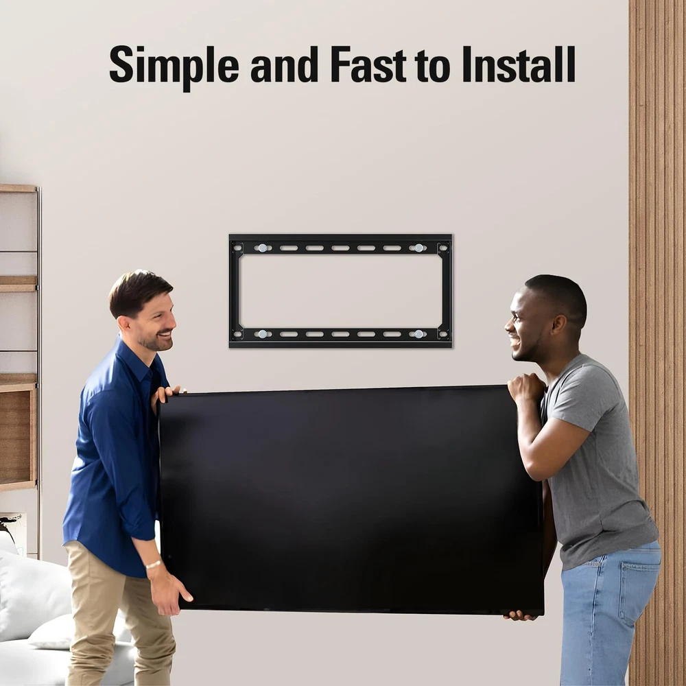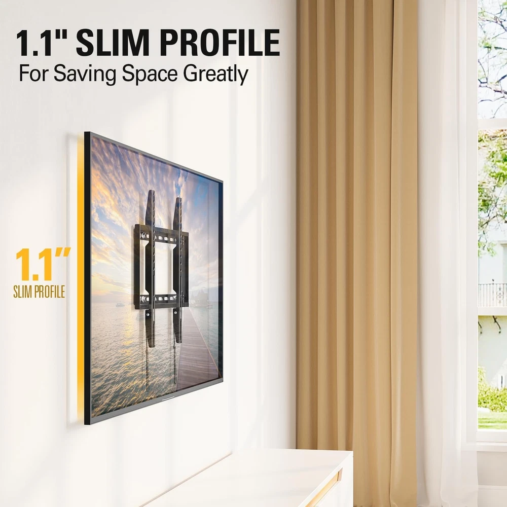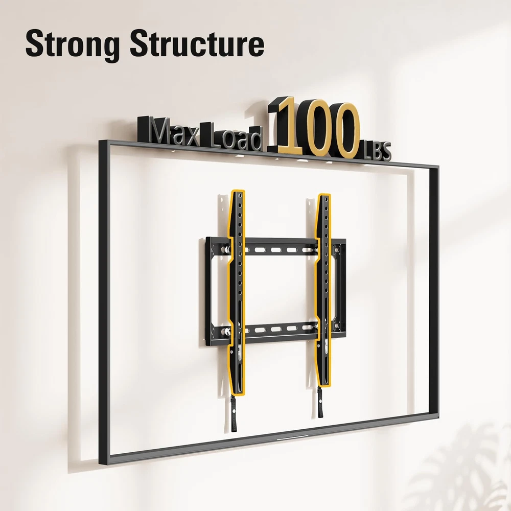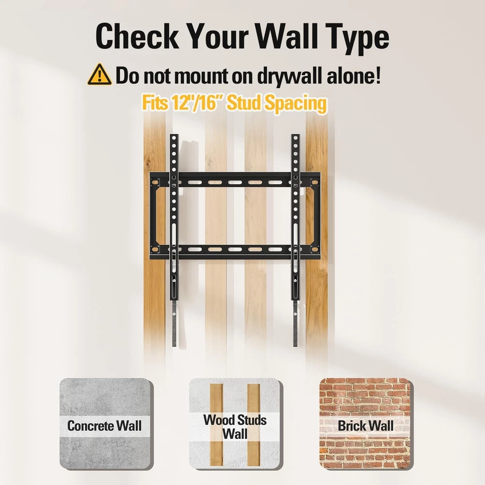 [ Universal TV Mount ] Fixed TV wall mount designed for most 26-60" flat screen or curved TVs up to 100 LBS. Basic TV mount working with TV/Monitor VESA from 75x75mm to 400x400mm, like general 26, 32, 42, 43, 50, 55, 60 inches Samsung/TCL/LG/Sony/Vizio/Insignia LCD, LED, OLED TVs. Flat TV mount bracket can be installed on 12”, 16'' spacing studs, or brick/concrete wall. Also ok to work as monitor mount. (Concrete anchors sent separately per request). Search MD2361-32 for 24”/32” stud spacing. [ Low Profile TV Wall Mount ] Narrow gap between this TV bracket and the wall, 1.1” in number, very much of an ultra slim TV mount. Flush TV mount saving space with super sleek look, blending TVs in with any décor. [ Heavy Duty TV Hanger ] TV mounting bracket with solidly one-piece wall plate, ok to hold TVs up to 100 LBS. Wall mount bracket for TV by advanced auto-welding robot, shaped without any potential human error. (Note: this TV Mount is NOT for drywall alone installation) Search MD2163-K for heavyweights, bigger version of MD2361-K flush wall mount. [ Easy Wall Mount ] Combined pre-labeled Hardware kit with clear instruction and bubble level, mounting TV brackets in less than 30 minutes. Classic pulling straps lock design for TV quick release or locking. Search MD2351 for an even easier one, a small TV mount. [Responsive Customer Service] Our US-based customer service experts are available 7 days/week. Welcome to ask them any issue of mounting bracket use and TV wall hanger installation. Please refer to detailed information on the product description to see if this TV wall mount fits your TV from the following aspects: VESA, studs spacing, and possible blocked input. Our TV mount is 10-year warranted!