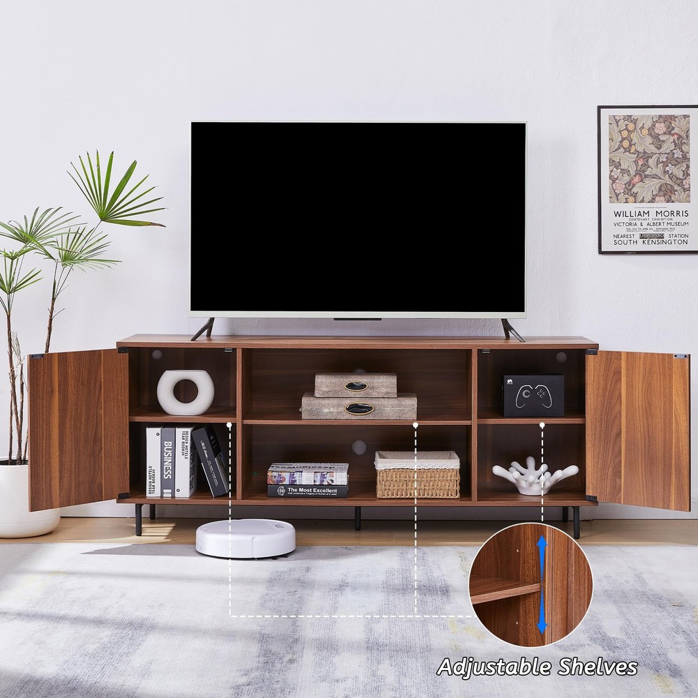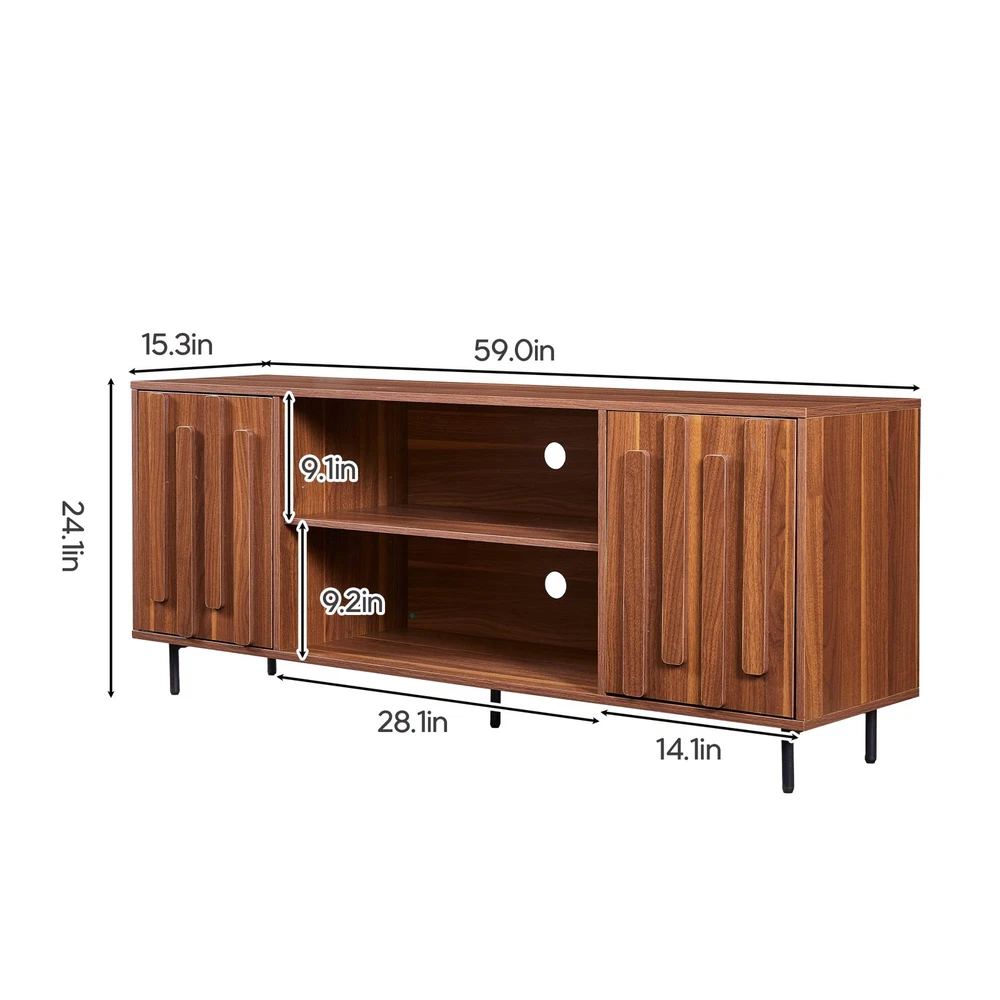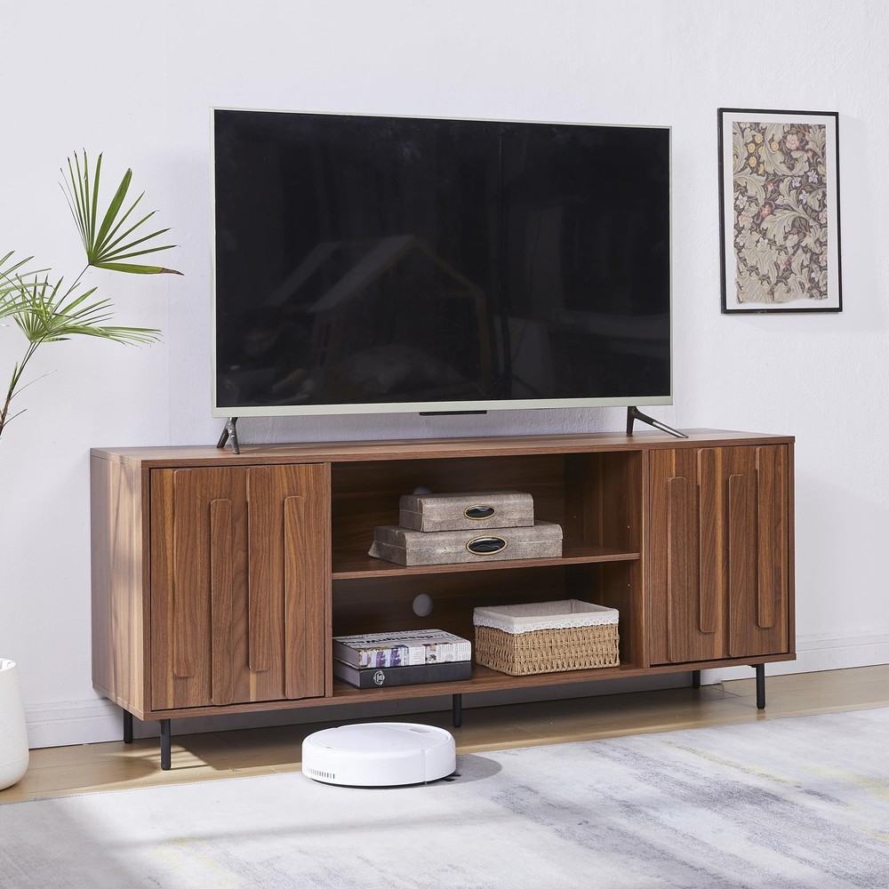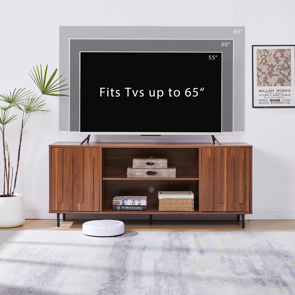 TV Stand for 65" 60" TVs, Mid-Century Modern TV Stands for Living Room, Fluted Entertainment Center with Storage Cabinet & Open Shelf, Wood TV Console Media Cabinet, Walnut About this item 1、【TV Stand for 32 to 65 Inch TVs】Measuring 59.0 x 15.3 x 24.1 inches, this modern TV stand is the perfect fit for TVs ranging from 32 to 65 inches, making it an ideal centerpiece for your living room, entertainment center, or home theater setup. Its versatile design complements any space, offering both functionality and style. 2、【Ample Storage Space】This wooden TV stand features two open shelves in the center for displaying home décor, gaming consoles, or streaming devices, along with two side cabinets with doors for concealed storage. The 3 height-adjustable shelf allows you to customize the height to accommodate items of different sizes. Keep your living room organized and clutter-free while maintaining easy access to your essentials. 3、【Raised Wood Trim Décor】Elevate your living room with this fluted TV media console. The retro walnut finish and wood-grain texture create a sophisticated look, while the three-dimensional raised wood trim on the TV cabinet doors adds a touch of artistic decor. The decorative wood strip that also functions as a handle. Perfect for those seeking mid-century modern furniture or farmhouse-style TV stands. 4、【Convenient Cable Management】Stay organized with the built-in cable management holes on the back, ensuring your cords remain tidy and out of sight. NO-handle doors designed, Raised Wood Trim functions also work as a handle maintains a sleek, modern appearance, making this media console both functional and stylish. 5、【Easy Assembly & Durable Construction】Full assembly is required, but the process is simplified with a graphic guide and labeled components. Each part is clearly marked for easy identification. Our customer support team is available to assist, and replacement parts are provided for any damaged or missing items. Built to last, this 59 inch TV cabinet can support up to 110 lbs on the top, 50 lbs in the cabinets, and 30 lbs on the shelves, ensuring durability and reliability. Product Description TV Stand for 65" 60" TVs, Mid-Century Modern TV Stands for Living Room, Fluted Entertainment Center with Storage Cabinet & Open Shelf, Wood TV Console Media Cabinet, Walnut On Oct 28, 2025 at 09:20:23 PDT, seller added the following information: On Feb 7, 2026 at 19:52:21 PST, seller added the following information: