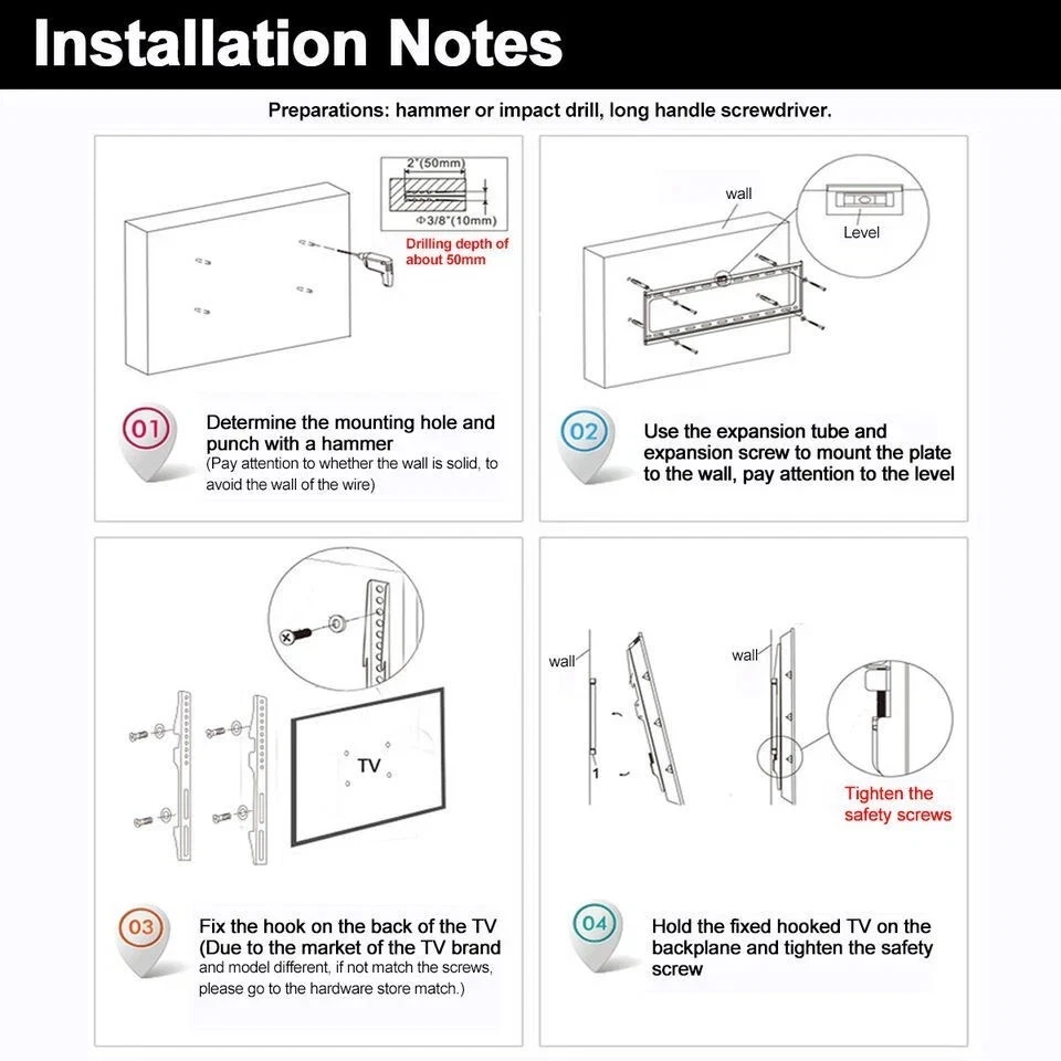 Maximum Screen Size Fitment: 80 in Color: Black Type: Wall Mount Maximum Weight Fitment: 165lbs Features: Saving Space MPN: Does Not Apply Country of Origin: China Brand: Unbranded VESA Hole Pattern: 100 x 100 mm, 200 x 200 mm, 50 x 50 mm, 600 x 400 mm, 75 x 75 mm