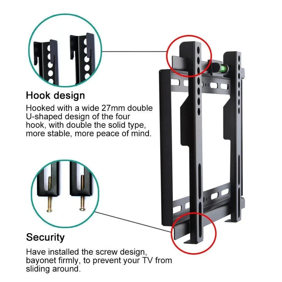 TV WALL MOUNT Fixed Full Motion BRACKET VESA 14 22 32 40 42 50 55 60 65 70 75 80 Description Features: Quick and easy to install - Bracket comes completely with full instructions and free fitting hardware kit. Spirit Level Bubble for ease of fitting and to be sure TV is level. Safety screw is used to avoid the movement of TVs after you hang it on the wall bracket. Compatible with 99% of brands including: Sony, Samsung, LG, Panasonic, Phillips, Toshiba, Sharp, Mitsubishi, Sanyo, JVC, Logik, Digihome, Technika etc. TV Size For 14 - 42" Wall Distance : 25mm Bubble Spirit Level : Yes Measured bearing : 30 KG ( 99LBS ) Spirit level & Safety screw : Included Vesa Size Fits : 200x200mm , 75x75mm TV Size For 26 - 63" Max load capacity: 50kg Suitable for VESA Size: Min : 200x200mm Max:400x400mm Bracket distance from the wall: 80-420mm TV Size For 32 - 80 " Suitable for VESA Size: Min : 100x100mm Max:600x400mm Max Load Capacity : 75Kg (170lb) Wall Profile: 22mm Material: Heavy duty reinforced steel Installation: Solid Wall Package Including : 1 x TV Wall Bracket Mount 1 x Standard Fitting Hardware Kit