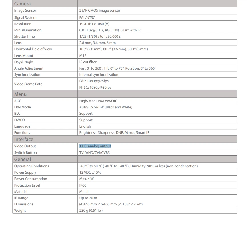 Features: Resolution: 1920 x 1080 (2 MP) Minimum illumination: 0.01 Lux@(F1.2, AGC ON), 0 Lux with IR Fixed lens: 2.8 mm 65 ft IR EXIR. Horizontal Field of View: 103° Switchable (TVI / AHD / CVI / CVBS ). Physical and Electrical Features : Operating temperature:-40 °F to 140 °F Power supply: 12 Vdc / 4 Watts. Application: Indoor/ Outdoor IP66. Material: Metal Dimensions: 85.4 x 76.12 mm Weight: 0.51 lb Warranty: 5 years.