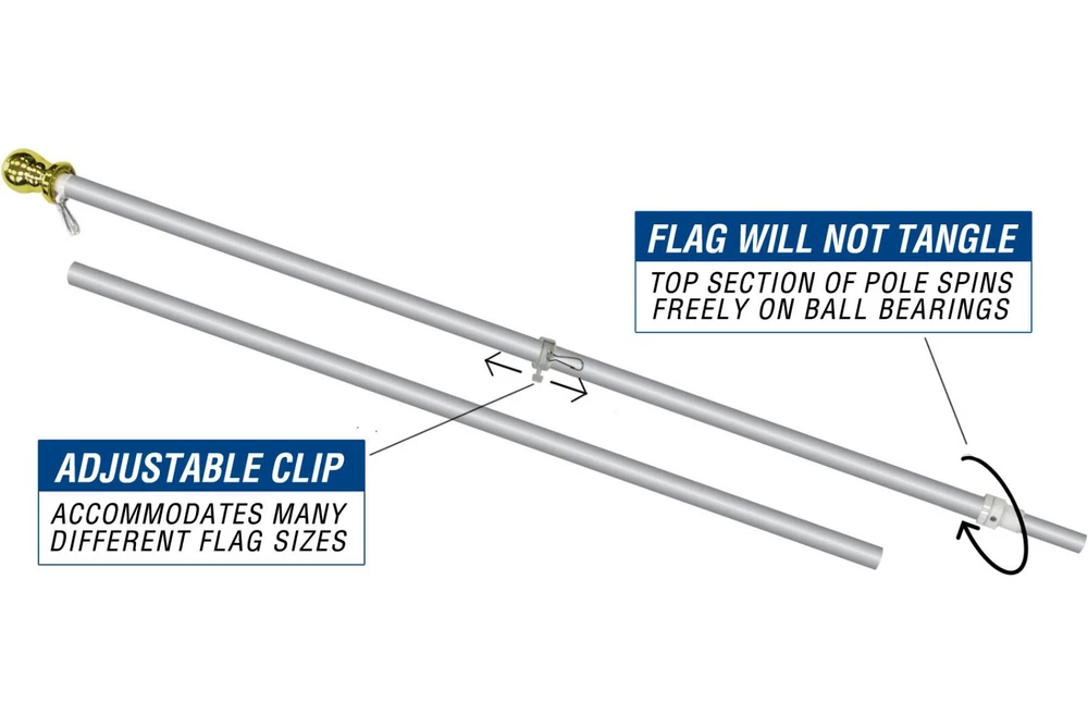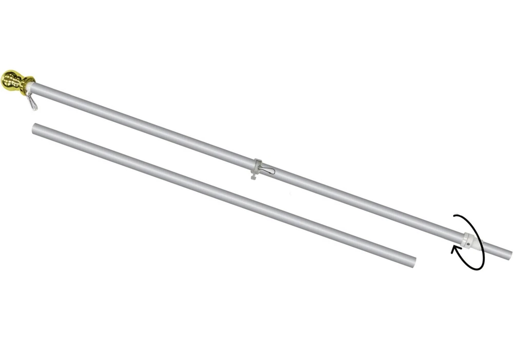 Section Aluminum Spinning Stabilizer Pole is 6 feet long with a 1-inch diameter and gold ball top and silver finish. These poles were upgraded from our previous model for strength and durability. they now include a mid-section ball joint so that the pole spins freely, and the flag never tangles. These Poles are for Wall mounting Only -- NOT for Flag Bases. Flag and mounting bracket sold separately.