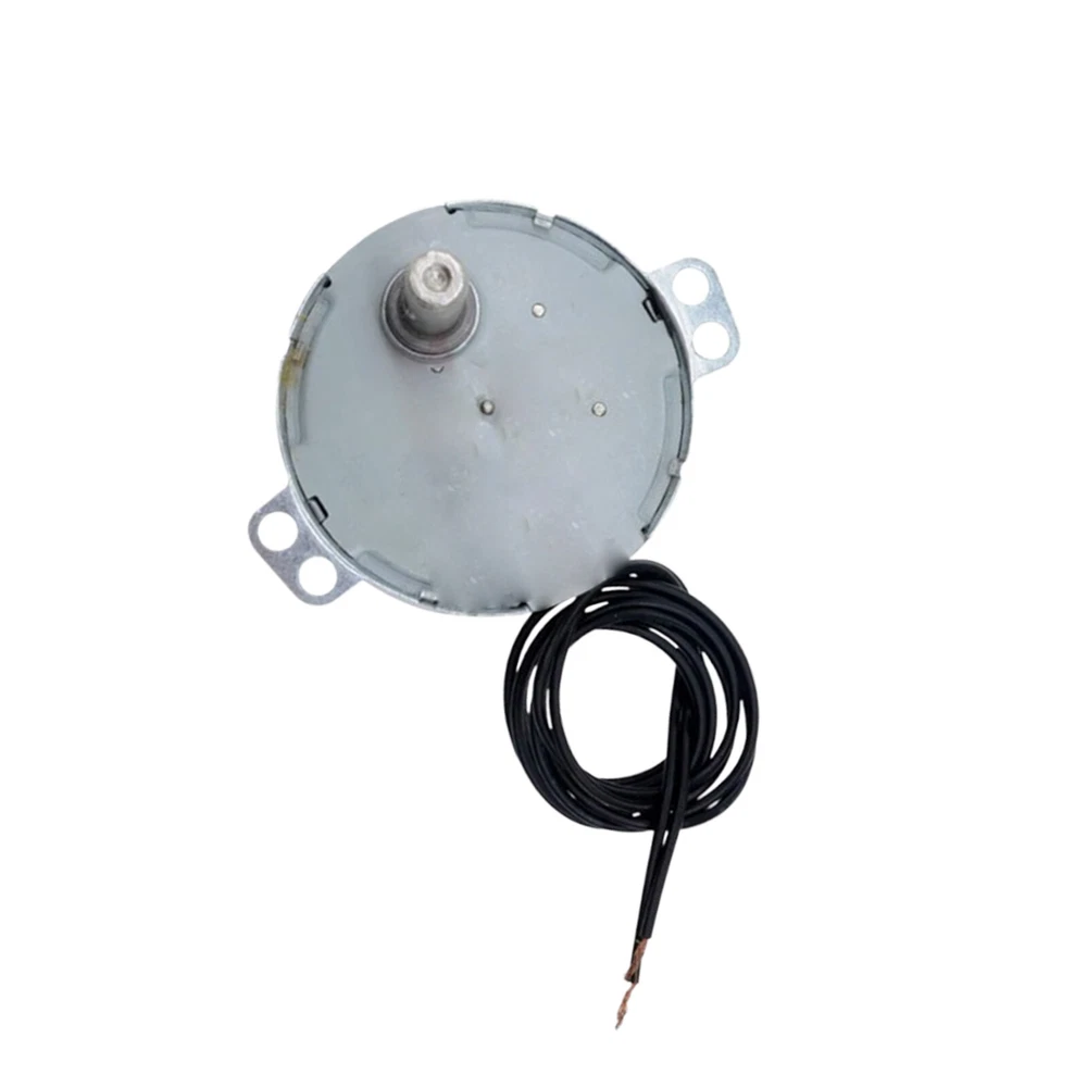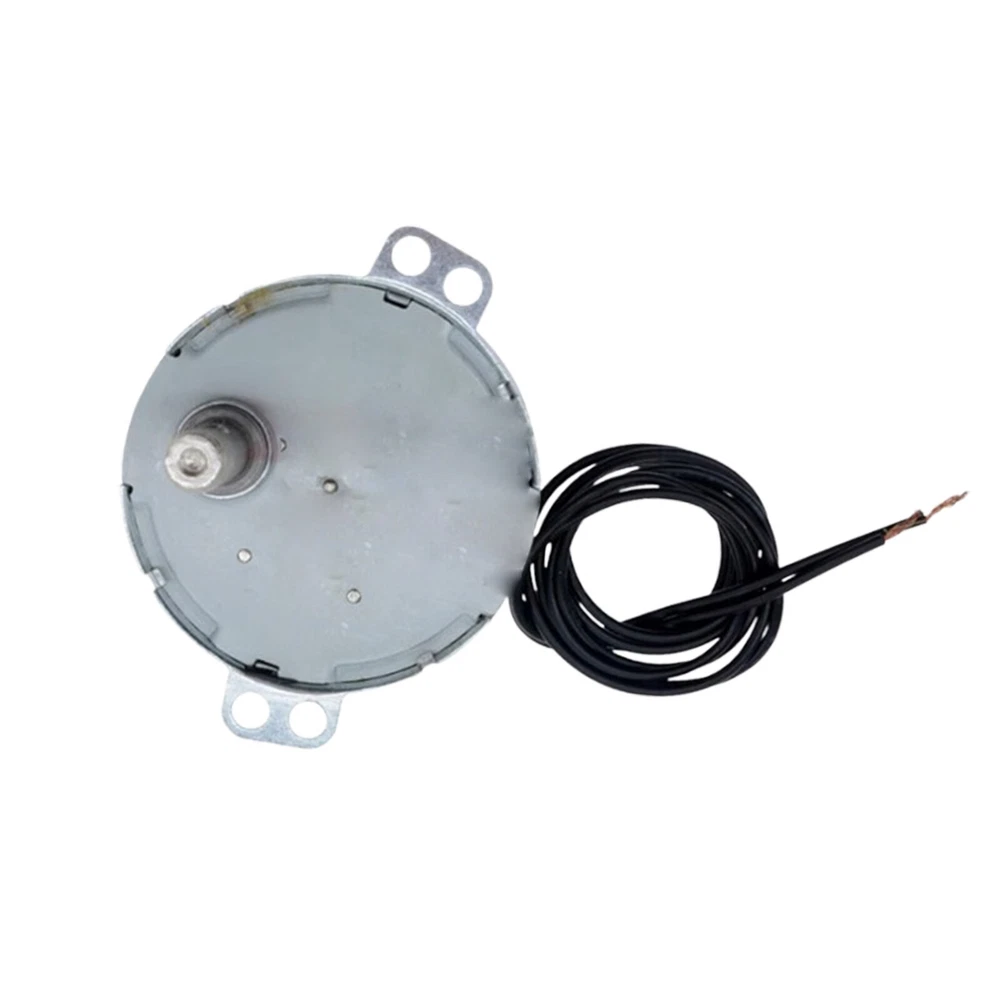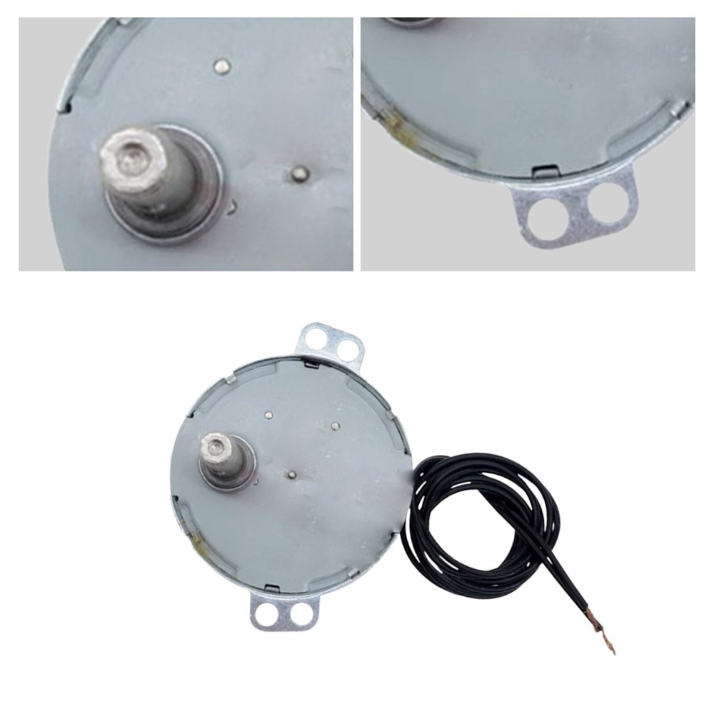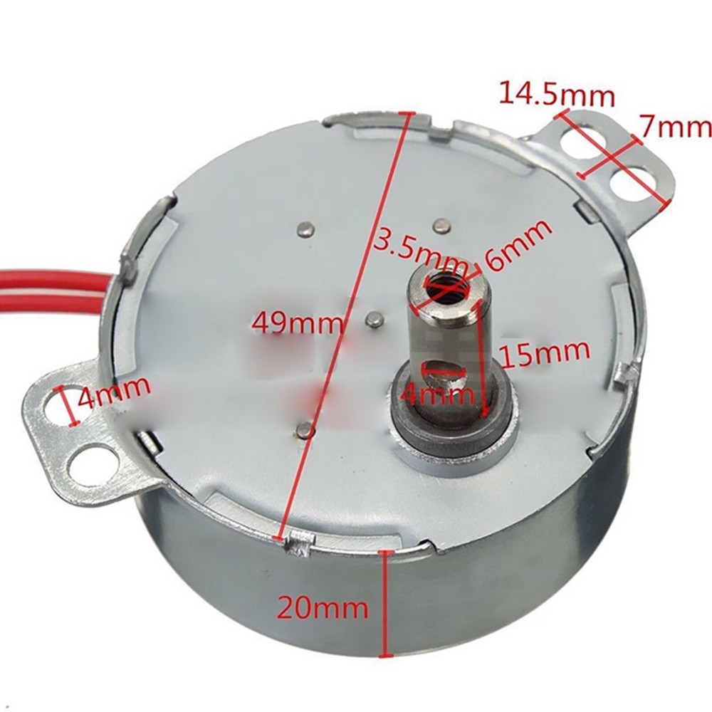 Description It is mainly used for Christmas tree, air conditioner, electric fan, microwave oven, heater, turntable, and anything else you want. Specification Rated Voltage: AC 220-240V Power: 4W Manner of Working: CW/CCW Rated Frequency: 50-60Hz Rated Speed: 4-5RPM Torque: 6 kgf.cm Body Diameter: 50mm/ 1.96 inch Body Height: 20mm/ 0.78 inch Total Length: 65mm/ 2.55 inch Mounting Hole Diameter: 4.5mm/ 0.17 inch Shaft Diameter: 7mm/ 0.28 inch Shaft Length: 16mm/ 0.63 inch Wire Length: 40cm/ 15.7 inch Package: 1 x AC Synchronous Motor
