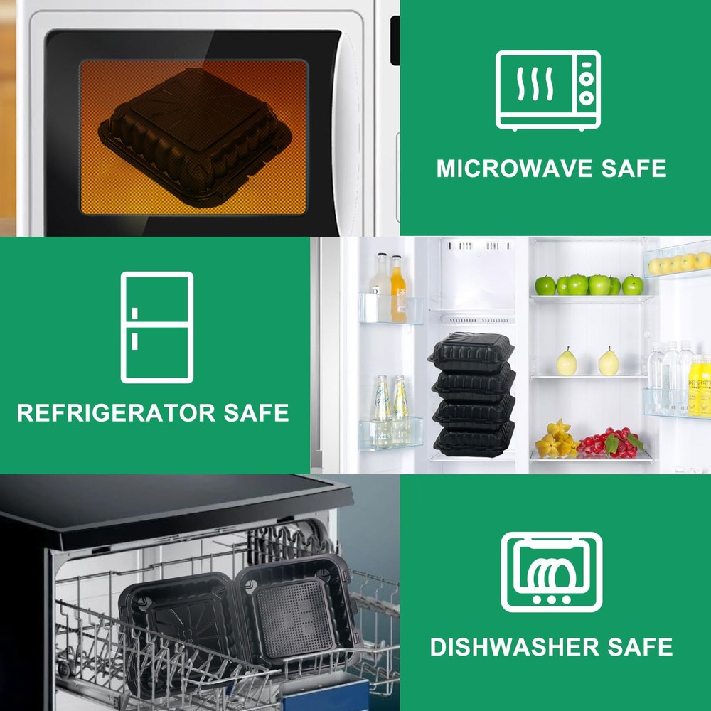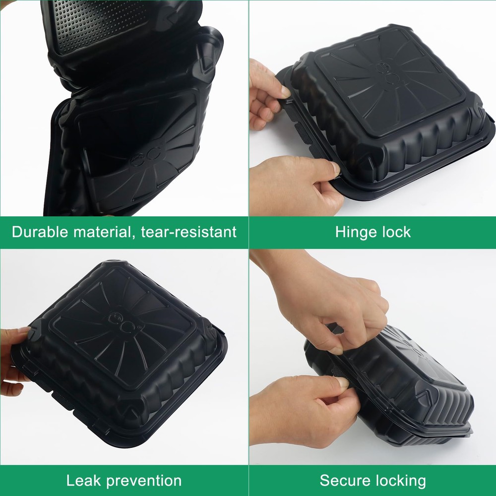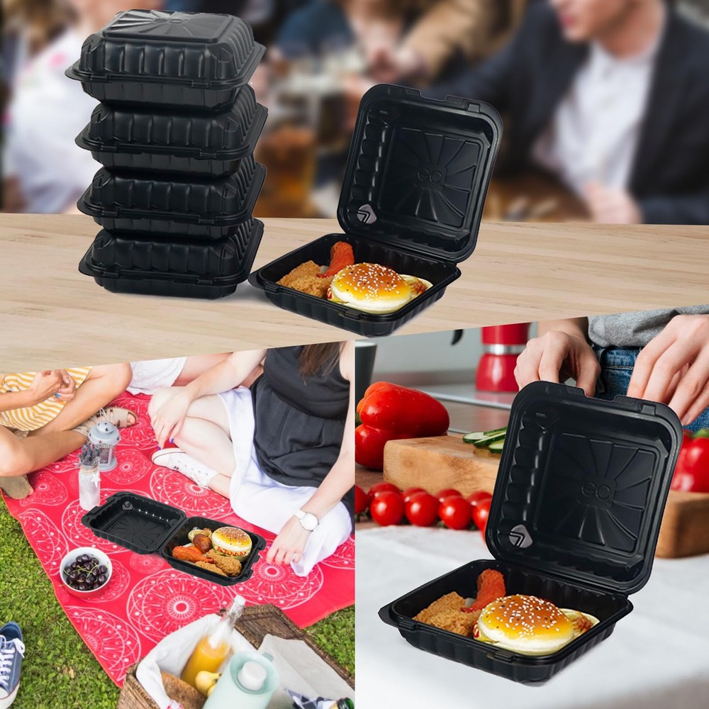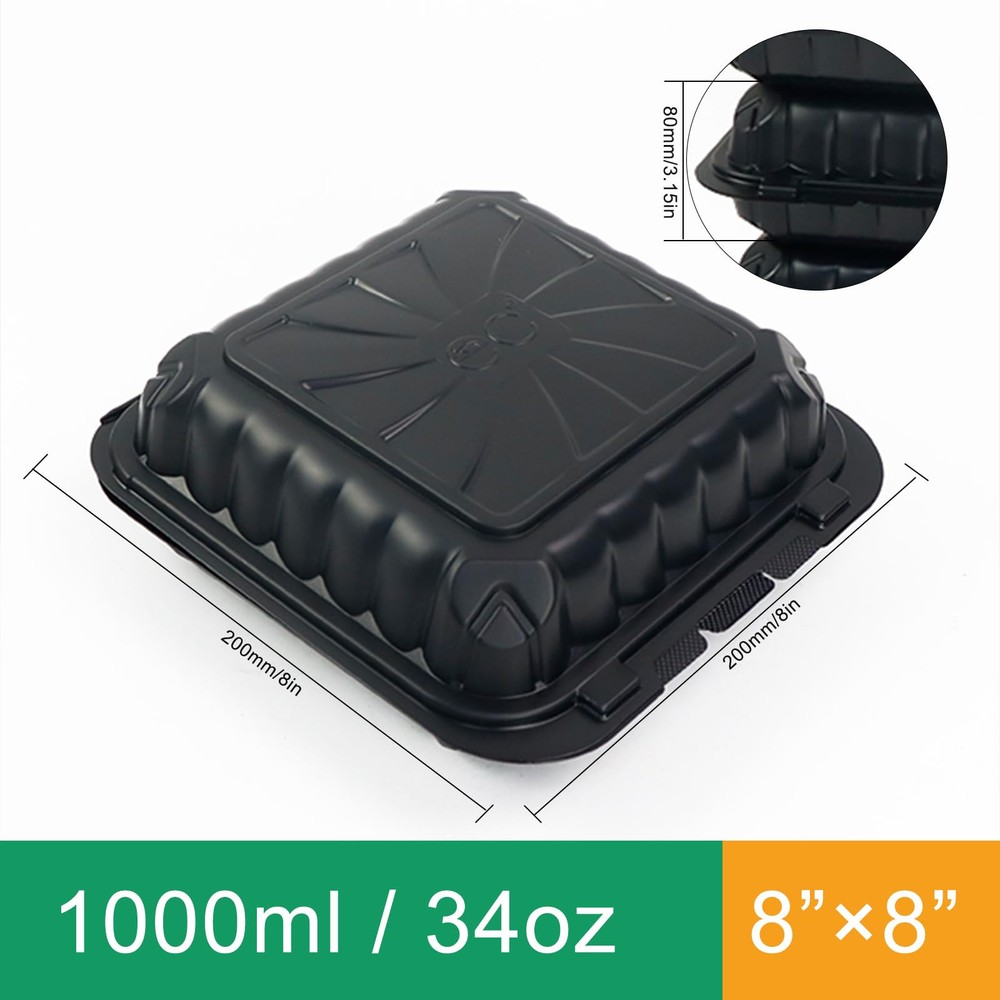 Premium Quality Black Clamshell Take Out food Container: our to go food storage containers are made of food-grade PP material, microwave and refrigerator safe, use for meal prep,food storage,takeout, picnics etc. square lunch box have no taste.The snap lid is sturdy requiring force to open, safe and secure take out containers ensure food freshness and prevent spills are perfect mobile food containers for families, bakeries and people at work HOME PORTABLE: disposable food containers with lids are tronger and more durable than traditional cardboard and foam packing,meal prep containers for restaurants and kitchen first choose, bar lock function provides a tight seal, food containers can be stacked and arranged for easy portability and transportation. Come and experience the convenience of our ready-to-use containers with lids Convenient Size: set of 50 food trays for party thanksgiving leftovers to take away,8*8*3.2 inches 34 oz large capacity containers are designed for easy portion control and quick cleanup MULTIPURPOSE: versatile and sturdy container not easy to break in long-term use. Suitable for storing a variety of foods, cakes, desserts, fruits, cookies, chocolates, breads, burgers, sandwiches, pasta, donuts, salad or other foods Tip: Our to go boxes can be used at 120 degrees Celsius. Please pay attention to the temperature of the box after microwaving to avoid burns