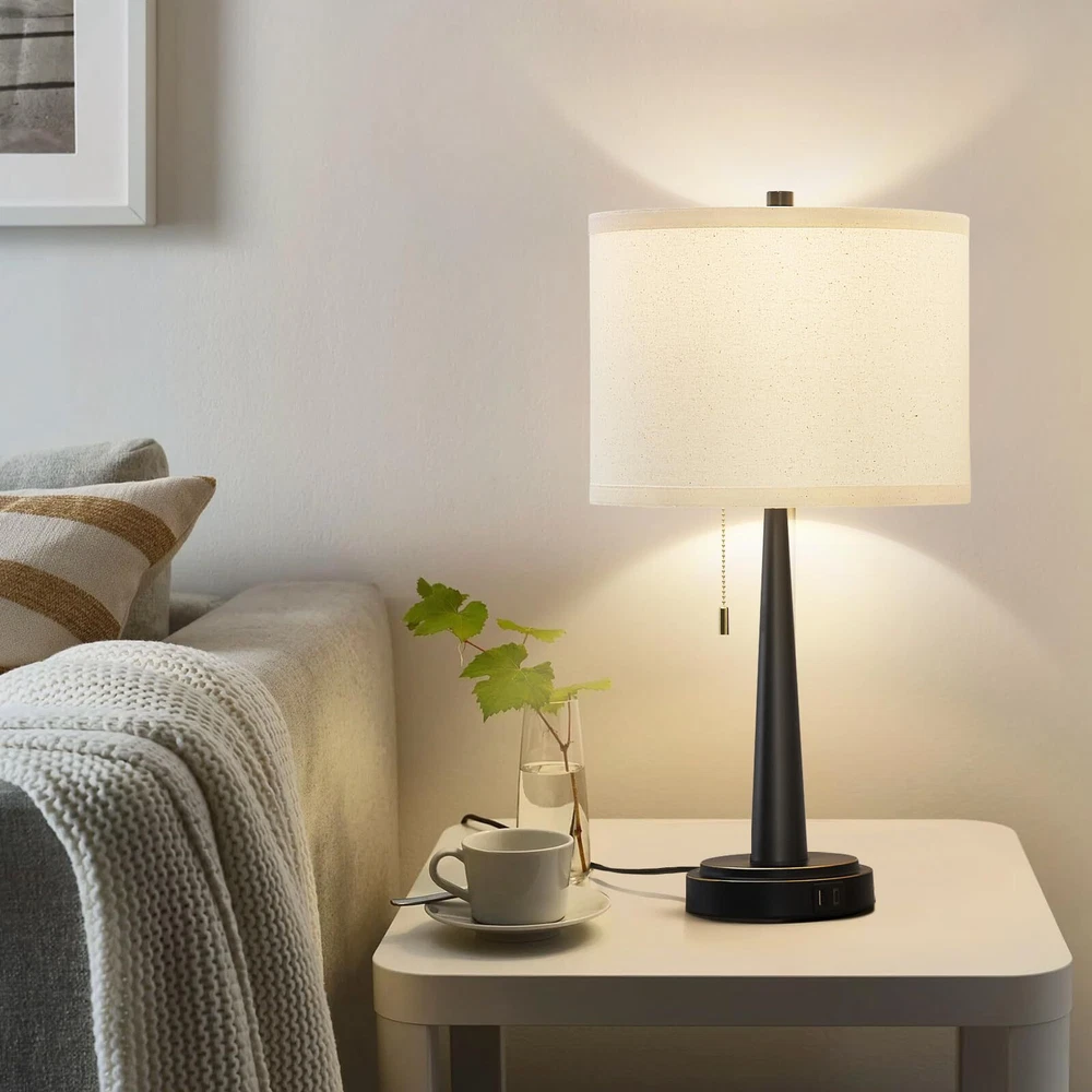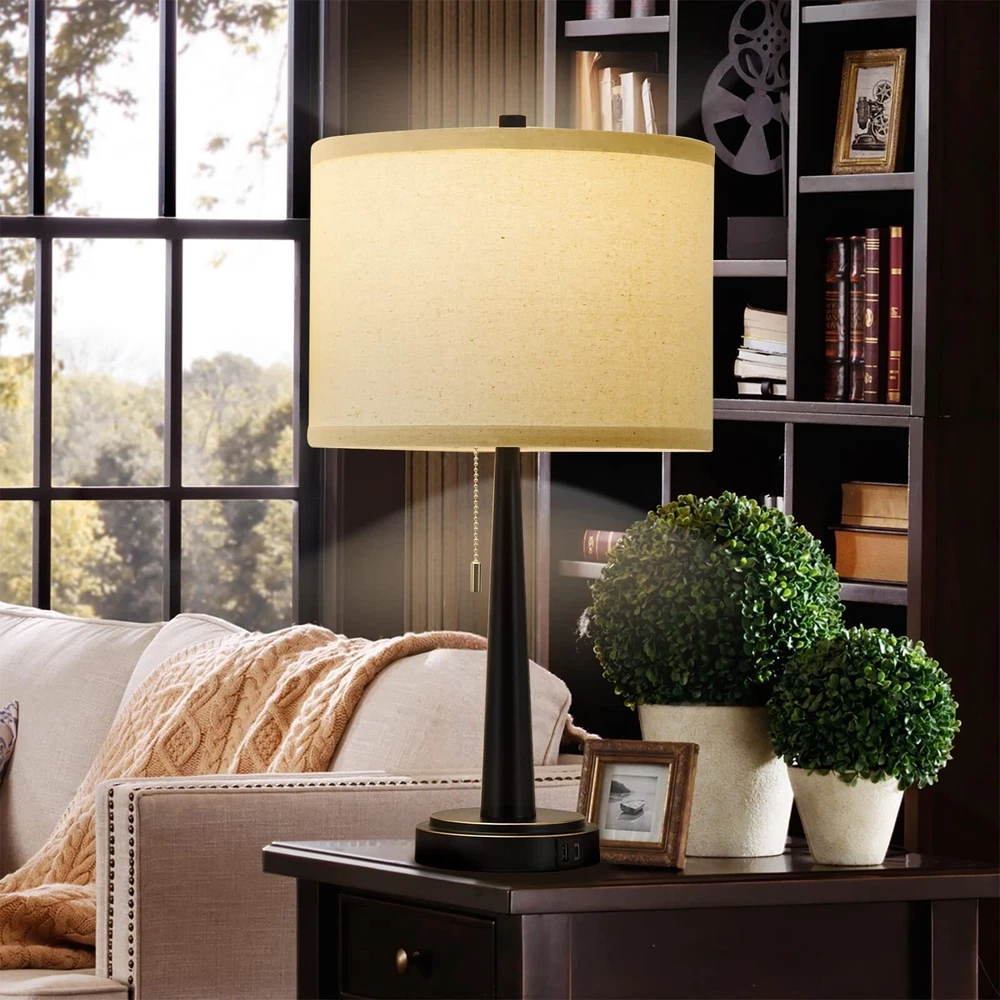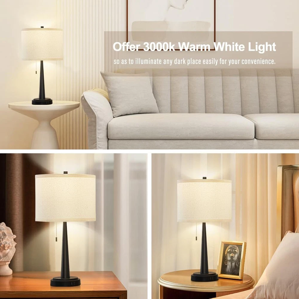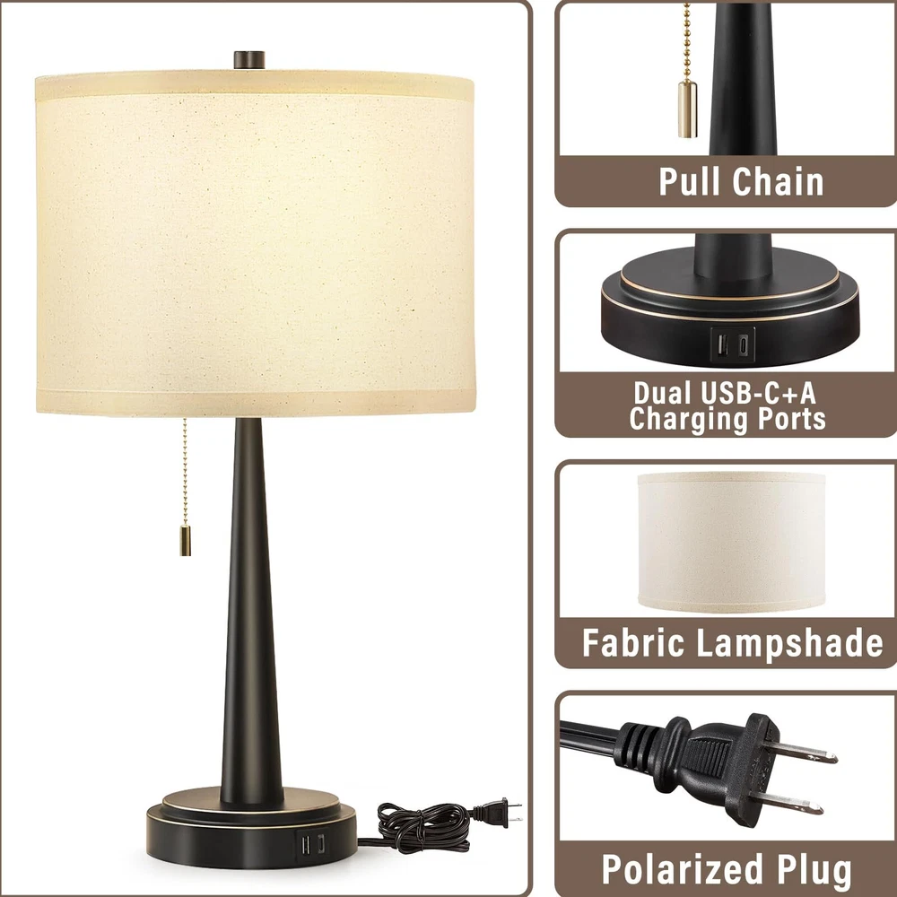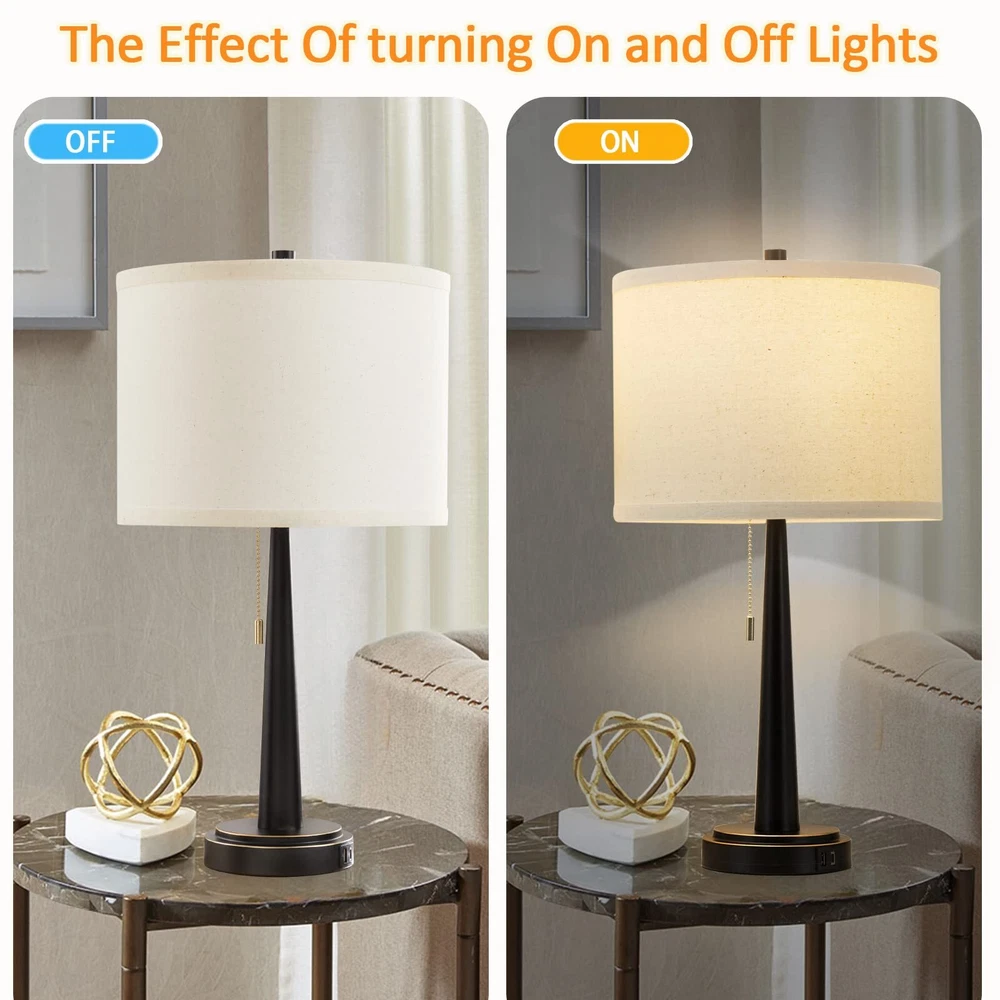 【With USB-C+A Convenient Charging Ports】This modern bedside lamps have USB-C+A charging ports, support 5V/2.1A USB charging. When you come back home or office, you can take easy to charge your phone, kindle, tablet and other electronic devices, meet your more electrical device charging needs. As long as the table lamp is plugged in,the USB port can function whether the lamp is on or off. 【LED A19 Bulbs Included】 Two A19 LED bulbs are packed with this bedside table lamp for your convenience. No more need to suffer endless comparison and hesitation to decide which bulb to buy. Compare with incandescent bulb, non-glare and non-flickering, saving up to 90% electric bill while emitting sufficient glow to illuminate a room. 【Offer 3000k Warm White Light】We offer a 3000K warm white LED, which won't burn out and its' service life up to 50,000 hours, so as to illuminate any dark place easily for your convenience. Whether you want to read, write or simply relax, the standing lamp provides ample illumination without straining the eyes. Ideal for your reading, working and relaxing. 【Minimalist Design & Eye-protection】High quality metal materials and clever cone design of these nightstand lamps no tipping and hold steadily without shaking. Designed with the vintage minimalist concept, which goes well with any style of your house. Particular design black metal body and beige lampshade make this table lamps look modern and classic, which can effectively relieve eye fatigue and protect the eyesight. 【Shop Your Lamp Anytime】 If there is any damage caused by transportation, or if you have any question or problem about this table lamp, or you just don't like it, please contact us anytime through Amazon message and we will get back to you within 24 hours.