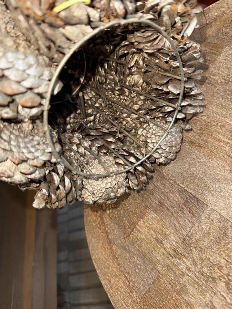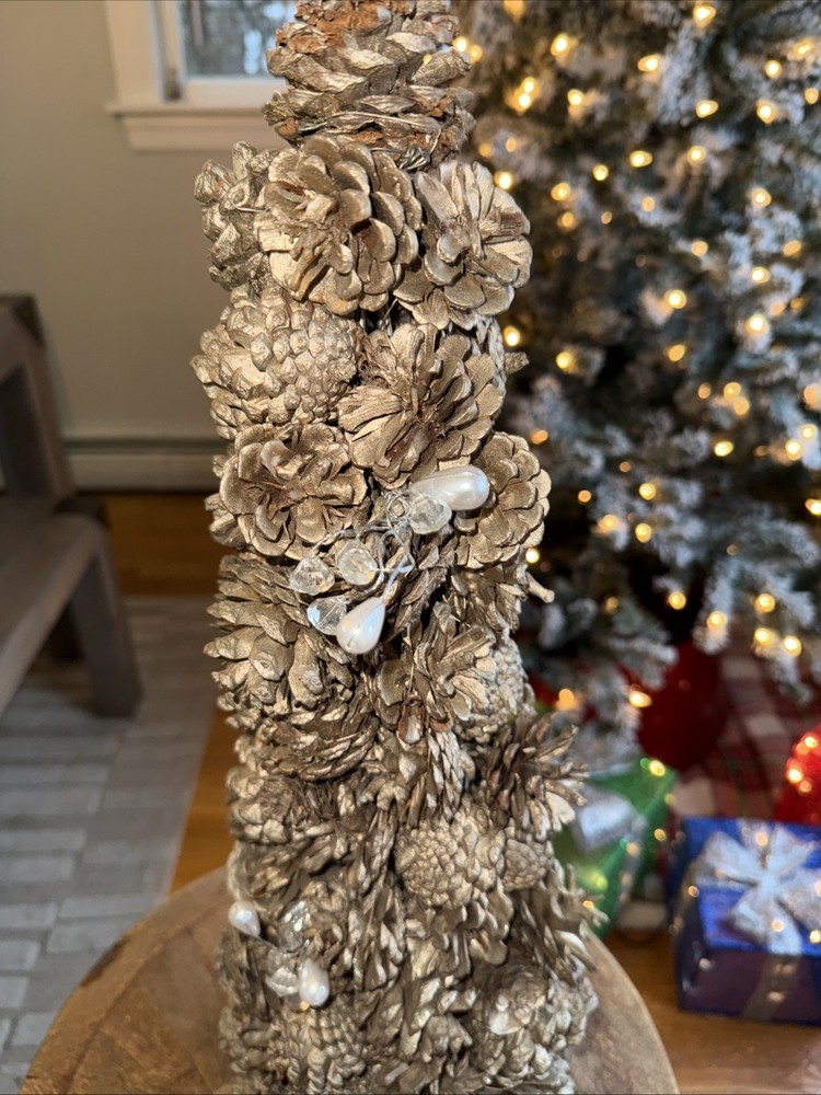 The Table Top Natural Gold PINE CONE TREE is a stylish and contemporary piece of holiday decor perfect for teens and adults alike. This free-standing pine cone tree features a flocked glitter snow finish, adding a touch of winter magic to your home. With a brown color scheme and made of wine, glitter, and pine cones, this unique piece captures the essence of the holidays and the festive spirit of Christmas. Standing at 11.75 inches tall and 5.5 inches in length, this elegant pine cone tree is sure to be a standout decoration in your holiday celebrations.