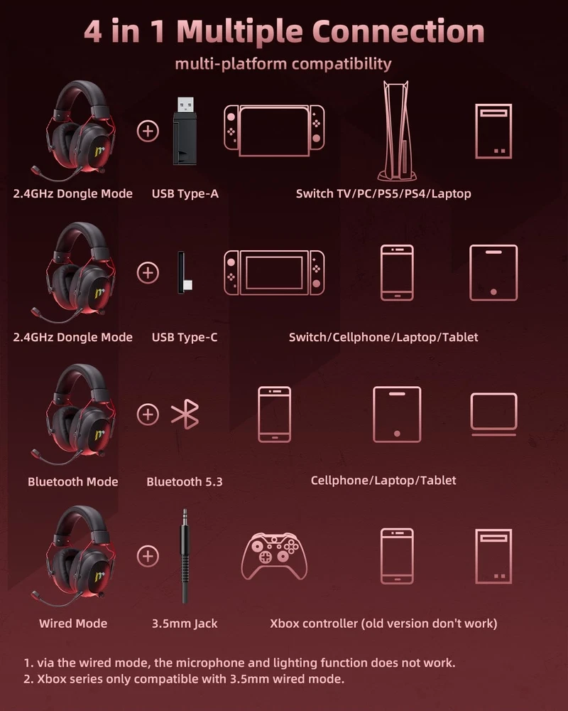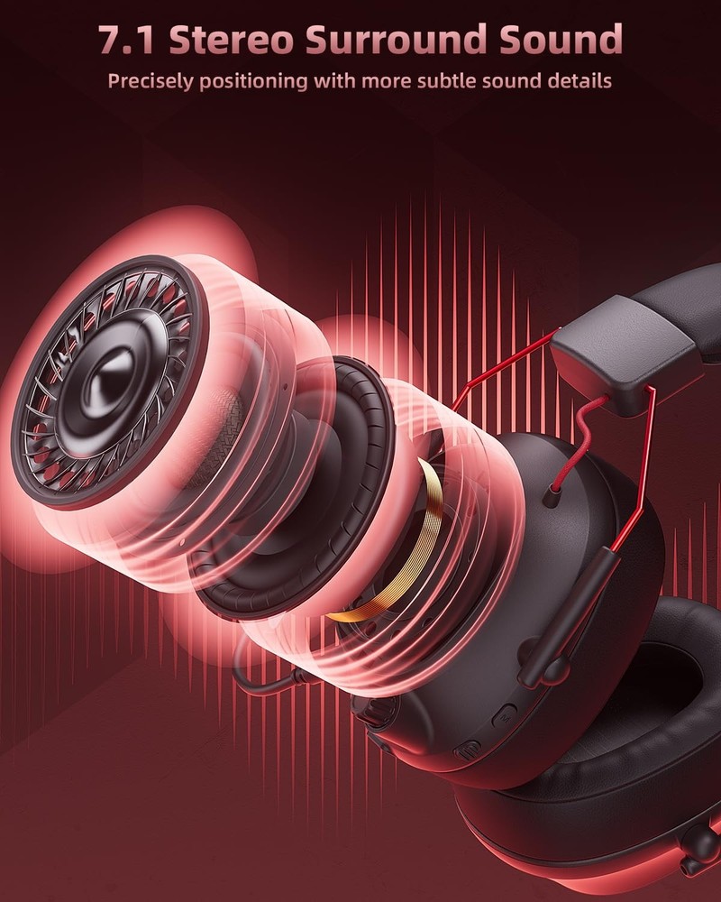 Wireless Gaming Headset with Noise Canceling Microphone 【Experience Stable Connection & Superior Sound】The Tac Master wireless gaming headset leverages high-performance 2.4GHz lossless wireless technology, offering a stable connection up to 50 feet in open spaces. With a low latency of ≤20ms, and a 50mm driver enhanced by 30% extra sound effect. This headset delivers high-quality stereo sound. You'll be able to clearly hear direction cues, footsteps, and every minor detail in your games, making for a more immersive gaming experience. 【Unleash Broad Compatibility】The Tac Master Gaming headset, equipped with a 2.4GHz USB dongle & Type C Transmitter, Bluetooth 5.3, and a 3.5mm jack cable, offers effortless connectivity to a diverse array of gaming devices. The 2.4G USB dongle offers plug-and-play convenience for PC, PS4/PS5, and Switch Docked Mode. Simultaneously, the 3.5mm jack delivers superior performance with XBOX, game console controllers, or phone/tablet devices. This gaming headset ensures a smooth transition between ARPG, FPS, and other gaming genres, enhancing your gaming experience. 【Detachable Elite Noise-Cancelling Mic】 Our wireless PS5 headset features a detachable, flexible, and omni-directional microphone that delivers top-notch noise cancellation. This feature allows for adjustable angles, ensuring crystal-clear communication with your teammates through this Bluetooth gaming headset. It enhances the clarity of your commands, maintaining high-definition communication even in the heat of battle. This isn't just a headset, it's your ultimate gaming ally. 【 Long-lasting Battery Life & Ergonomic Design】Enjoy up to 48 hours of uninterrupted battery life, Full-recharge in just 3 Hrs. The ear cups and headband are made of premium protein leather. They have soft ear pads and a comfy head wrap design. Plus, the adjustable headband fits all head shapes. This makes them super comfortable for long gaming or music sessions. 【Dynamic RGB Light Design】The Gaming Headphones come with an awesome RGB light strip feature. Once you plug it into the USB port, the LED lights dynamically sync with your game, creating a vibrant, eye-catching halo effect. This soft RGB lighting isn't just stylish, it's a fantastic addition for video recording and live broadcasting.